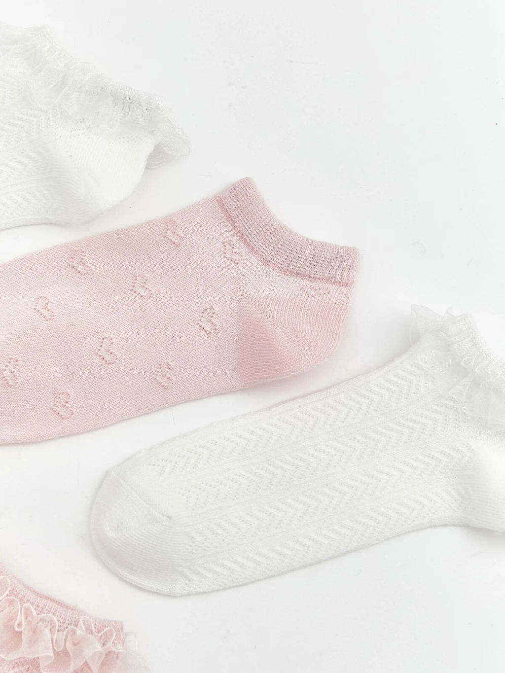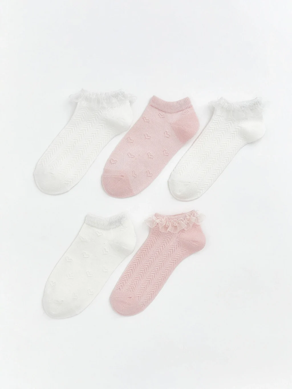 Kalp ve geometrik desenli modellerden oluşan kız çocuk patik çorap seti, bilek kısmında fırfır detayına sahiptir.