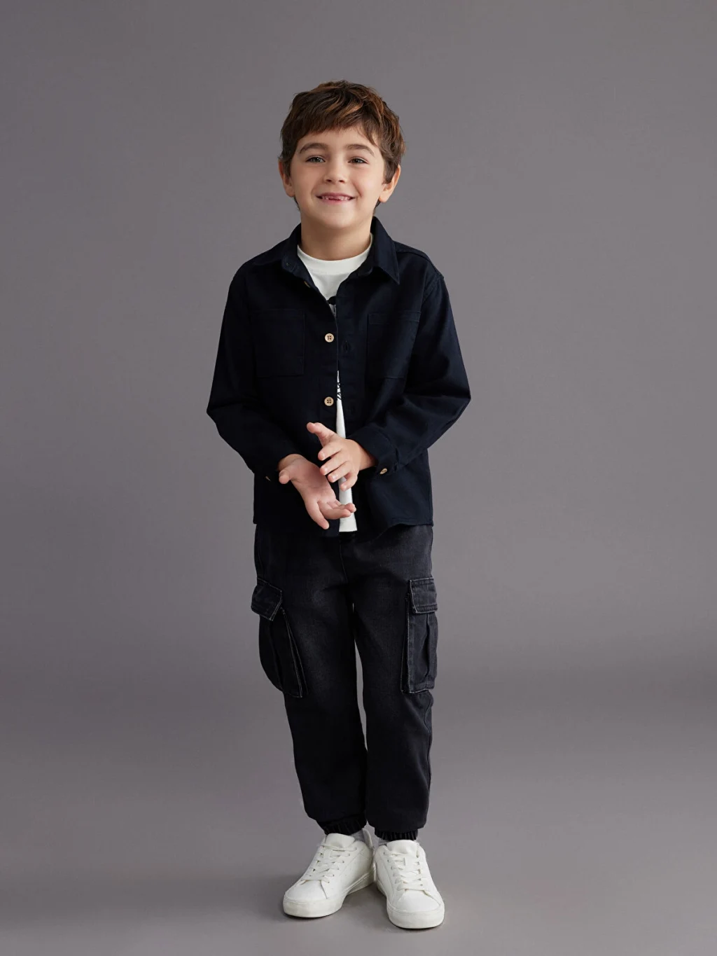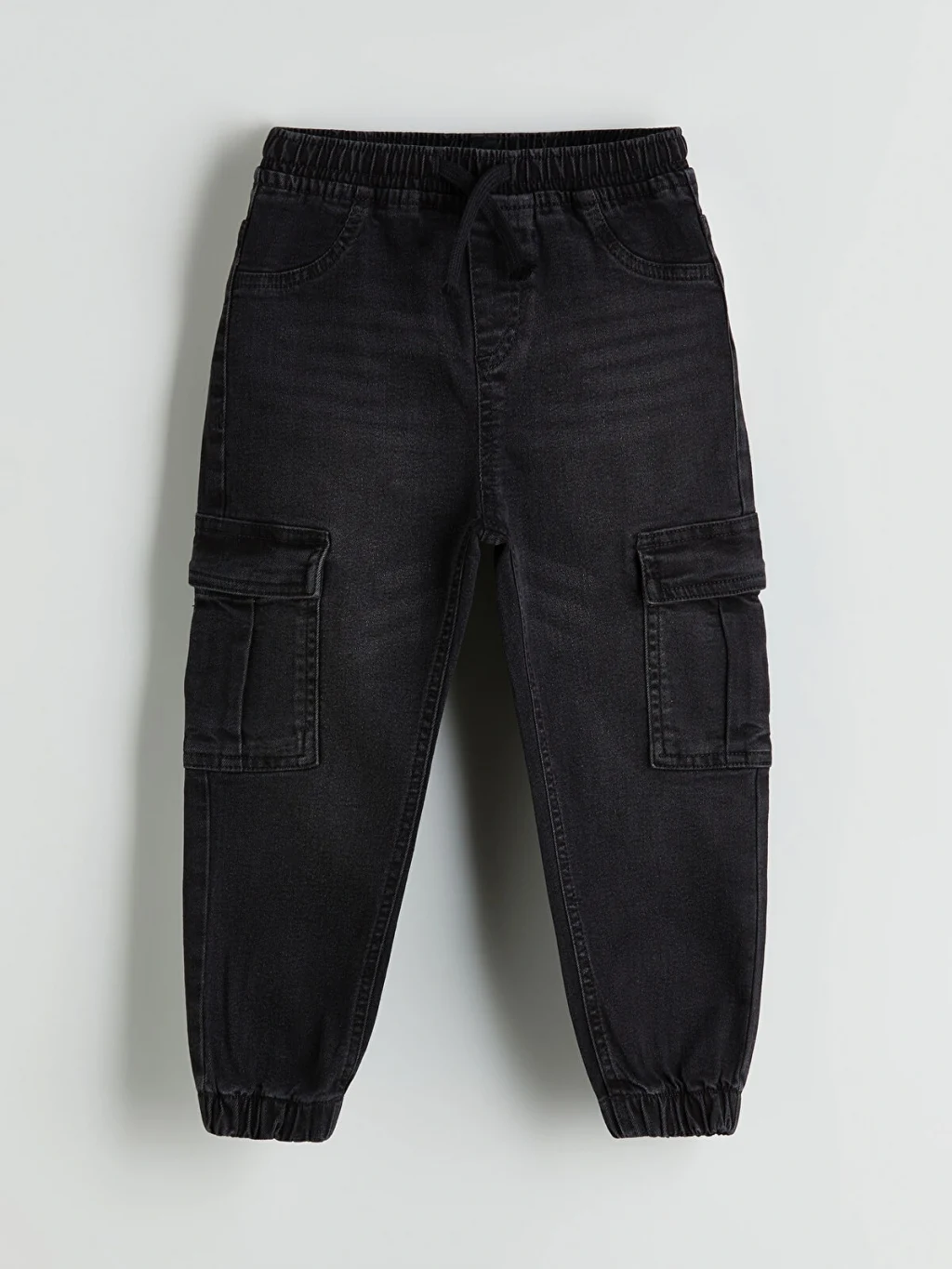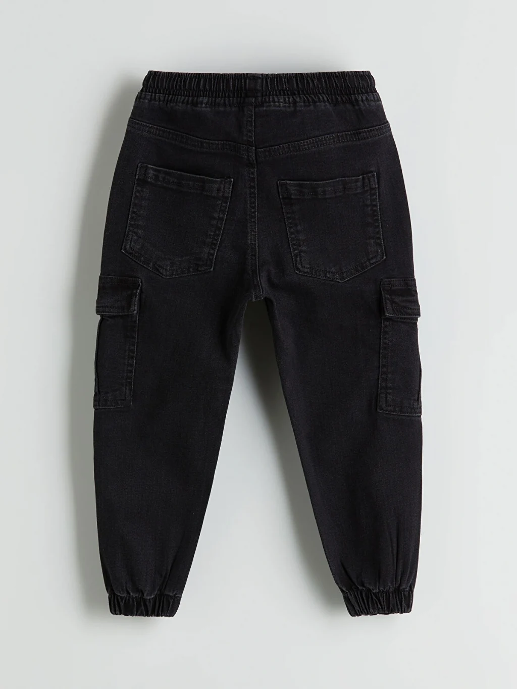Beli ve paçası lastikli erkek çocuk jogger kargo jean pantolon, rahat kesimi ve yan cepleriyle fonksiyonel bir tasarıma sahiptir.