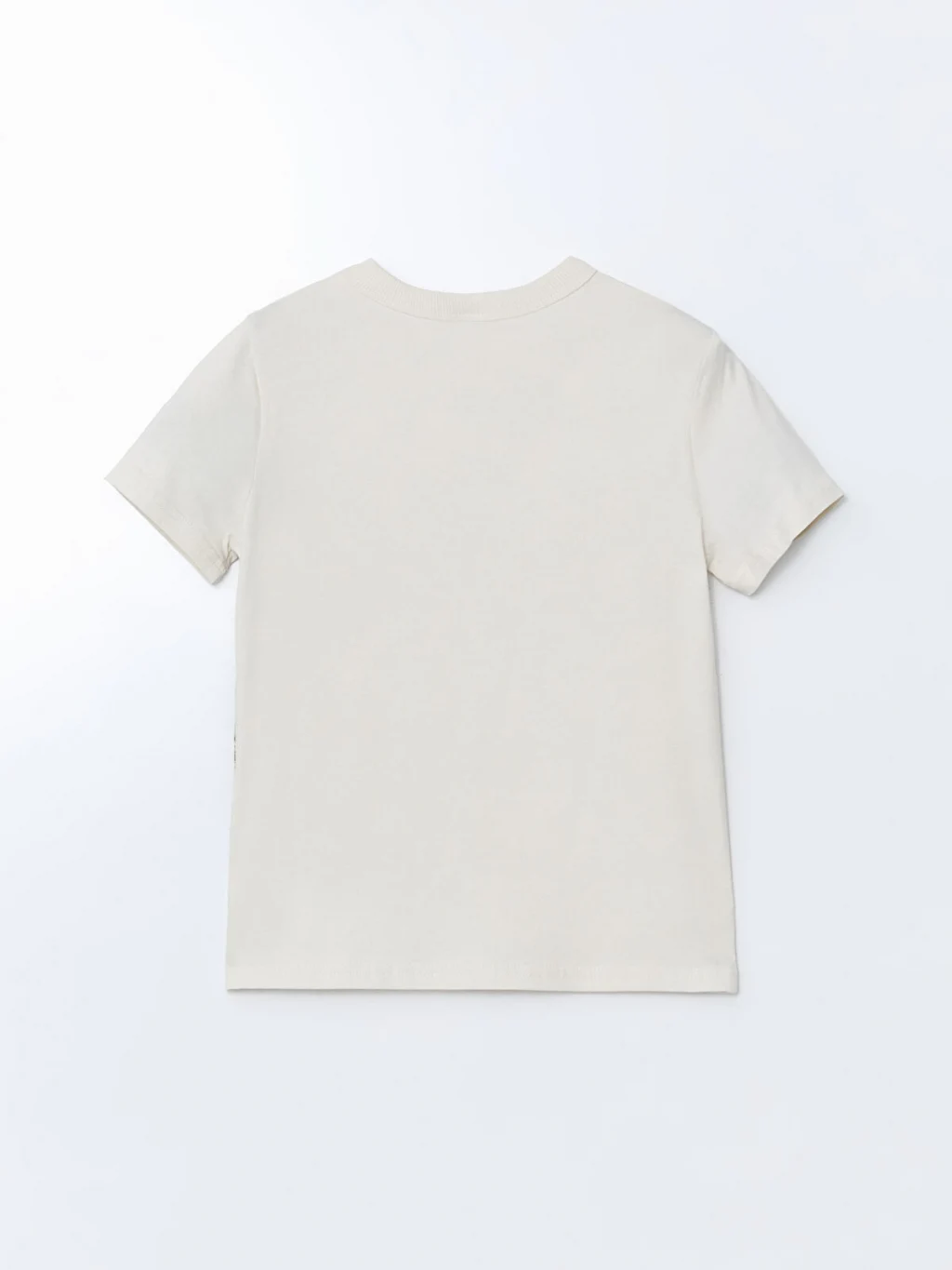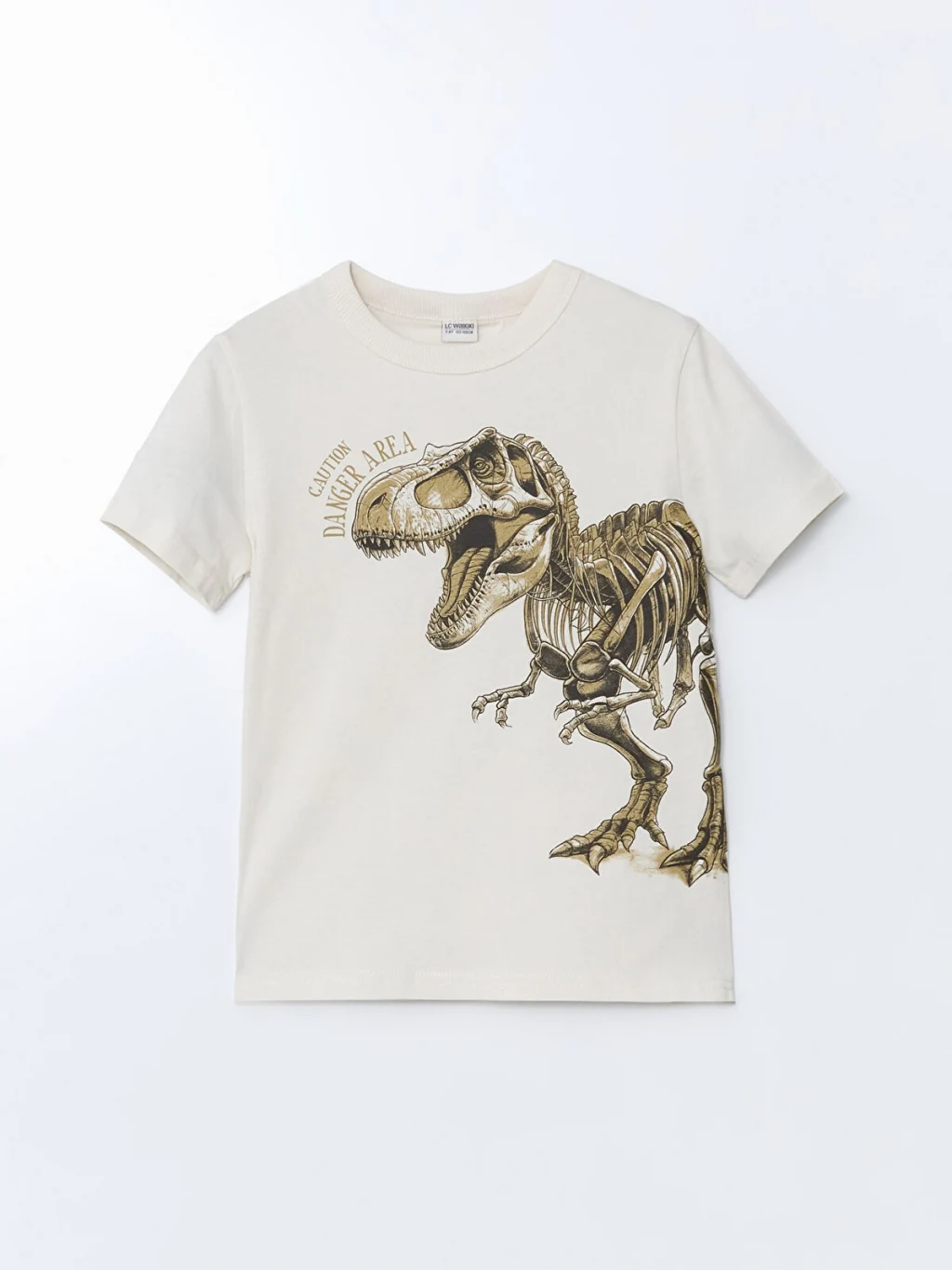 Bisiklet yaka, kısa kollu erkek çocuk tişört, %100 pamuklu penye kumaştan üretilmiştir ve ön yüzünde dinozor iskeleti baskısı yer alır.