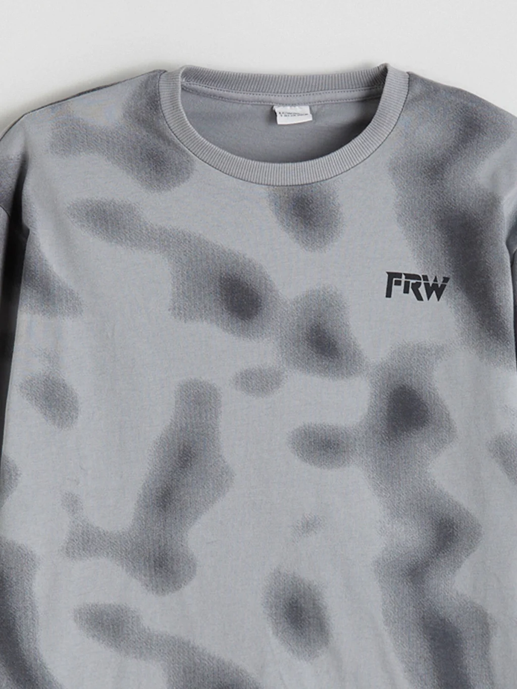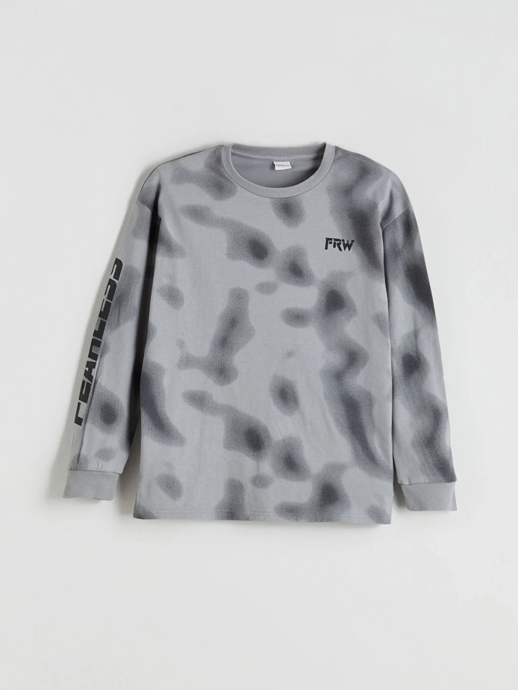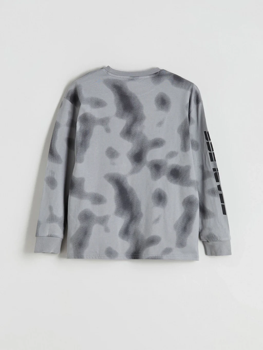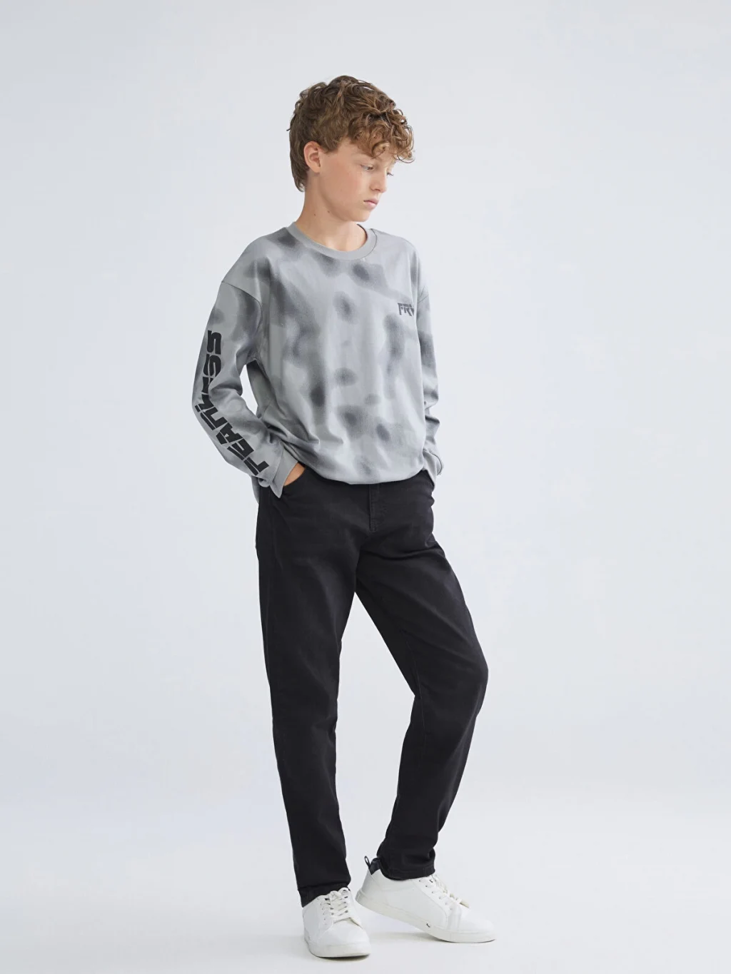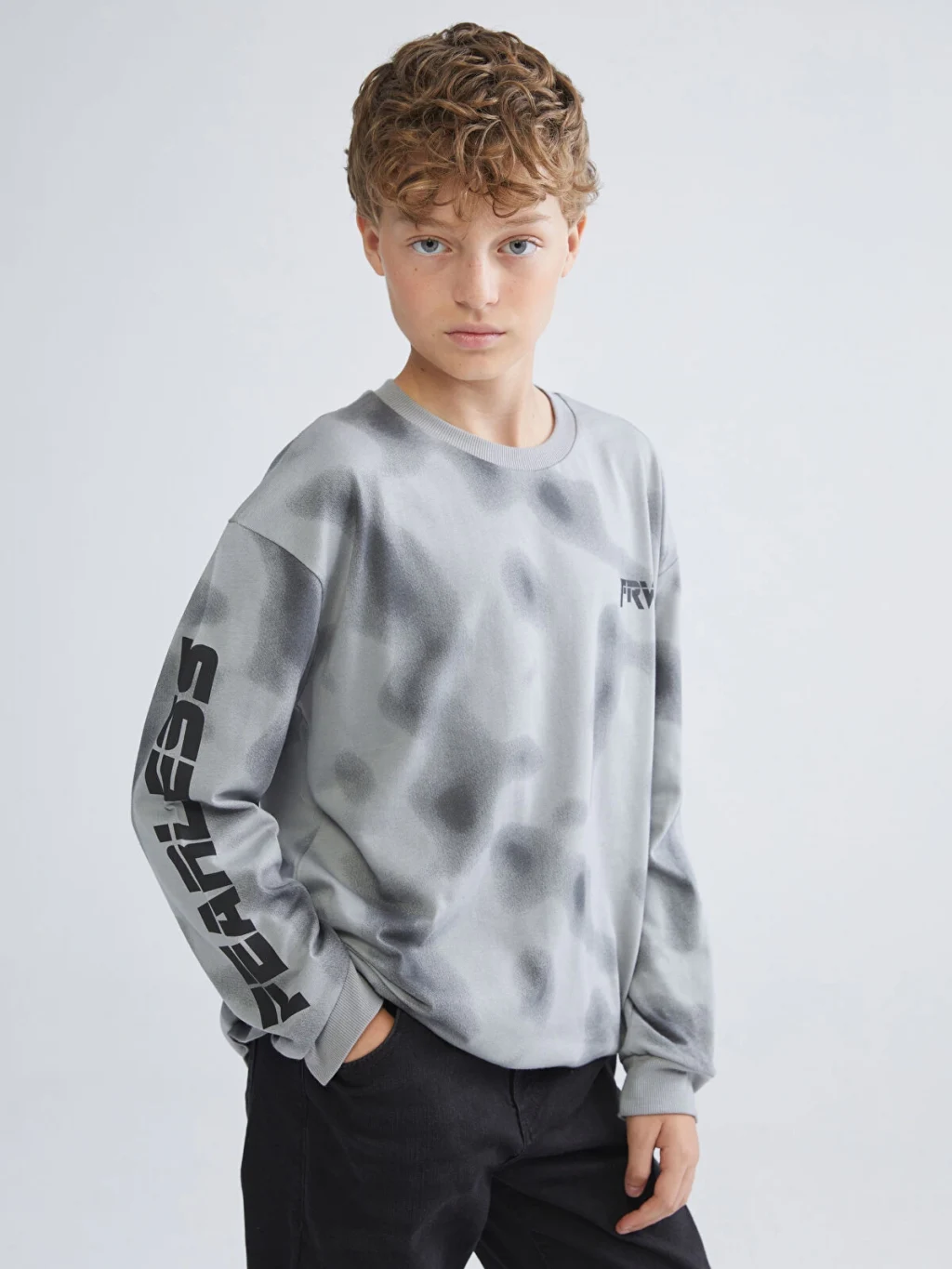 Bisiklet yaka, uzun kollu erkek çocuk tişört, bol kalıplı ve penye kumaşlıdır. Desenli yüzeyi üzerinde kol ve göğüs baskıları yer alır.