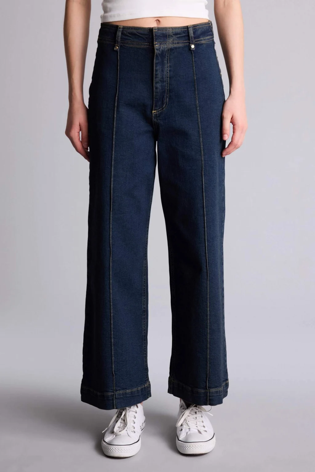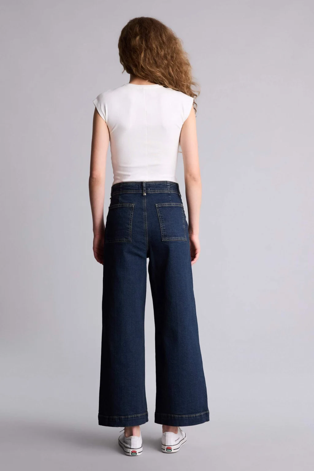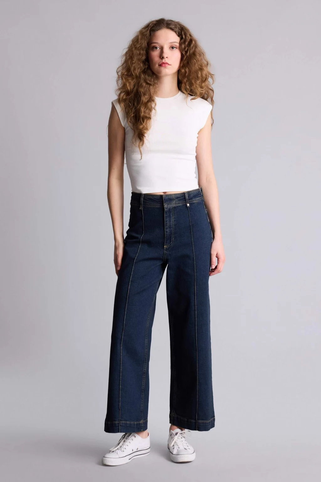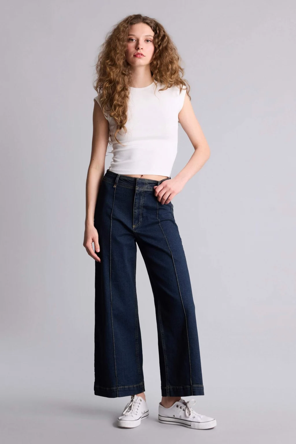 Yetişkinler için yüksek bel kot pantolon. Culotte kesimli, mavi jean kumaşından üretilmiş uzun pantolon. Kadınlar için sürdürülebilir bir seçim. Sonbahar/Kış için ideal temel bir parça. Yıkamalı özellik.