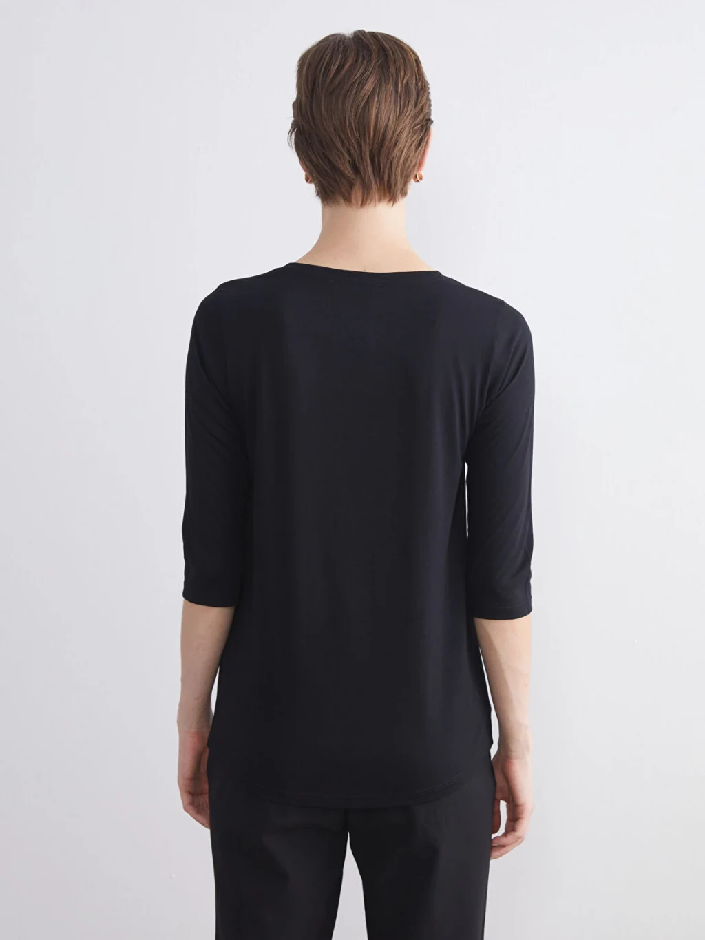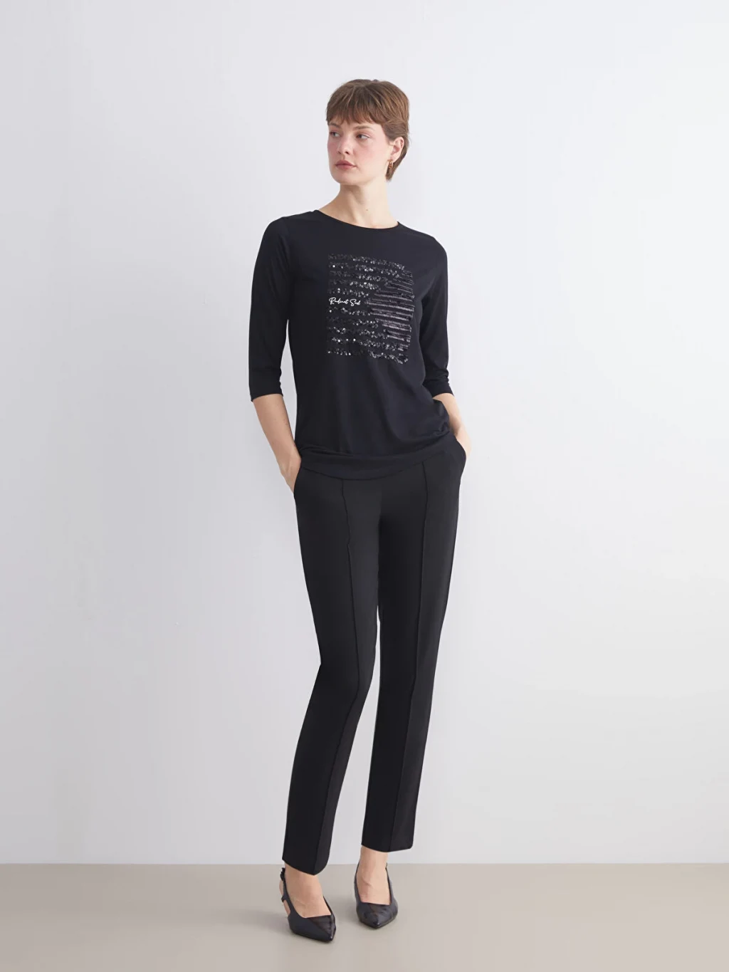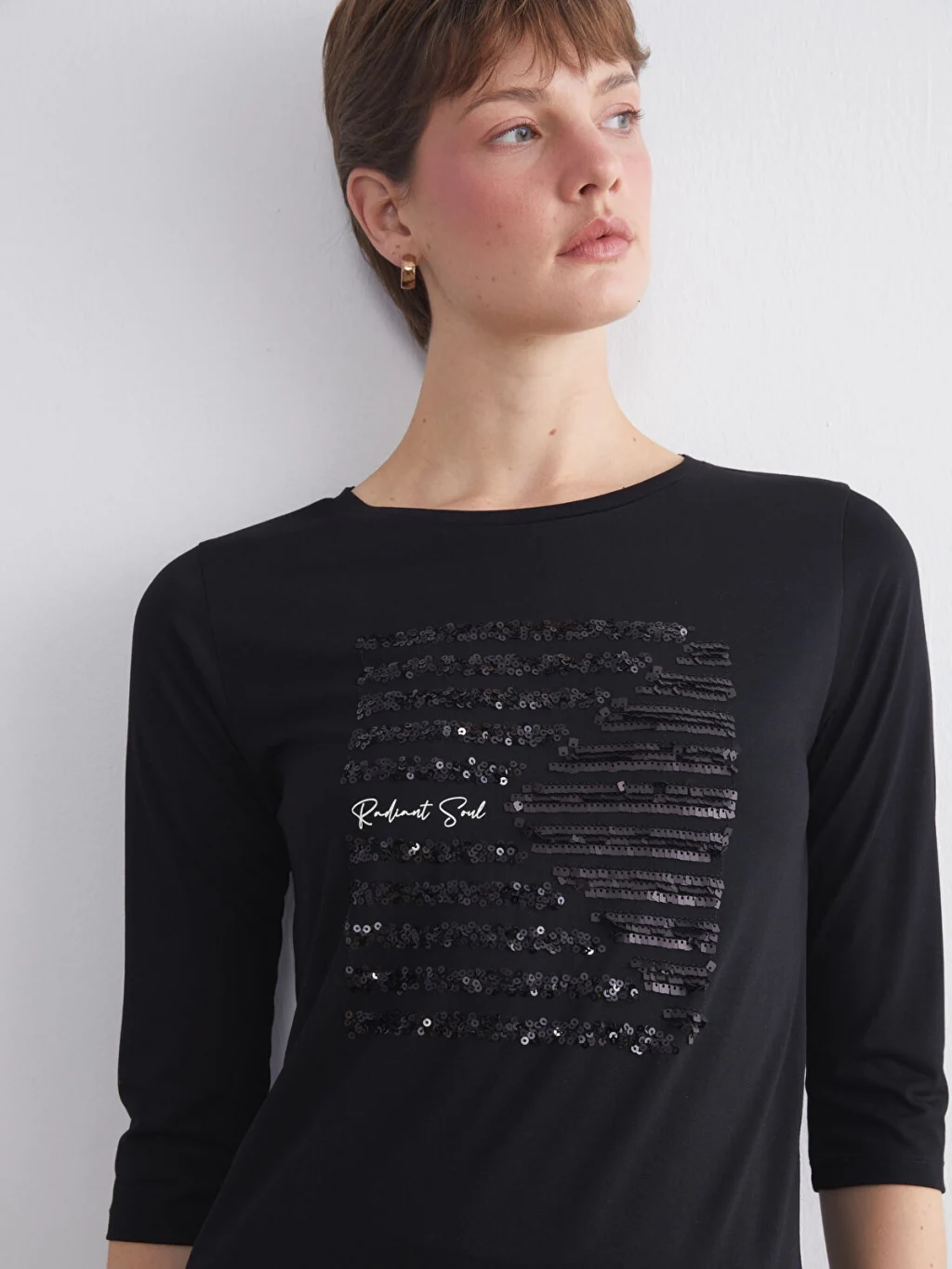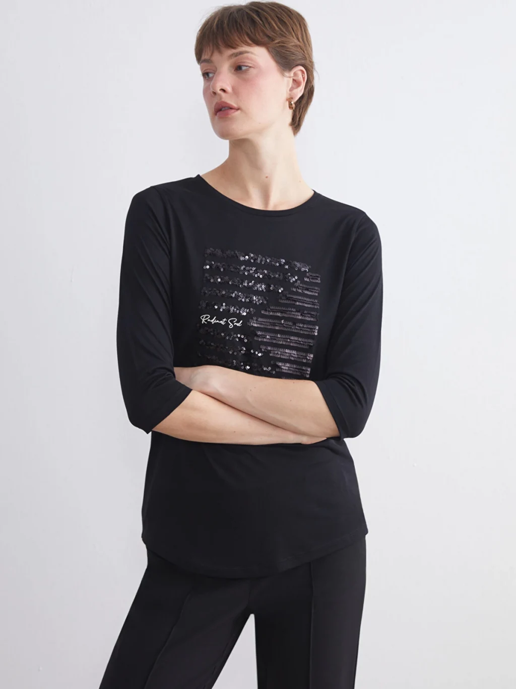 Bisiklet yaka kadın bluz, süprem kumaştan üretilmiştir. Ön kısmında pul işleme detayı yer alır.