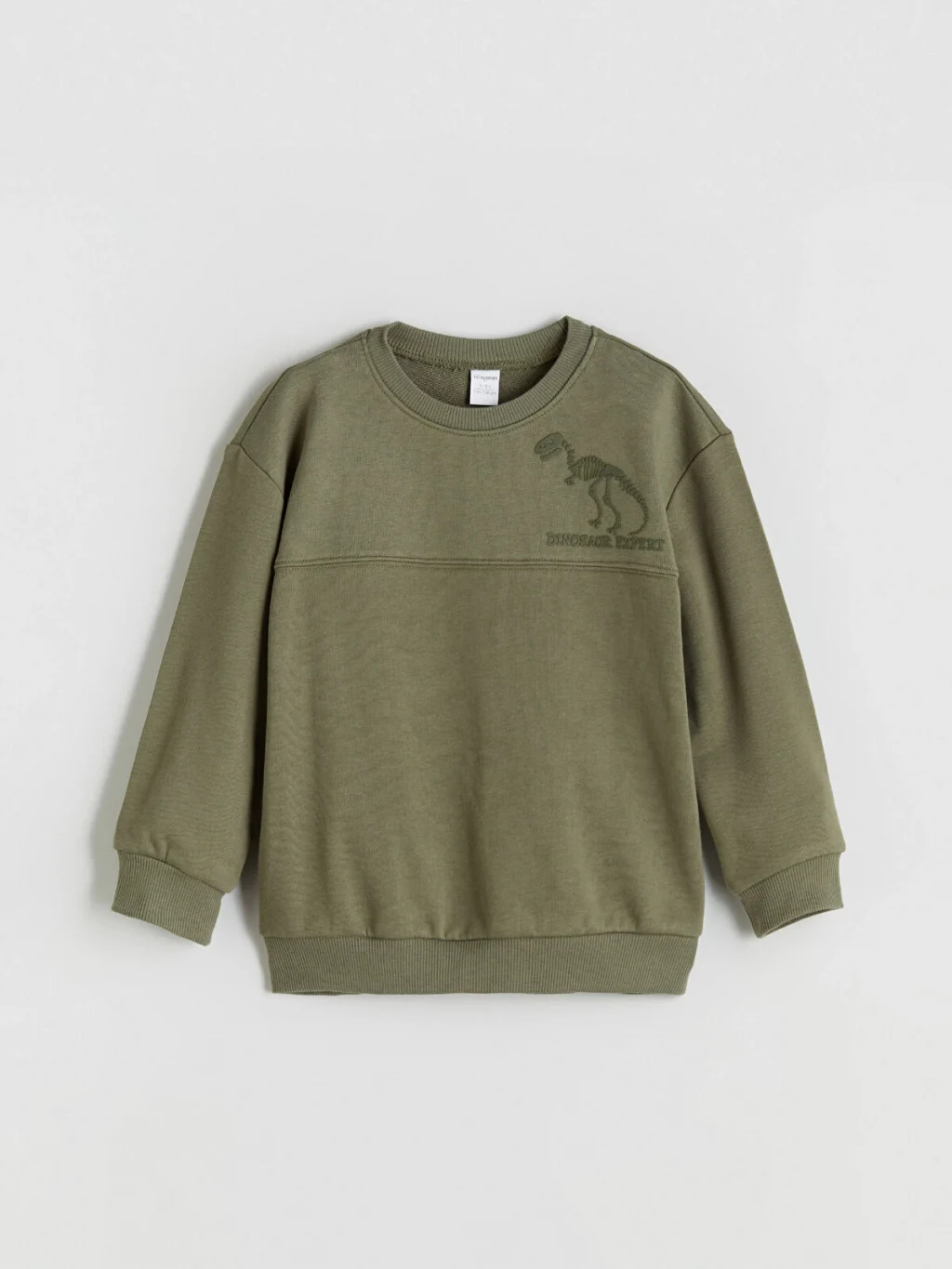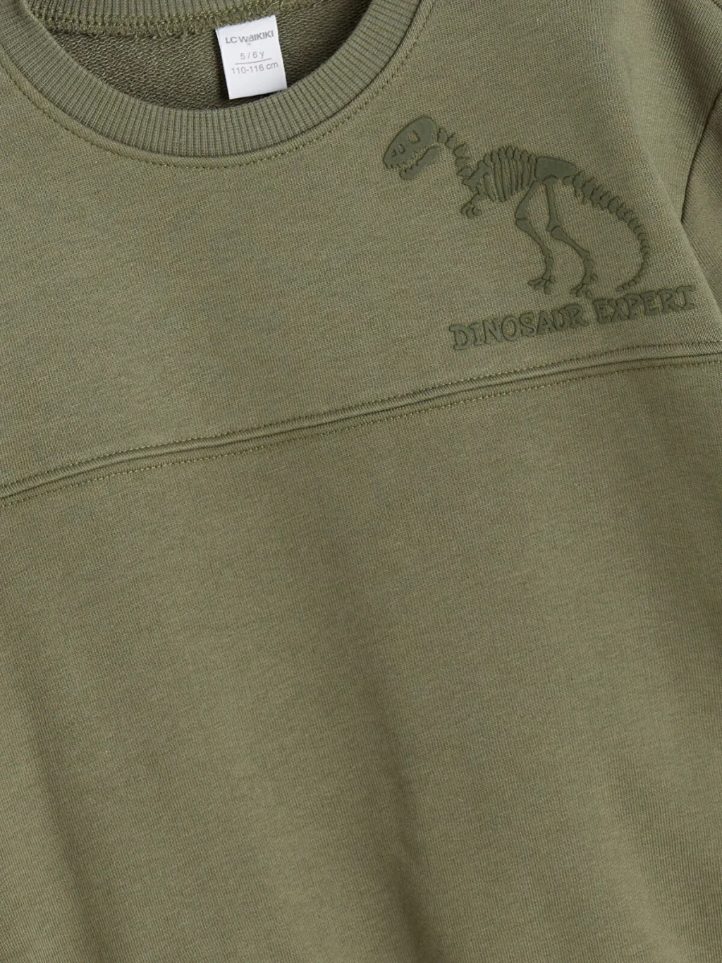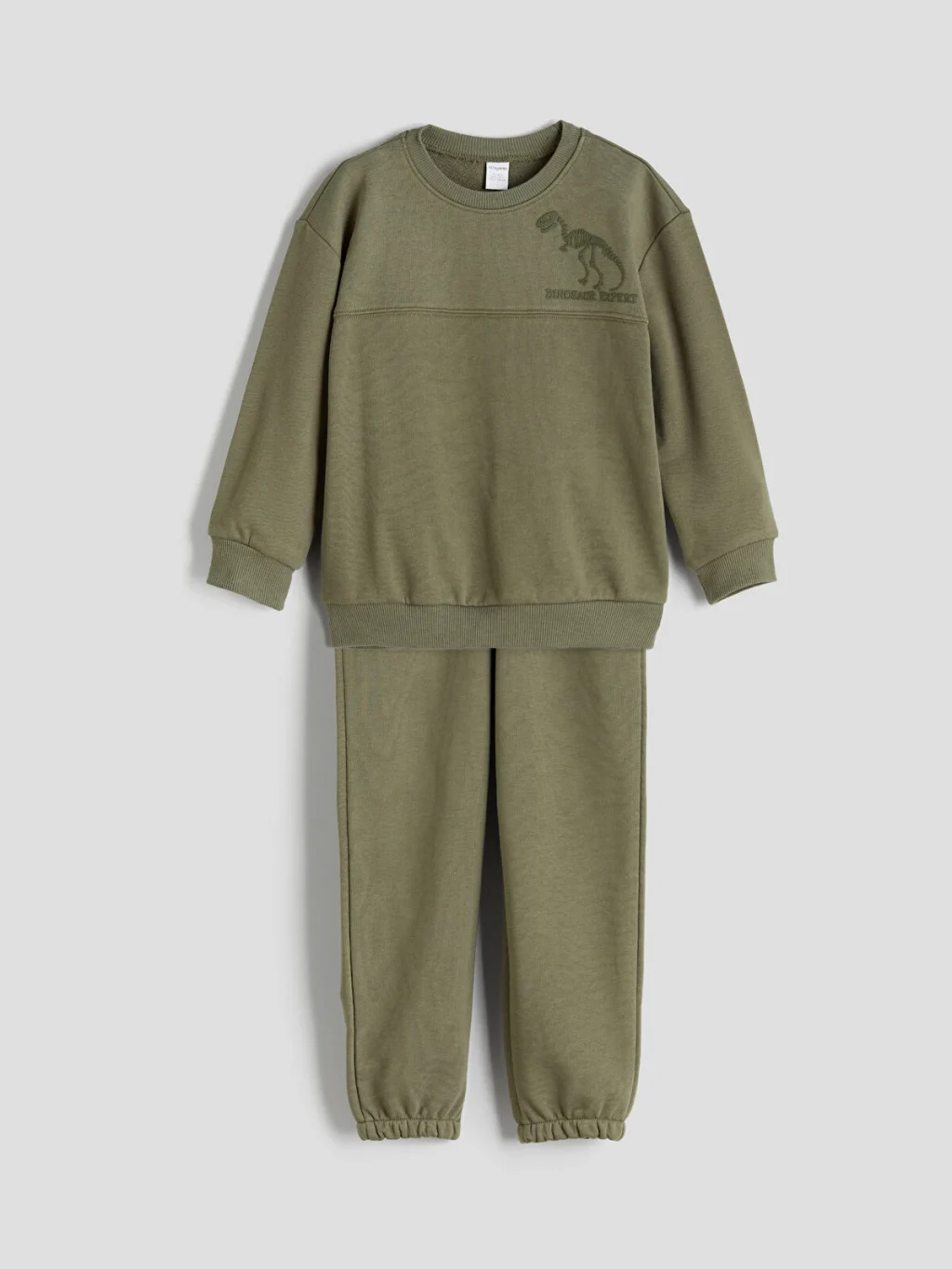 Bisiklet yaka, uzun kollu ve dinozor baskılı erkek bebek sweatshirt ile beli ve paçaları lastikli eşofman altından oluşan takım, 3 iplik kumaşa sahiptir.