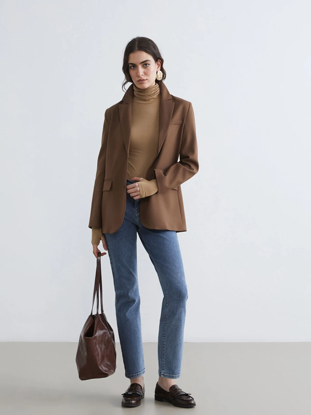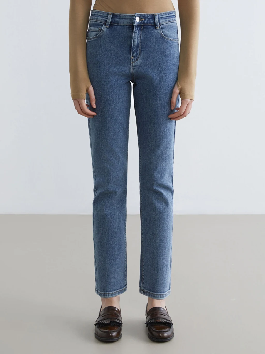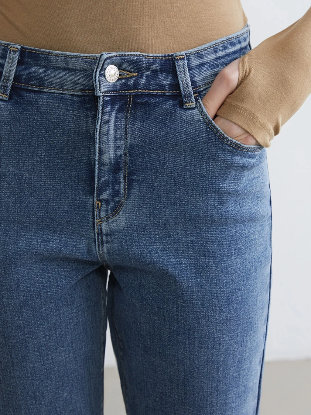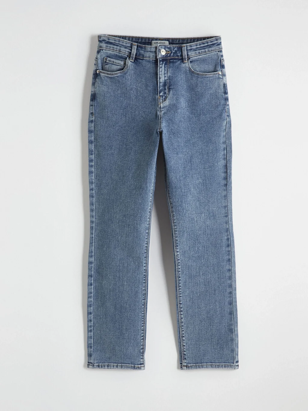 Yüksek bel, dar kesimli kadın jean pantolon, pamuklu denim kumaştan üretilmiştir, beş cepli tasarıma sahip olup fermuar ve düğme kapamalıdır.