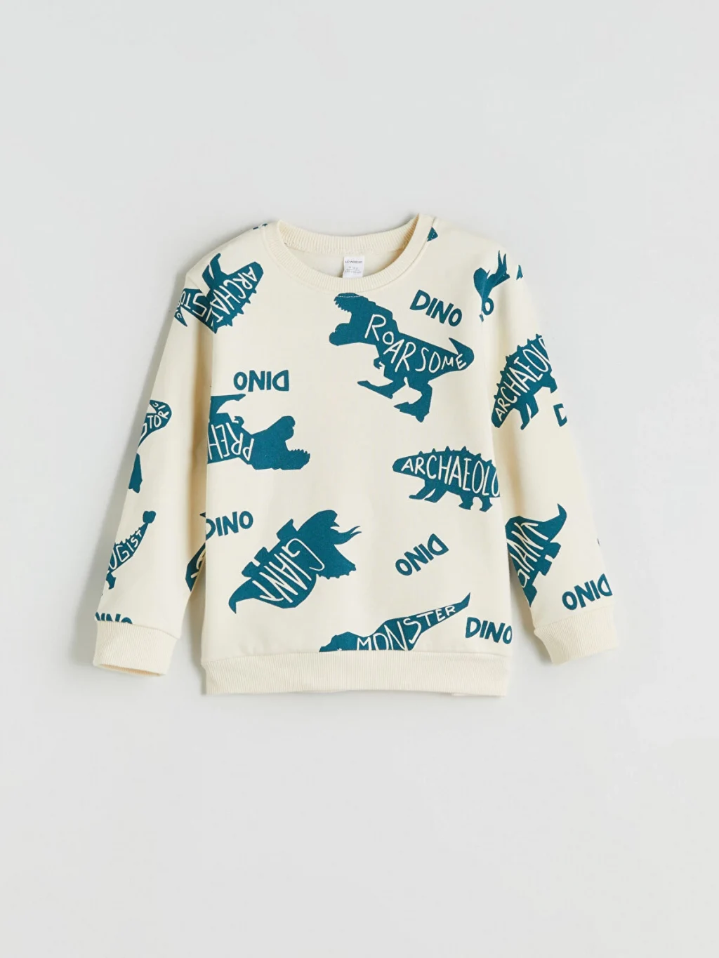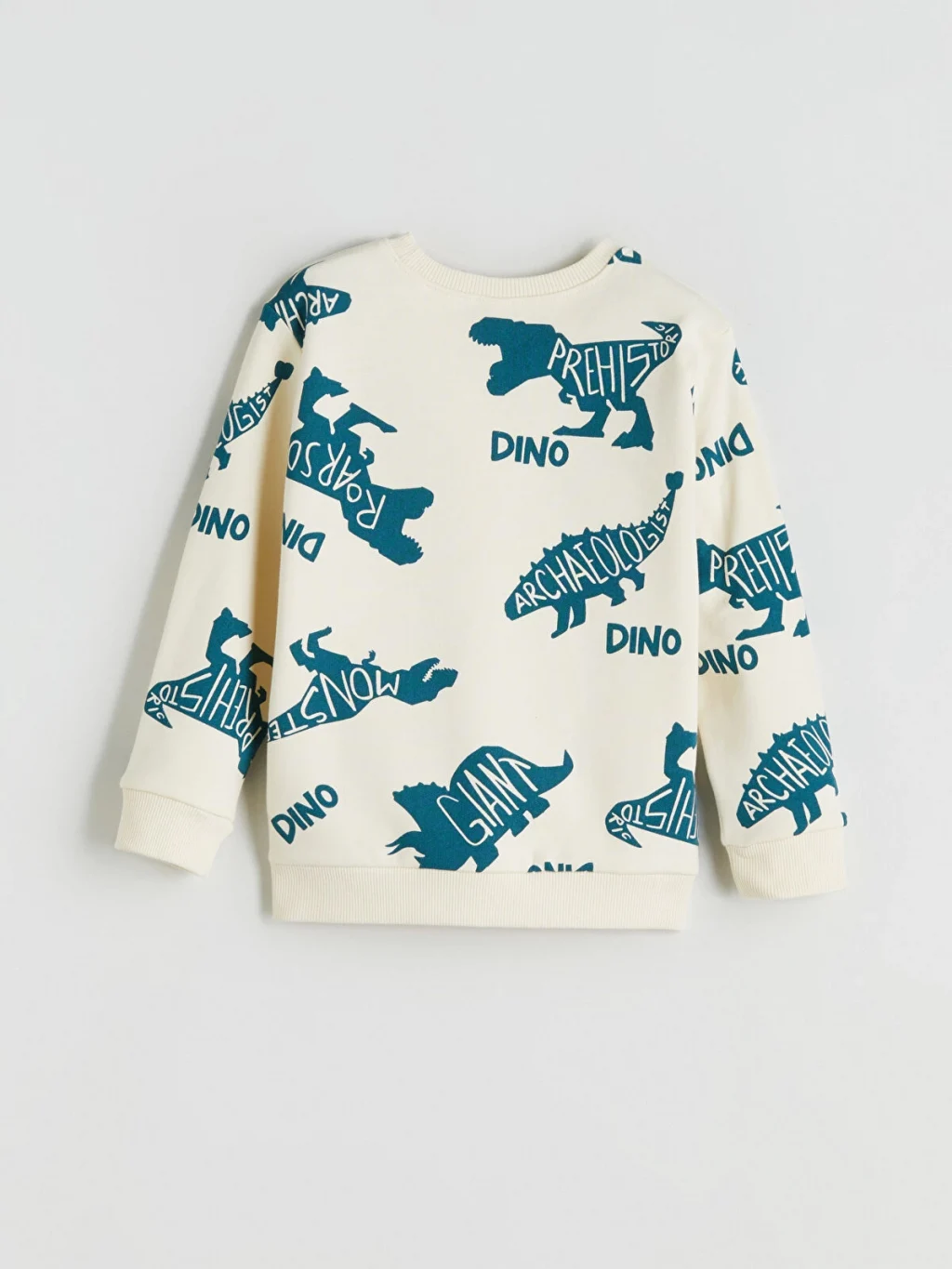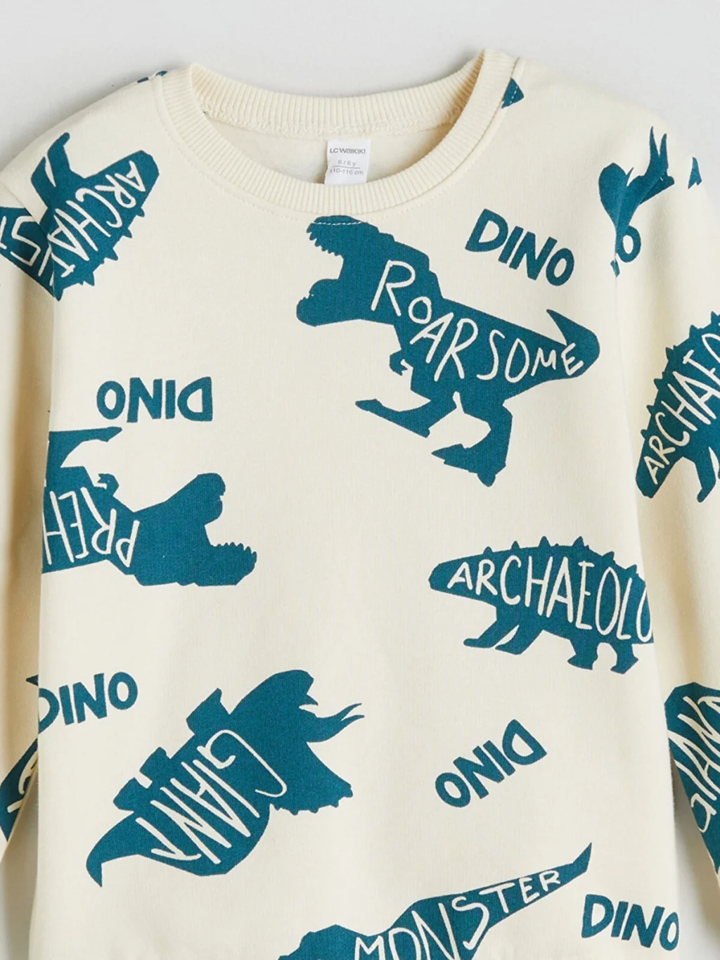 Dinozor baskılı sweatshirt, 3 iplik şardonlu kumaştan üretilmiştir. Bisiklet yaka ve ribanalı tasarıma sahiptir.