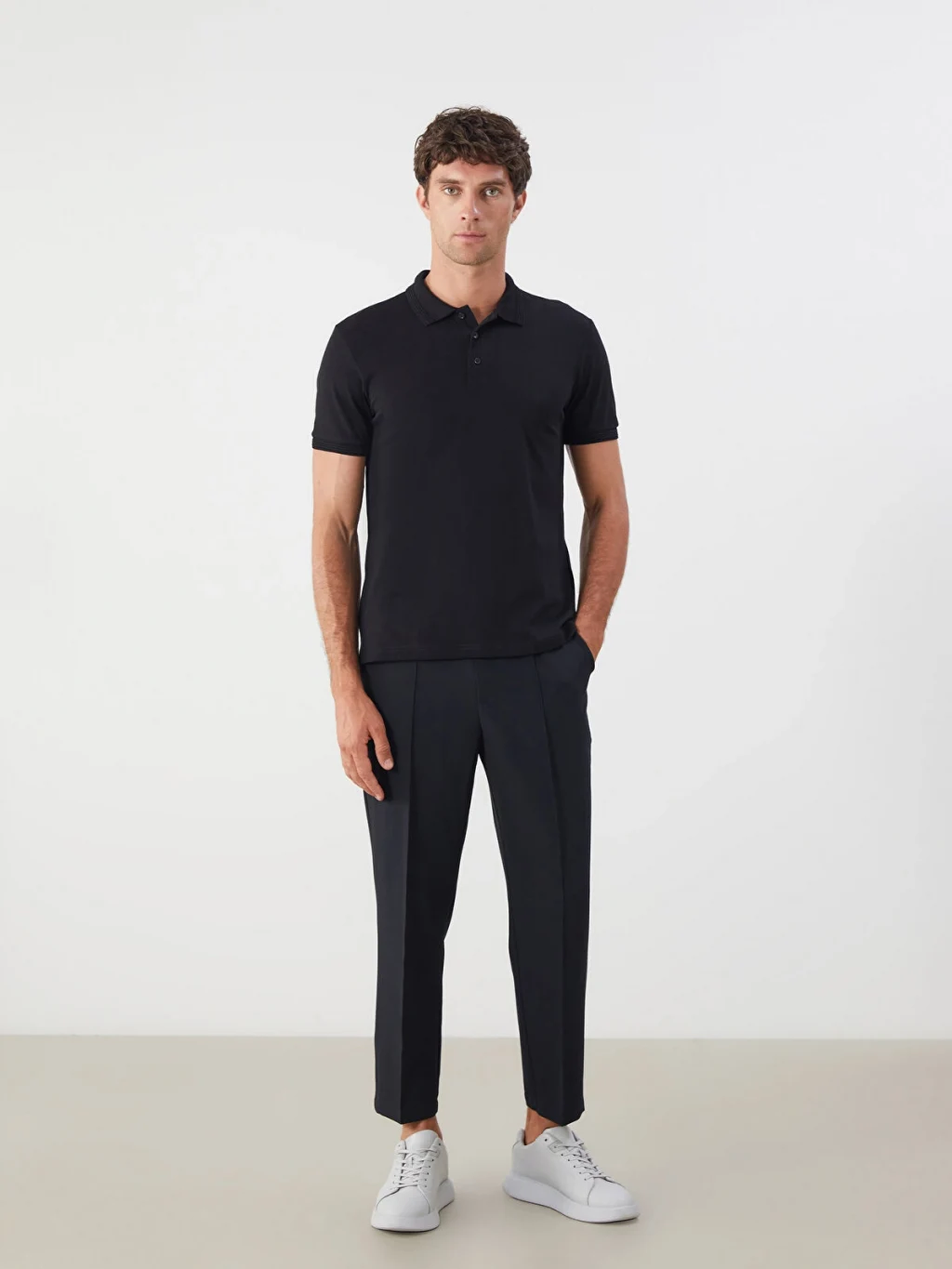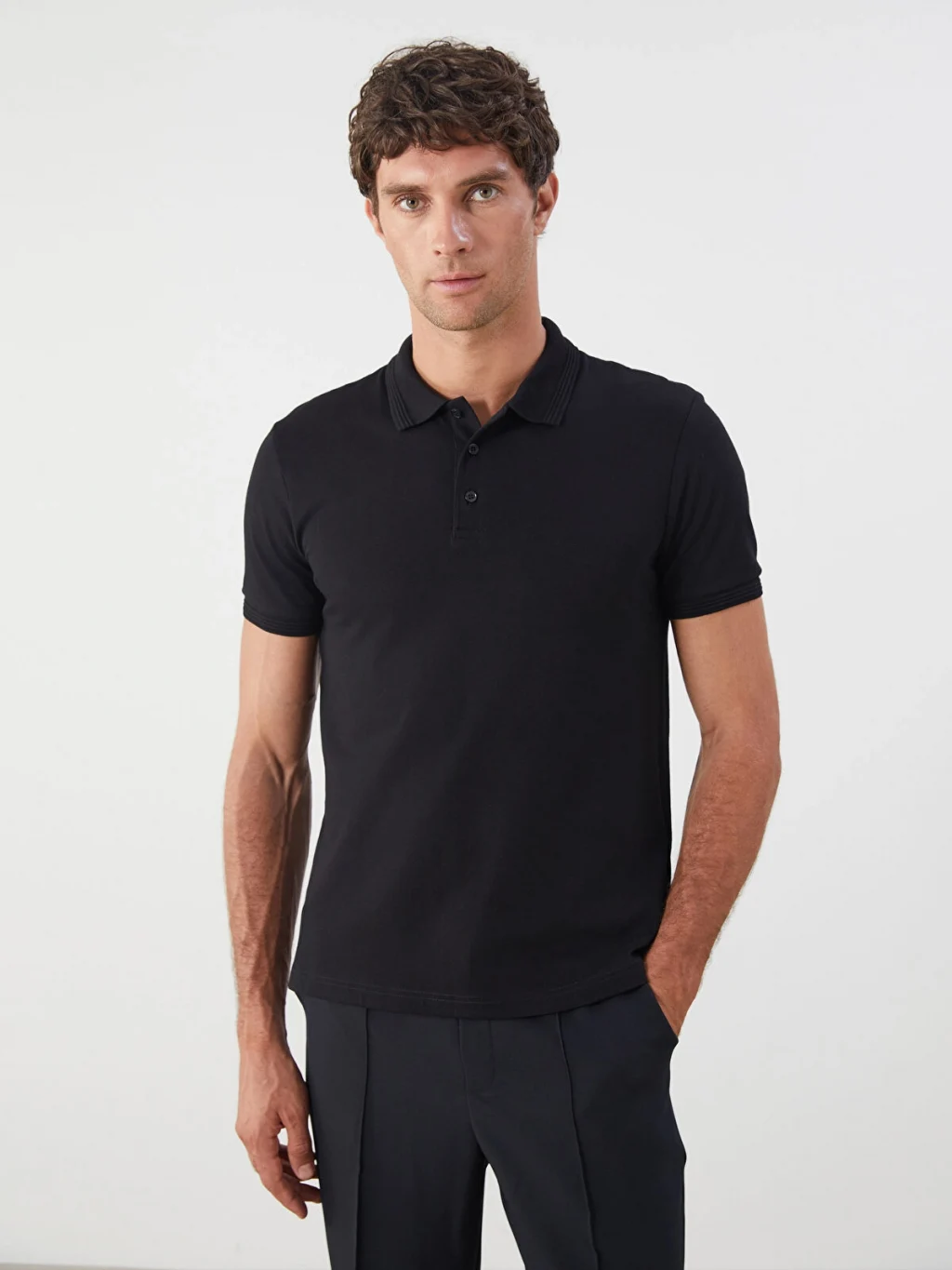 Polo yaka ve kısa kollu olarak tasarlanan erkek tişört, jakarlı dokulu düz kumaştan üretilmiştir.