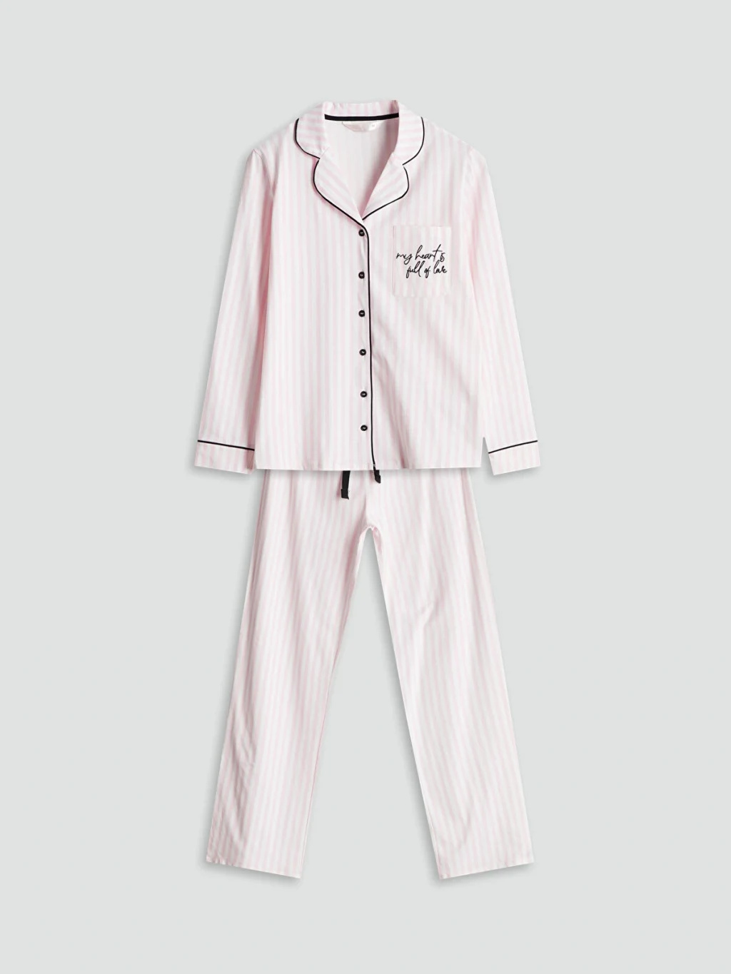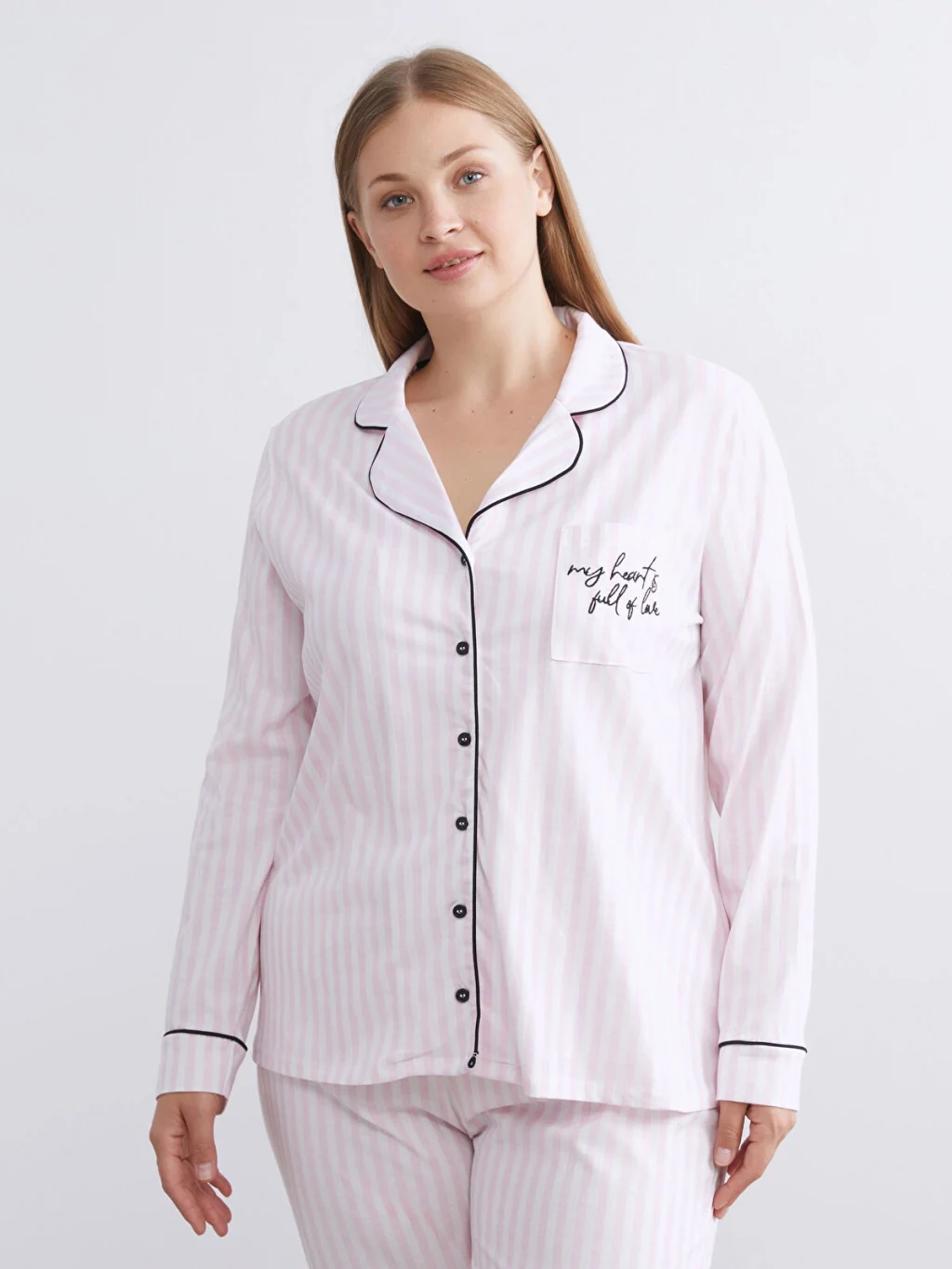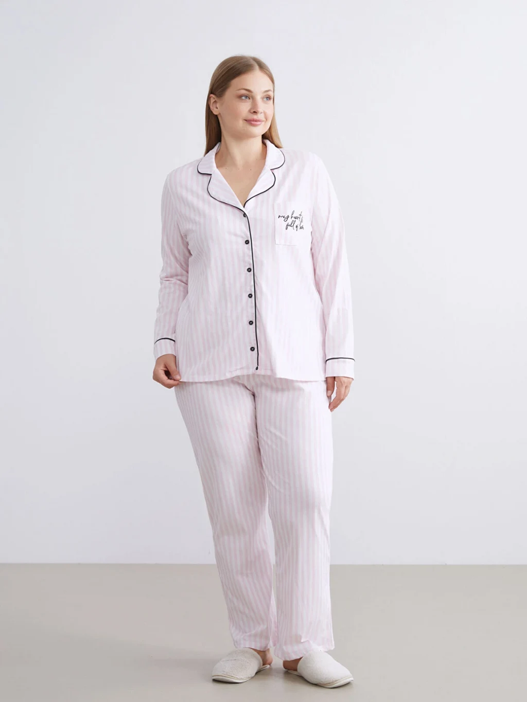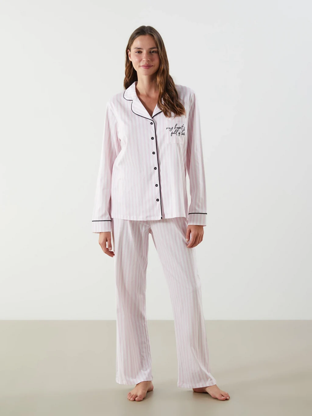 Kadın pijama takımı, %100 pamuklu kumaştan üretilmiştir. Gömlek yaka pijama üstü ve beli lastikli pijama altından oluşur.