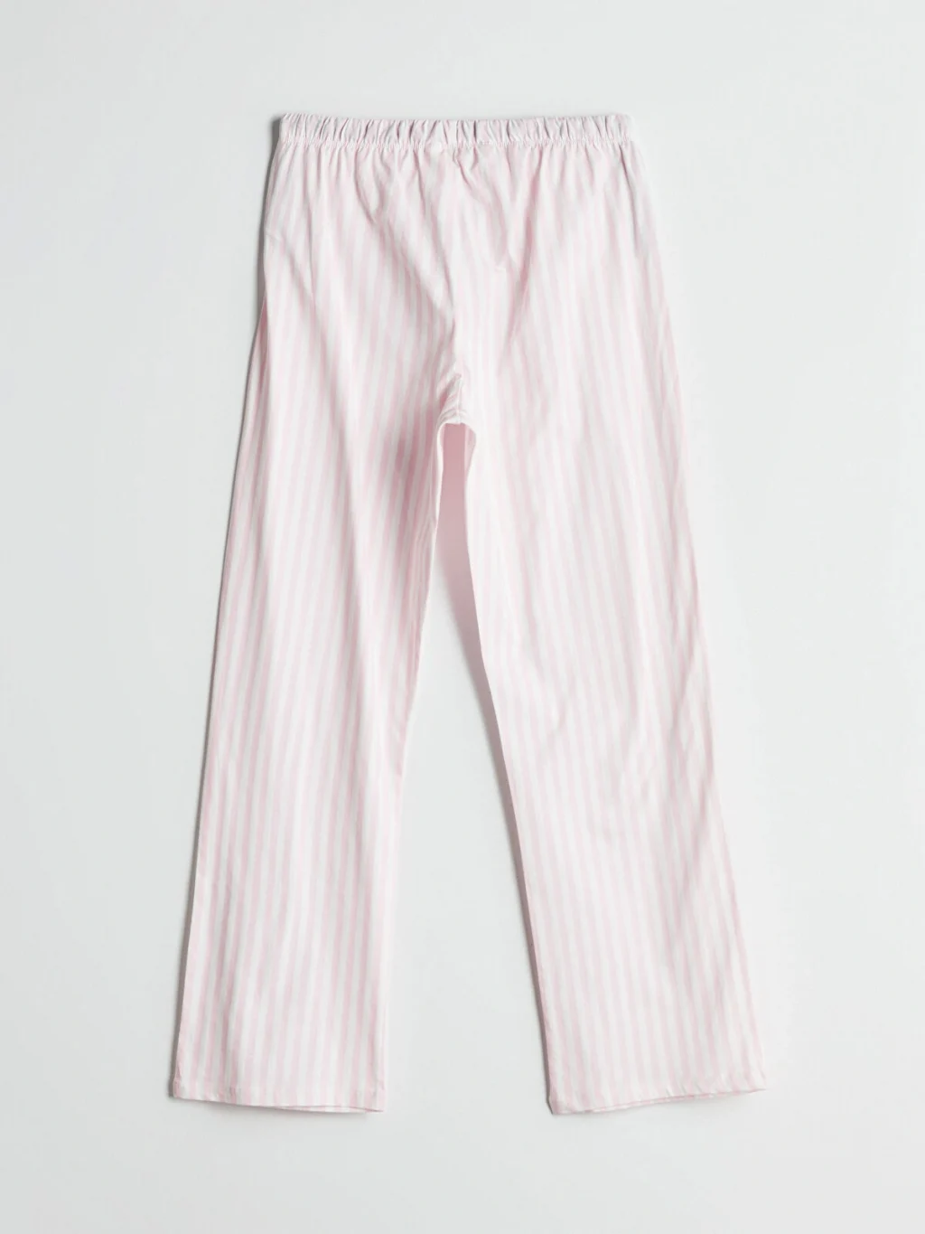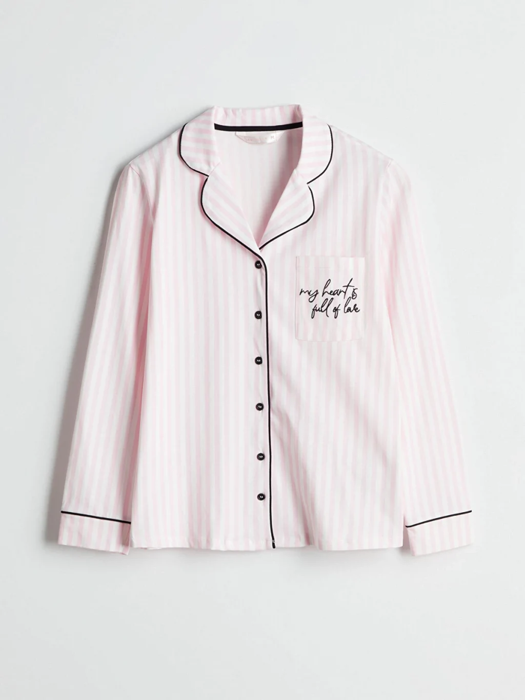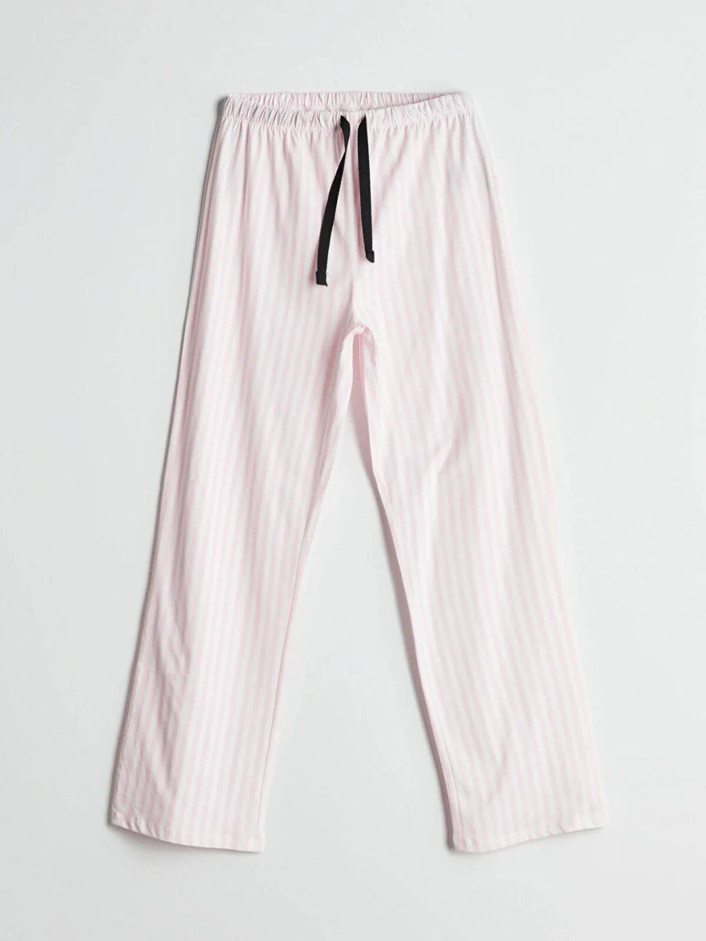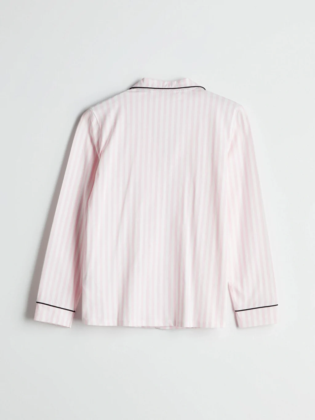 Kadın pijama takımı, %100 pamuklu kumaştan üretilmiştir. Gömlek yaka pijama üstü ve beli lastikli pijama altından oluşur.