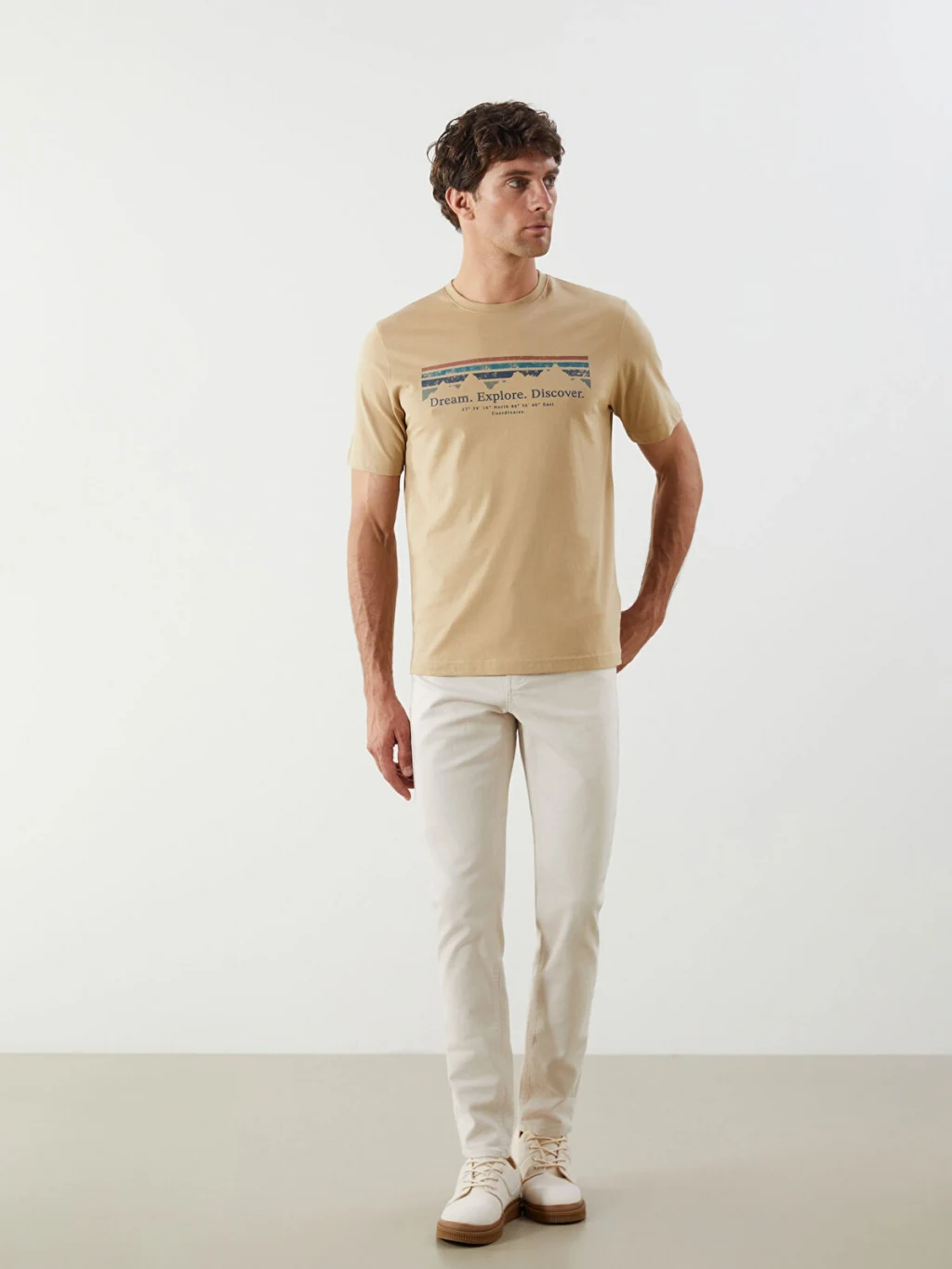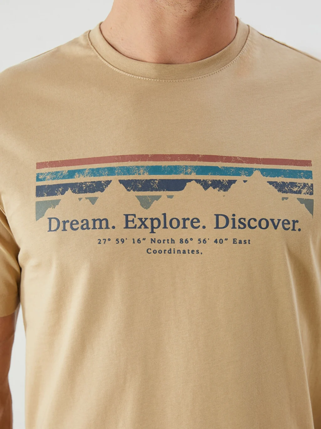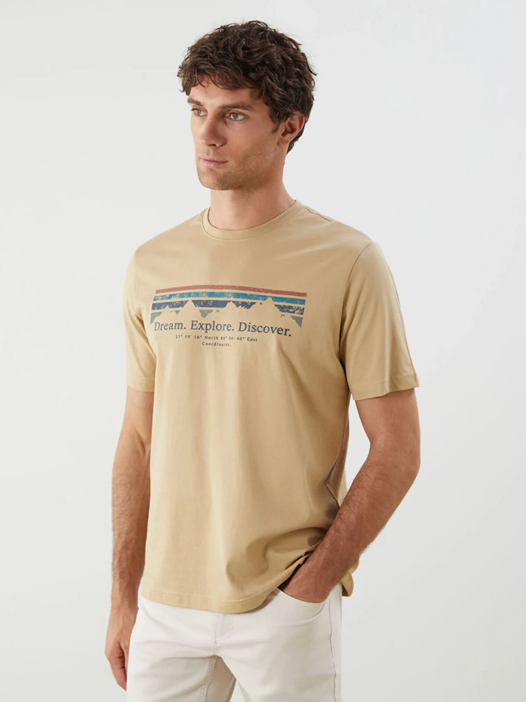 Standart kalıp, bisiklet yaka ve kısa kollu erkek tişört, penye kumaştan üretilmiştir. Ön yüzünde baskı detayı bulunur.