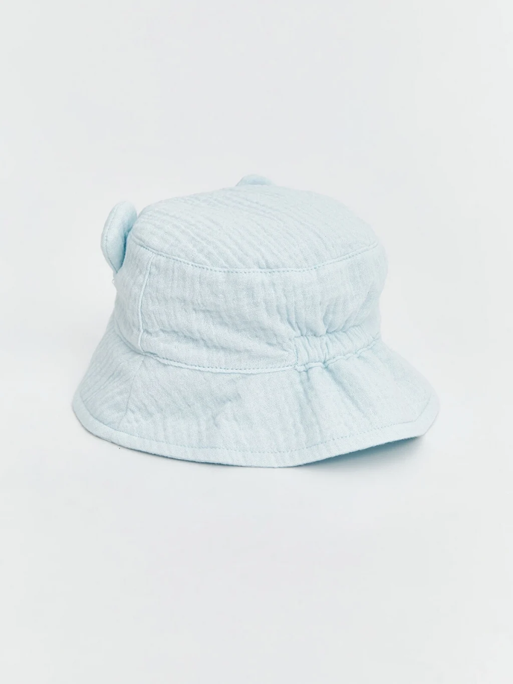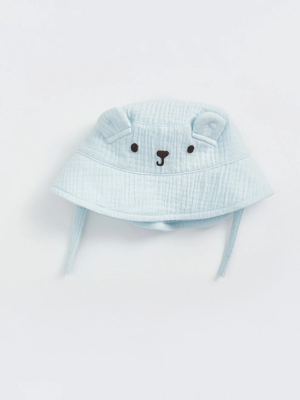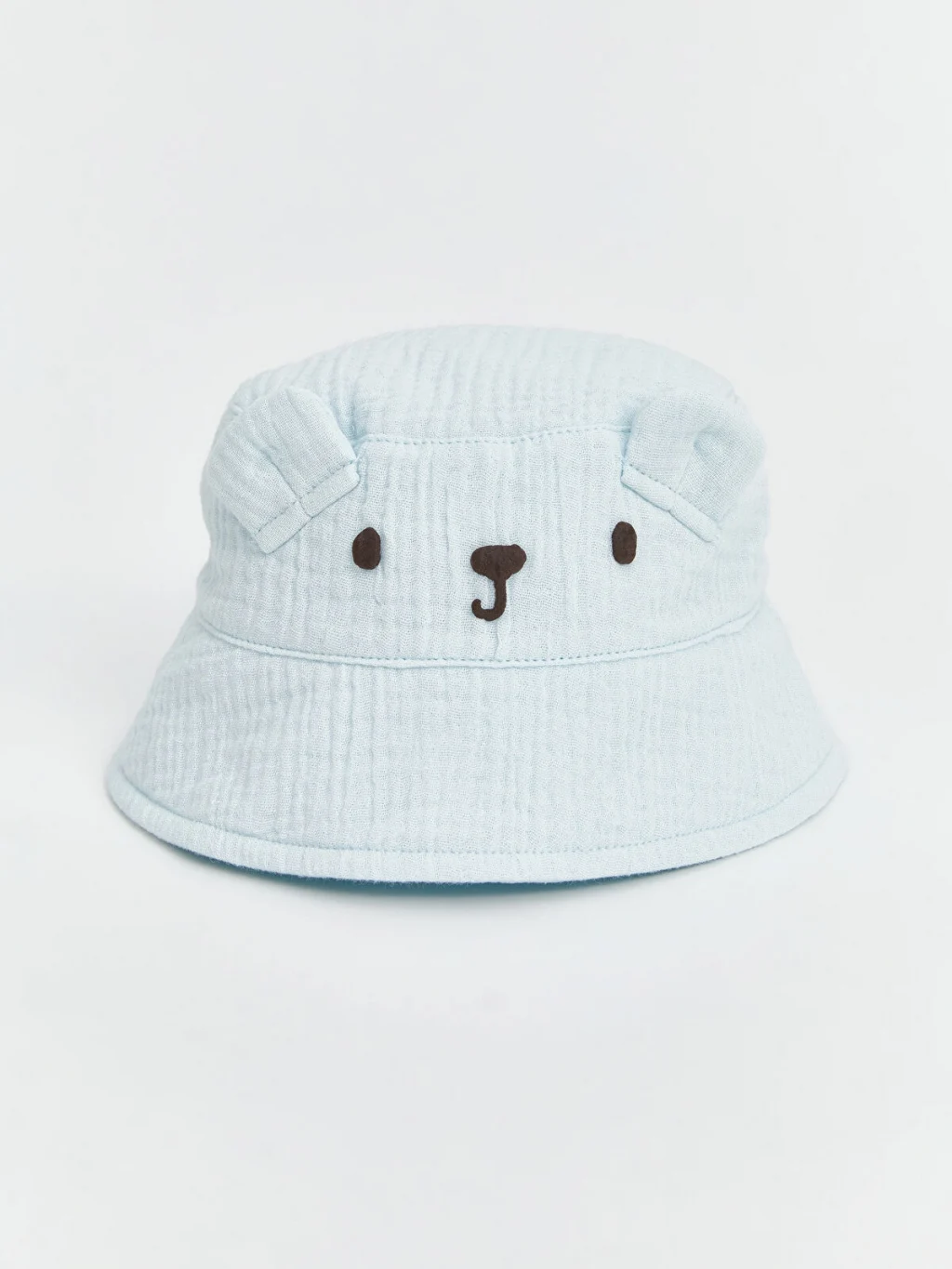 Hayvan figürü işlemeli ve kulak detaylı erkek bebek bucket şapka, müslin kumaştan üretilmiştir.