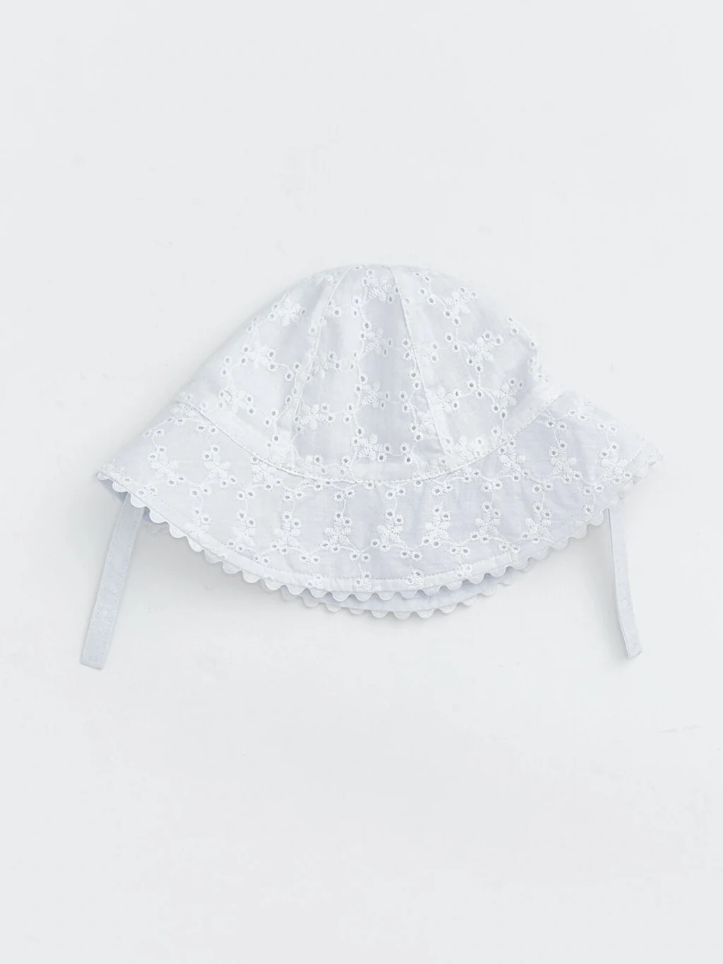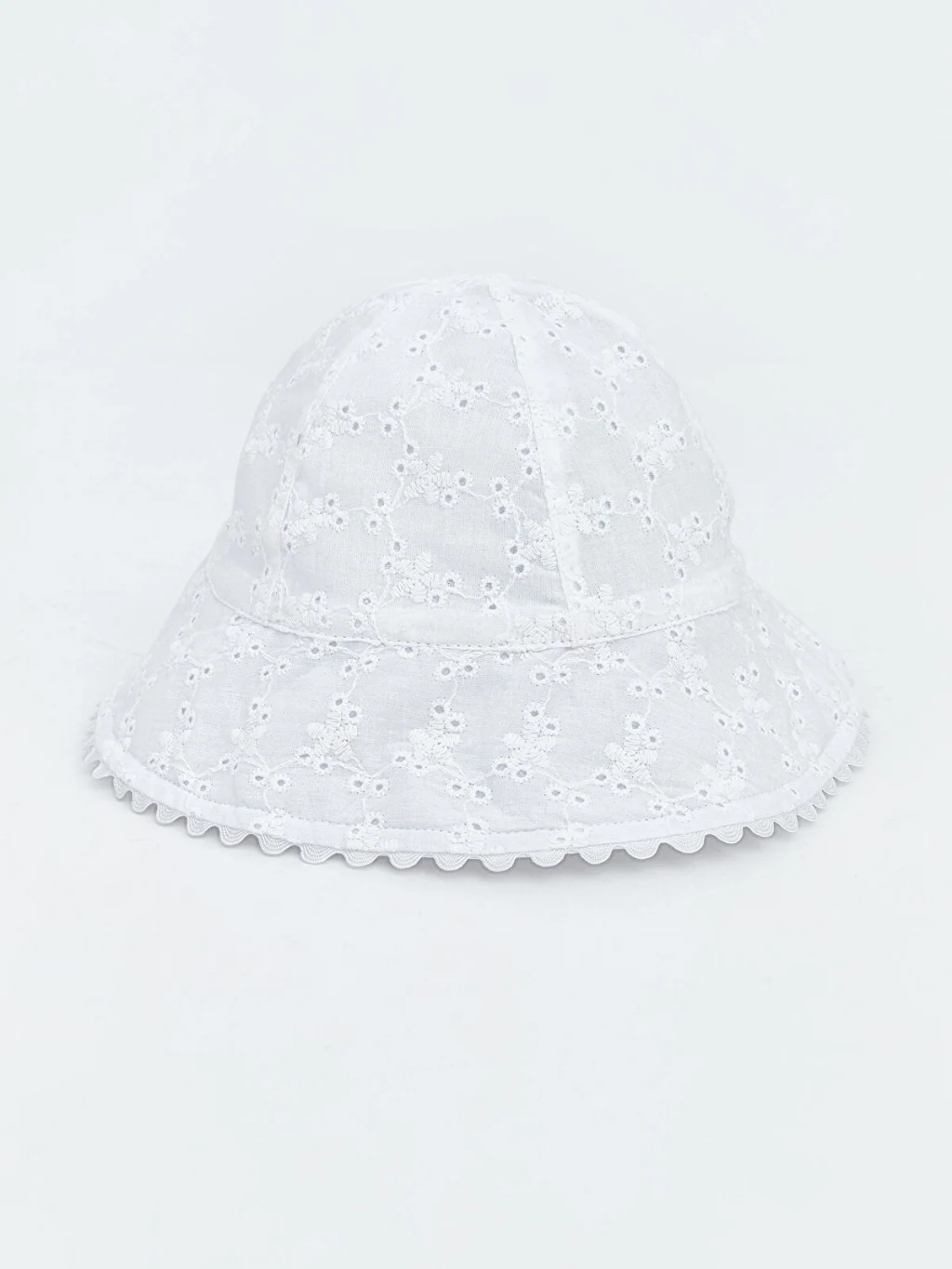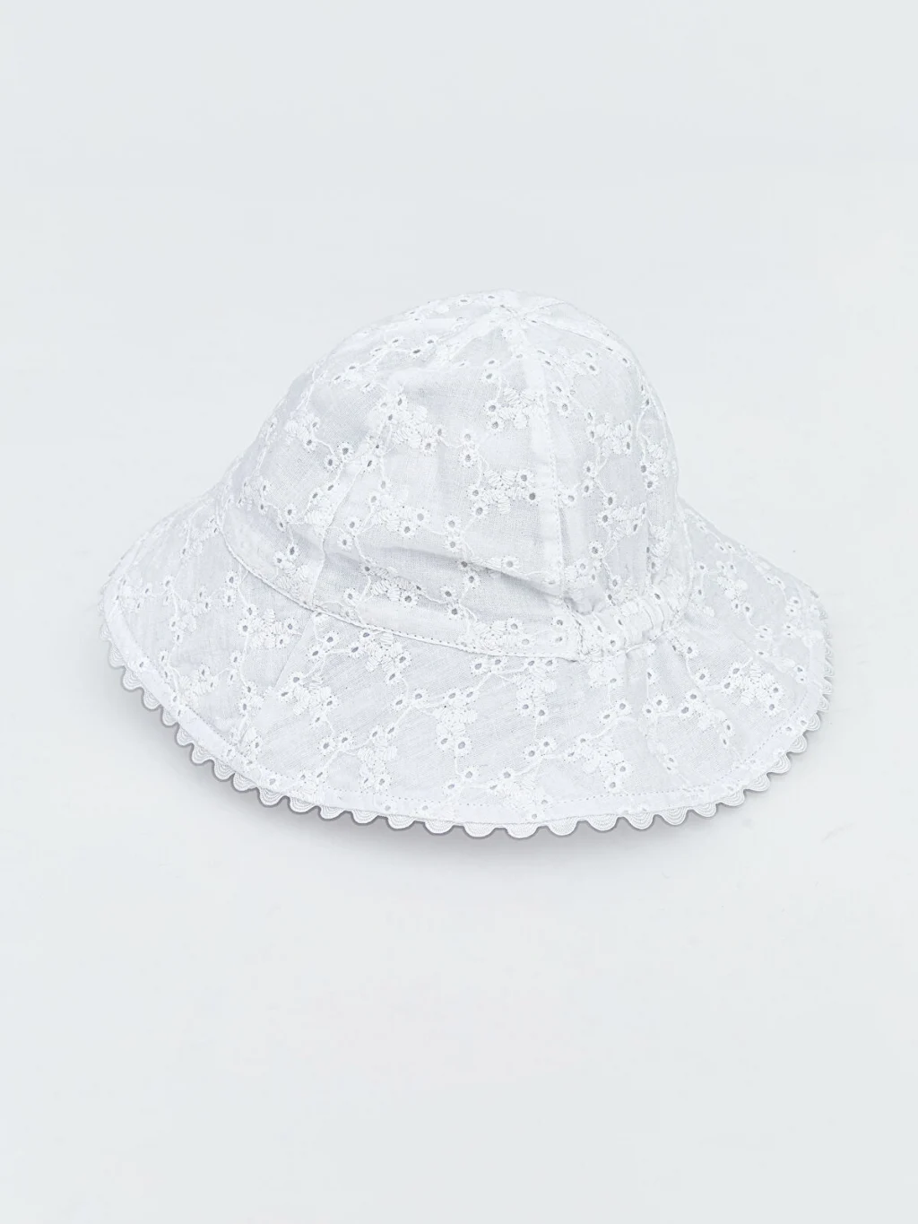 Fisto işlemeli kumaştan üretilen kız bebek bucket şapka, dalgalı kesim kenar detayına sahiptir.