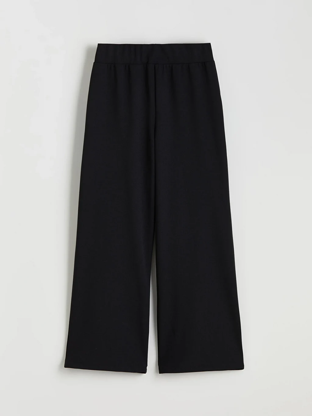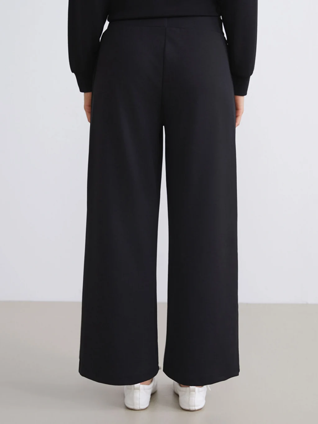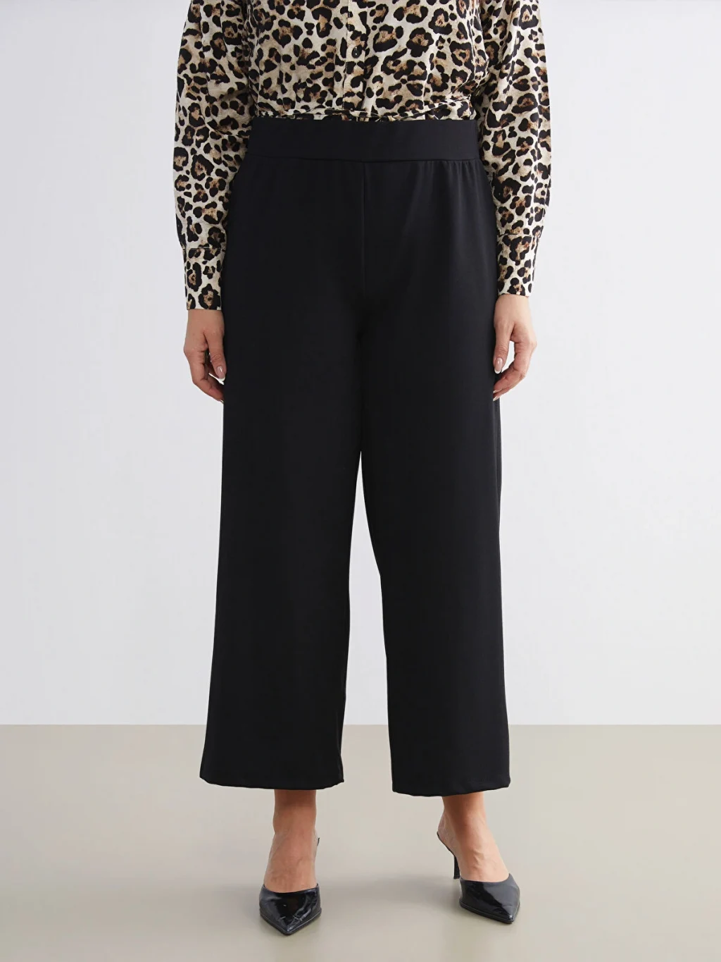 Kadın pantolon, beli tamamen lastikli bir tasarıma sahiptir. Bol kalıplı olan ürün, geniş paçalarıyla tamamlanmıştır.