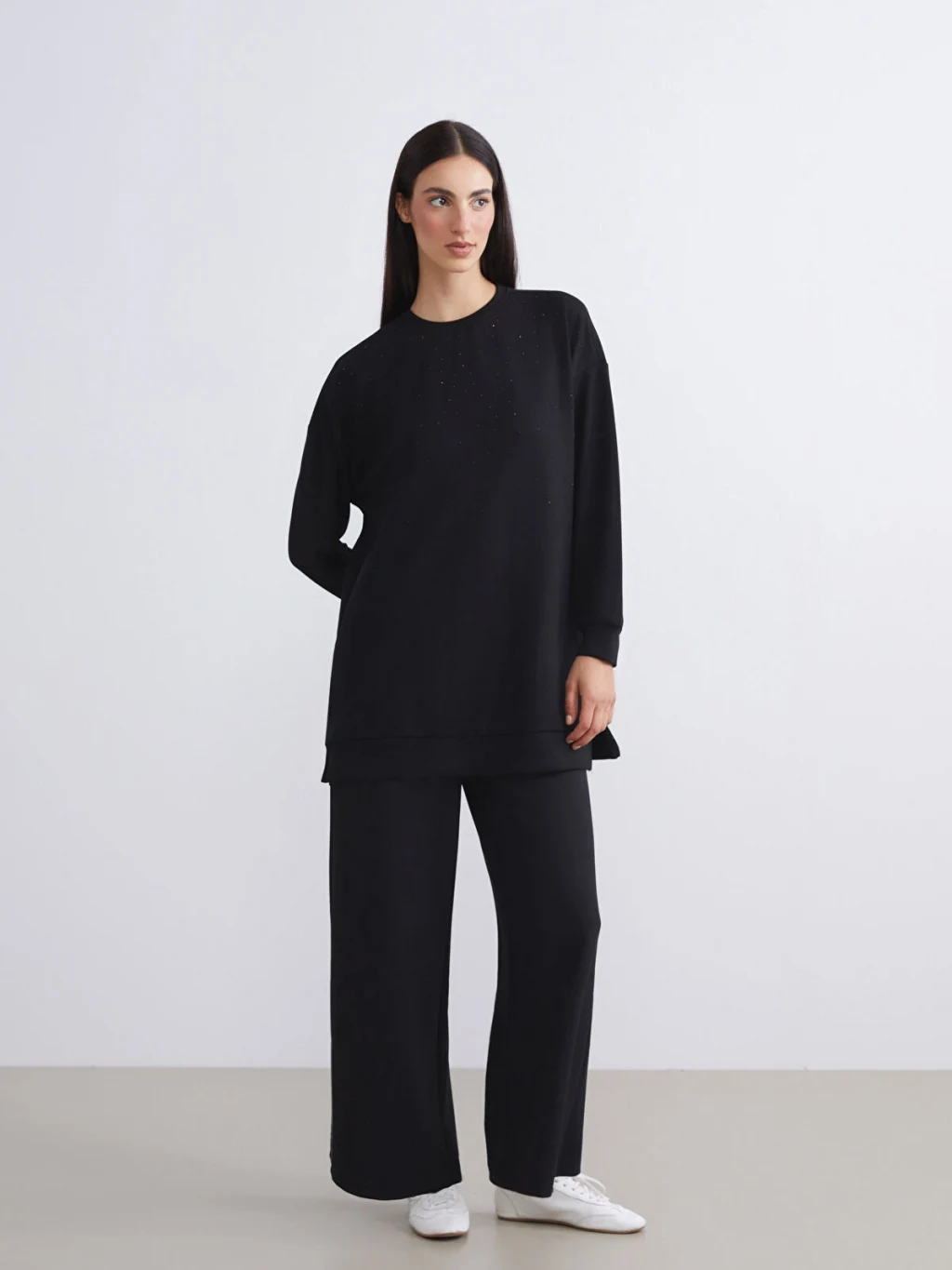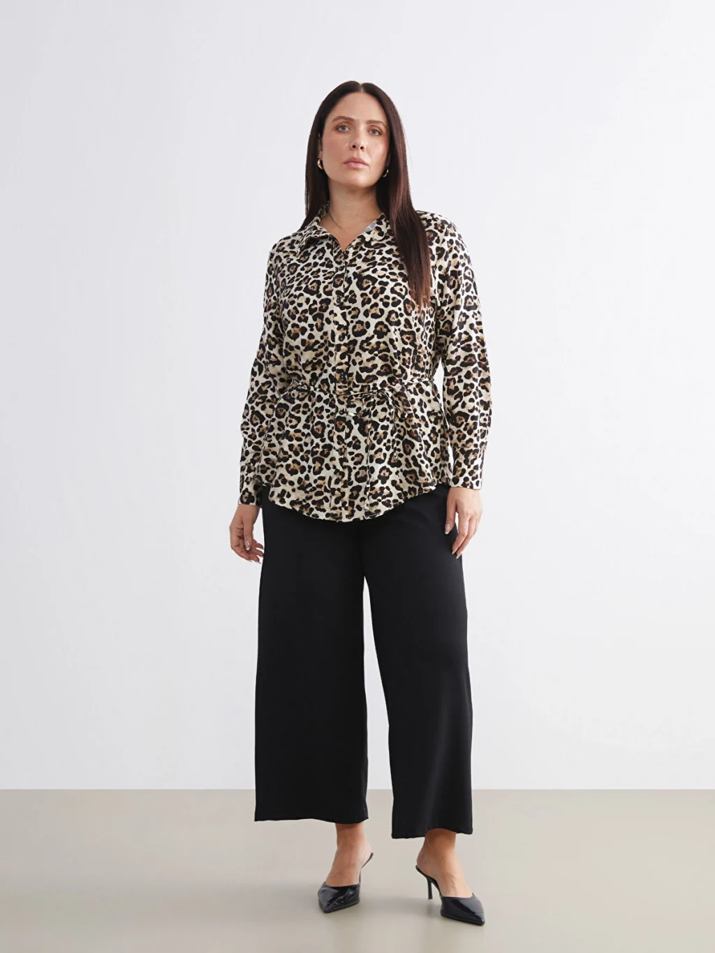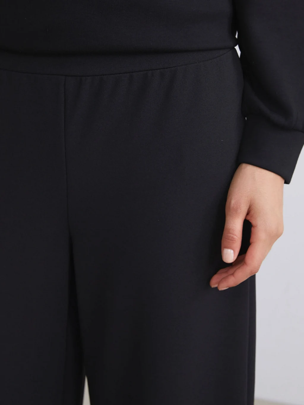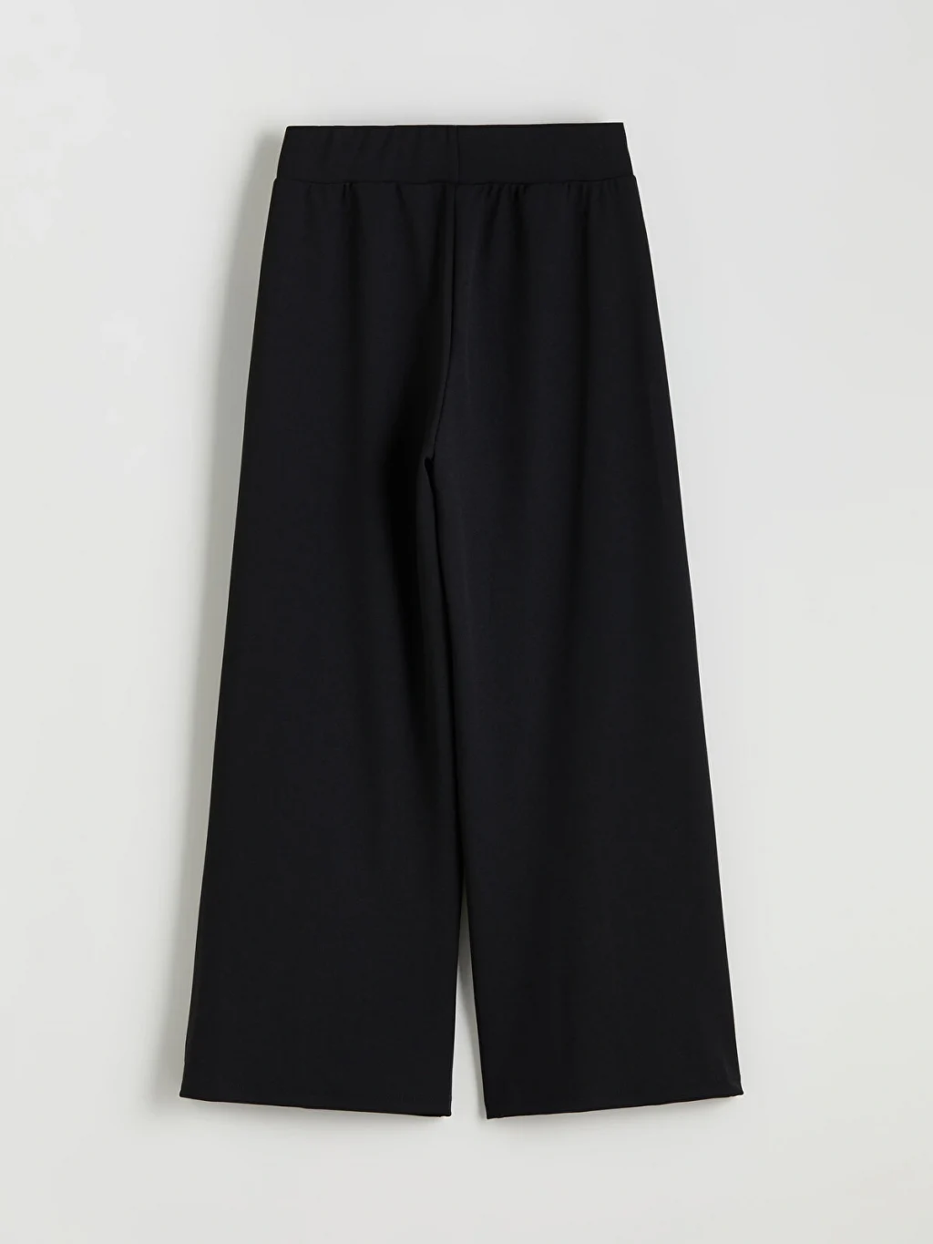 Kadın pantolon, beli tamamen lastikli bir tasarıma sahiptir. Bol kalıplı olan ürün, geniş paçalarıyla tamamlanmıştır.