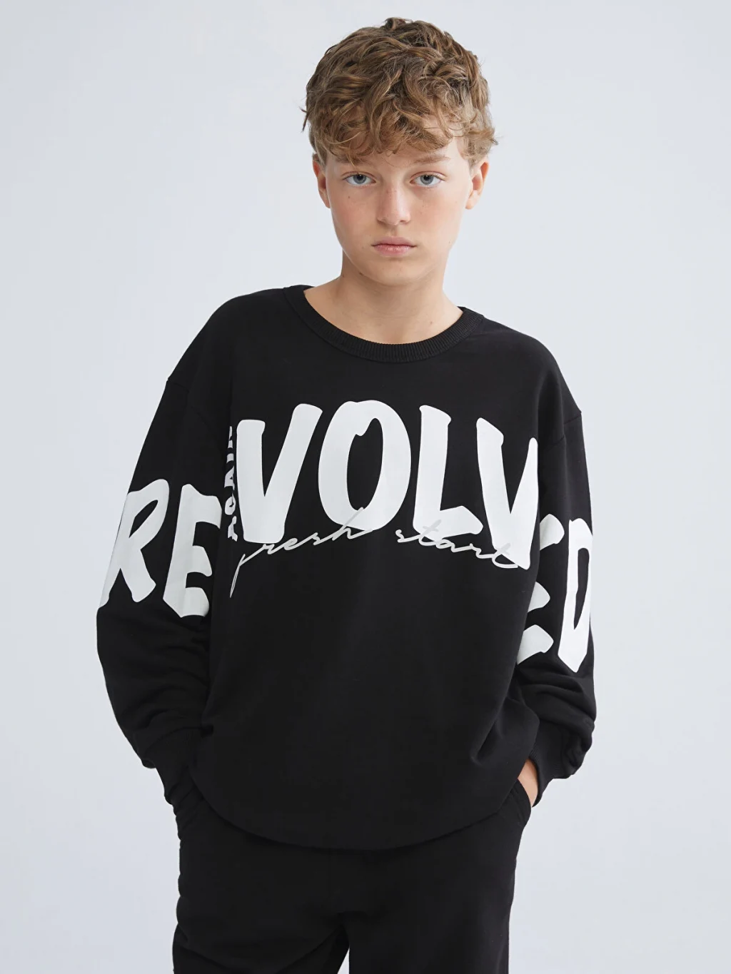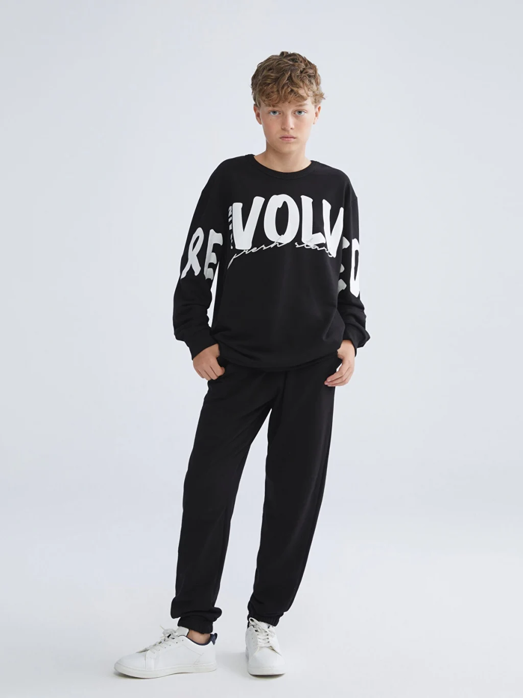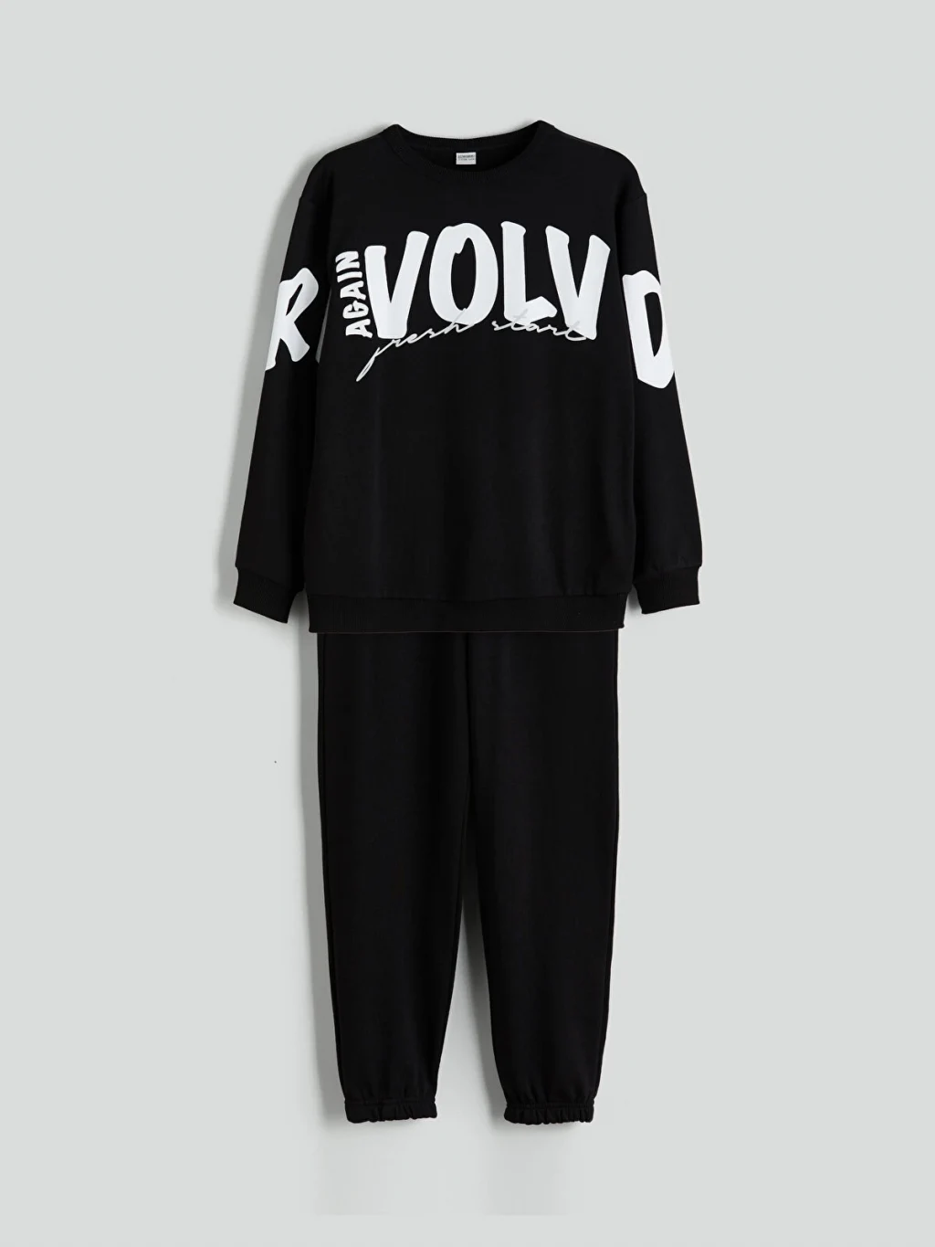 Bisiklet yaka, uzun kollu, baskılı sweatshirt ve paçaları lastikli eşofman altından oluşan erkek çocuk takım, 3 iplik kumaşa sahiptir.