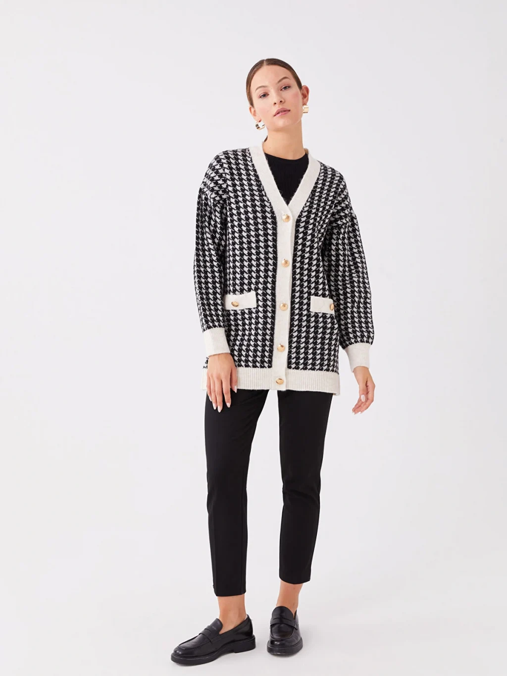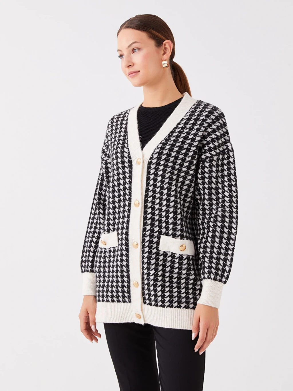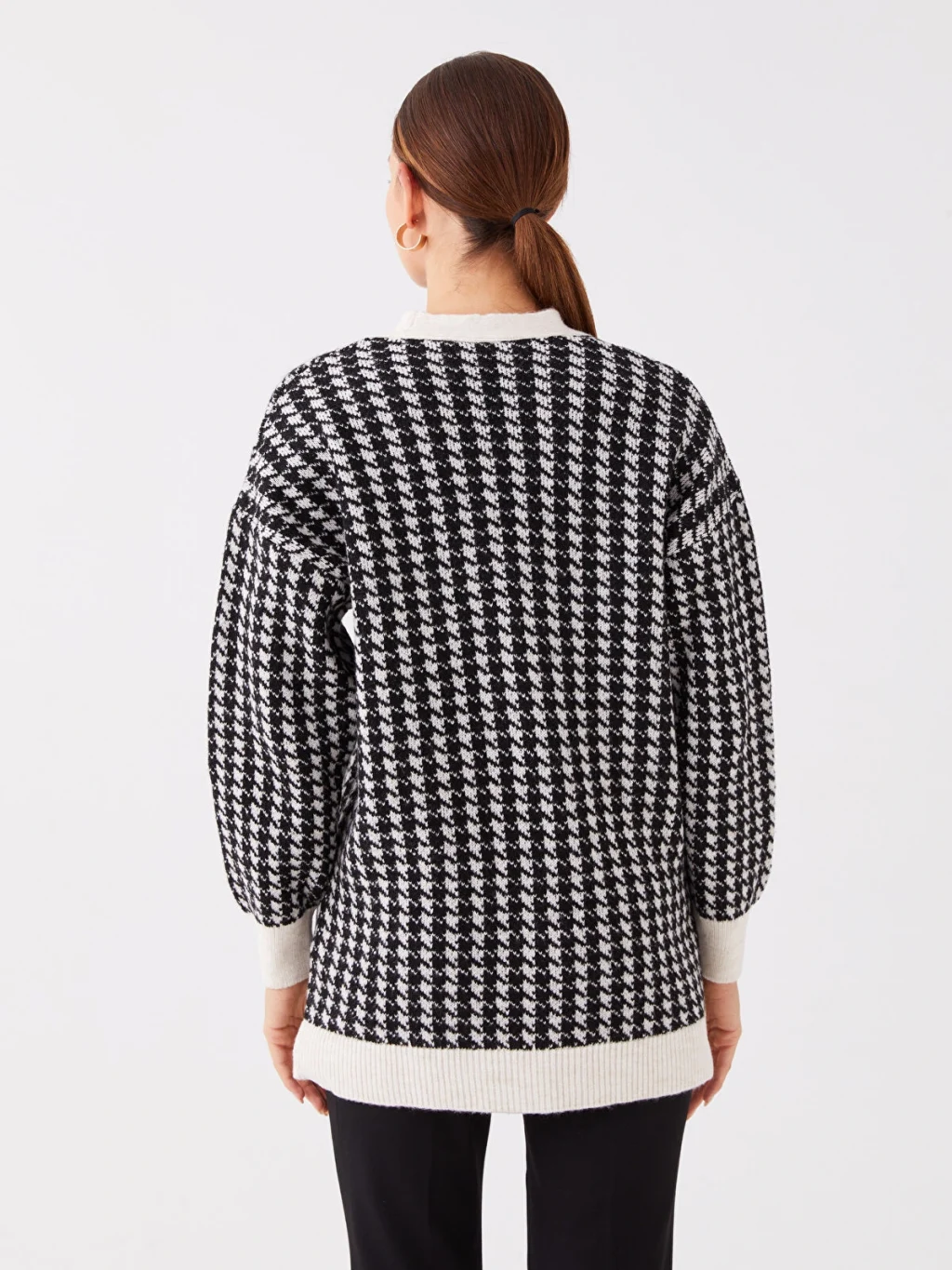 Desenli uzun kollu kadın triko hırka, detaylara özen gösterenler için ideal bir seçimdir. Önden düğme kapaması kolay kullanım sağlarken, bileklerinde ve alt kısmında yer alan ribana detayları ise konforu ve tarzı birleştirir.