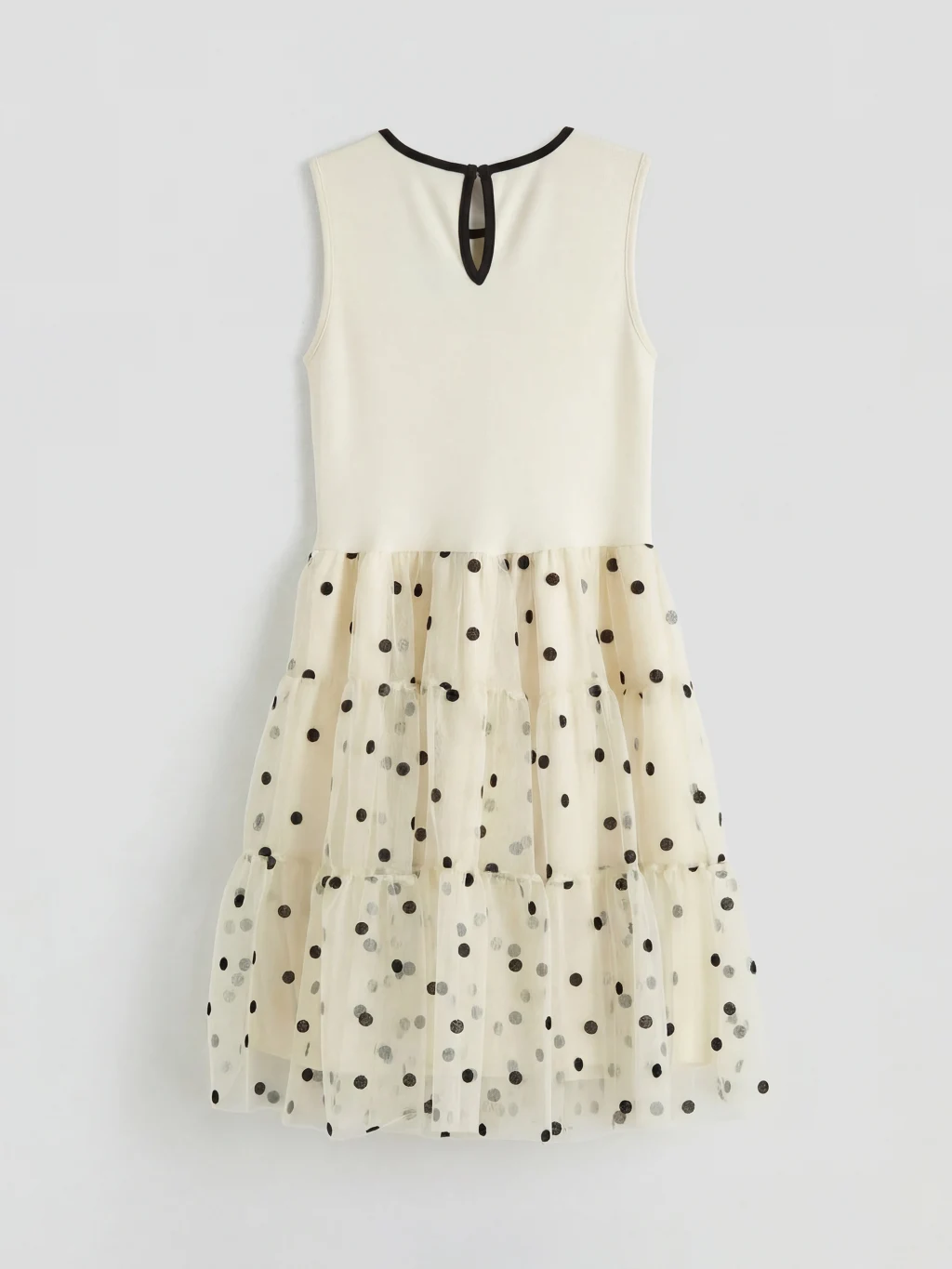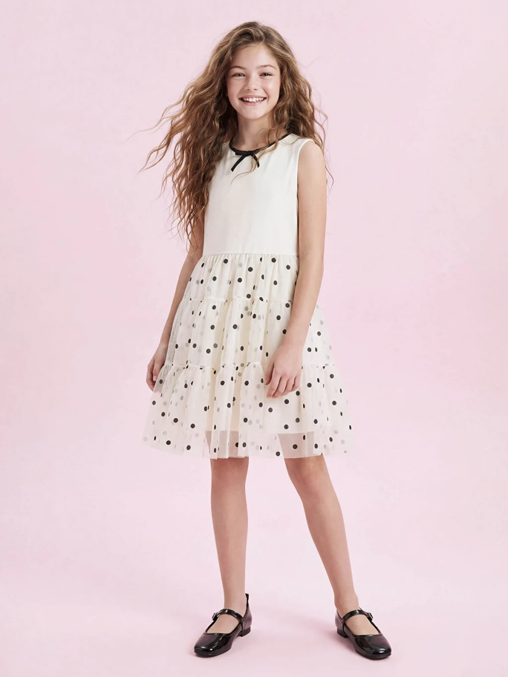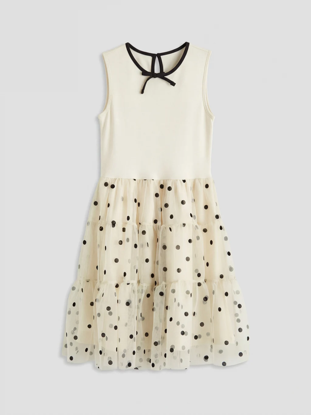 Bisiklet yakalı ve kolsuz kız çocuk elbise, yakasında fiyonk detayı bulunur. Puantiyeli ve katlı tül eteklidir. Üst kısmı %100 pamuktur.