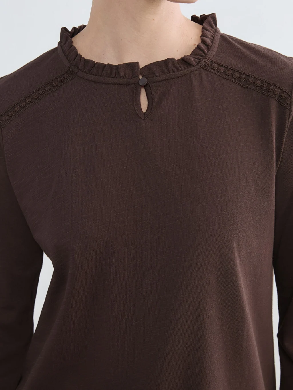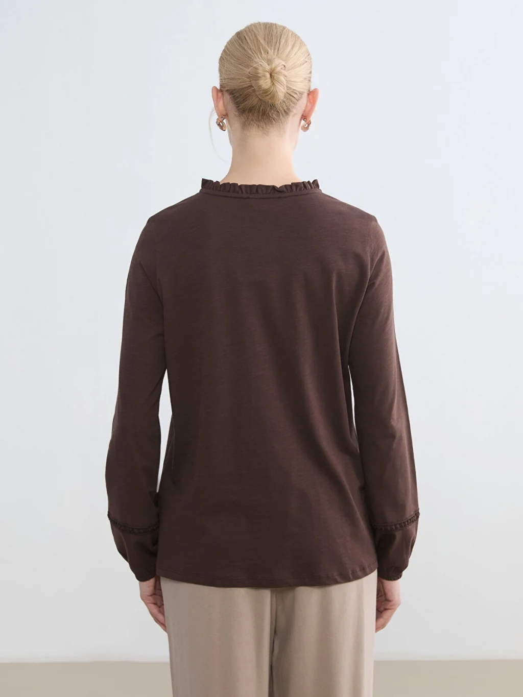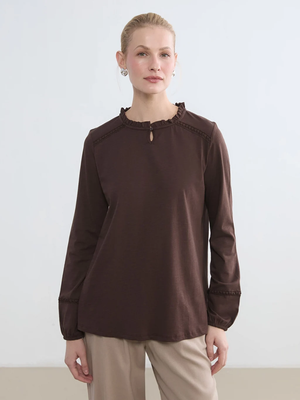 Fırfırlı yakalı kadın bluz, pamuklu penye kumaştan üretilmiştir. Uzun kollu, kol uçları lastikli ve tek düğme kapamalıdır.