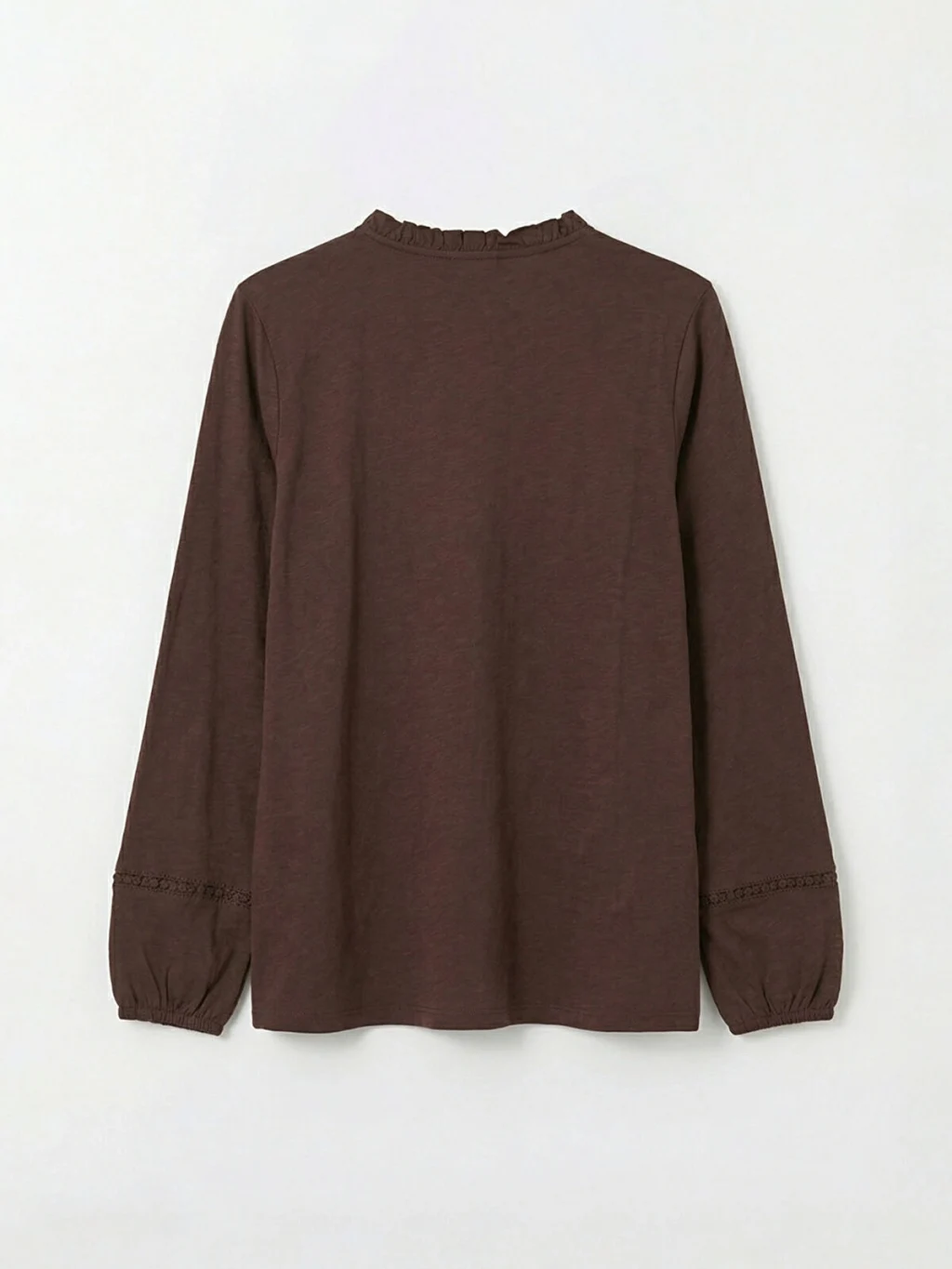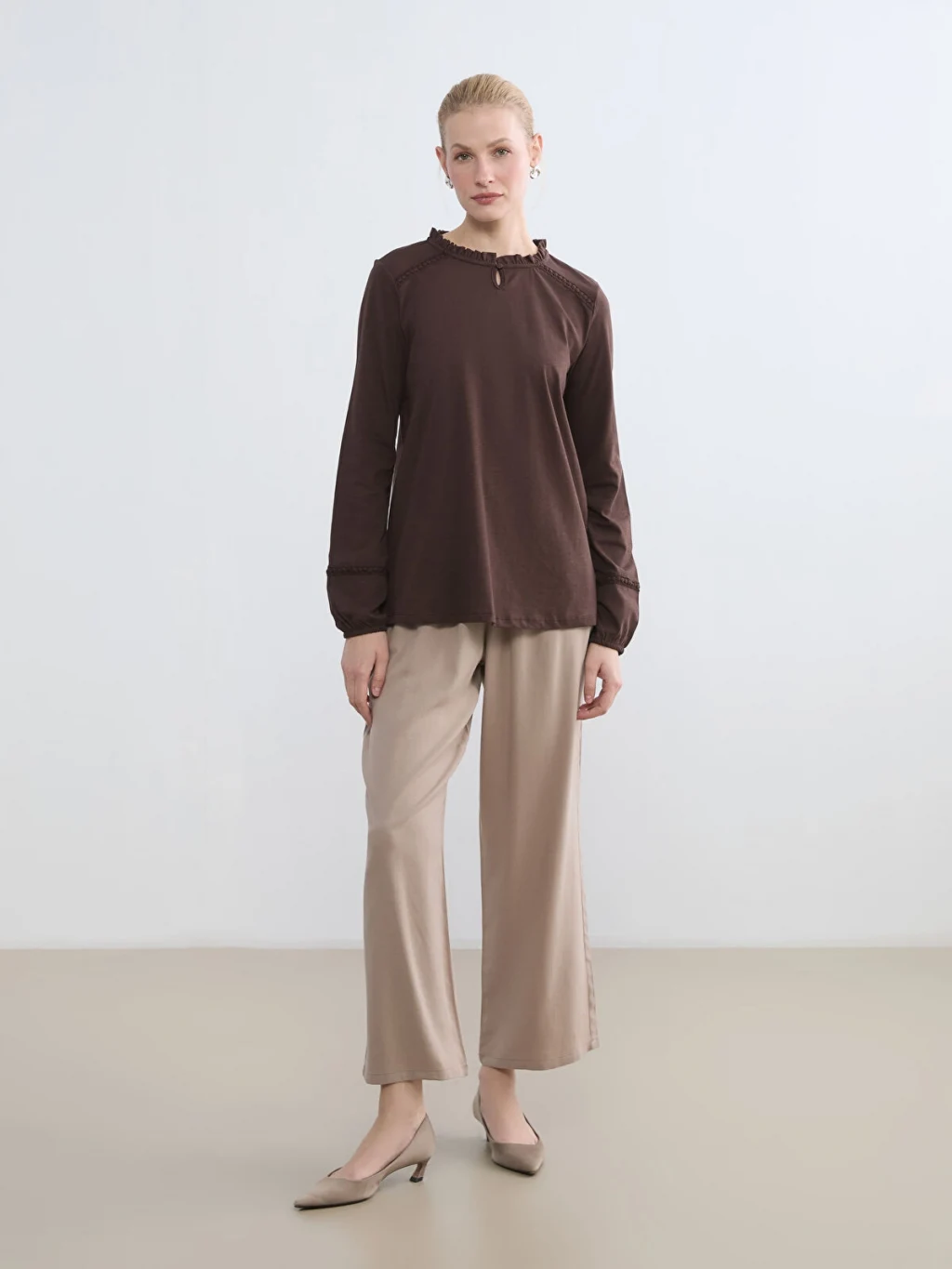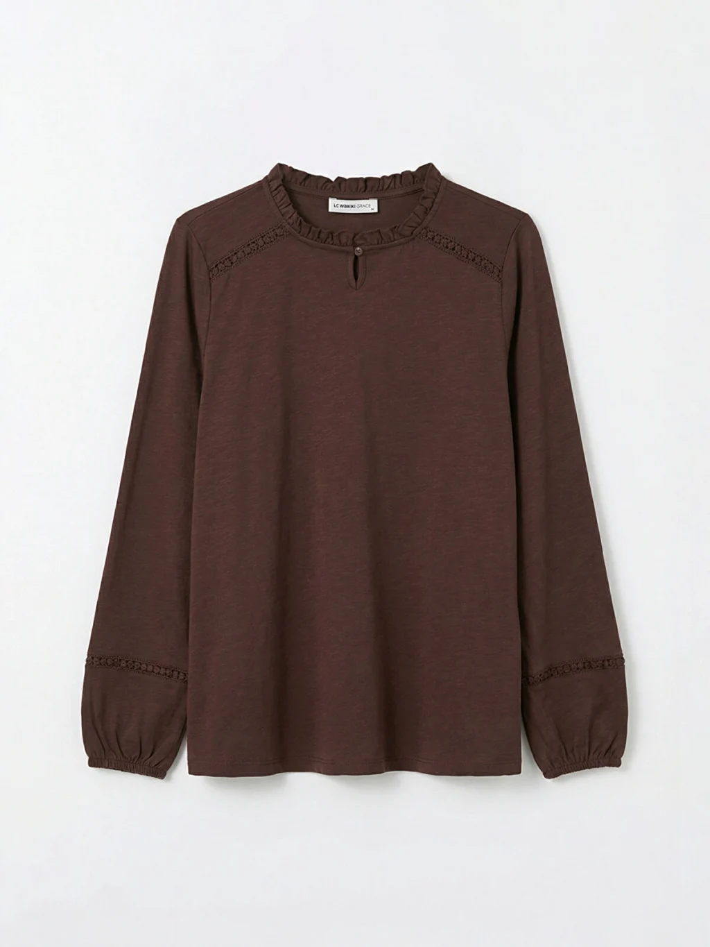 Fırfırlı yakalı kadın bluz, pamuklu penye kumaştan üretilmiştir. Uzun kollu, kol uçları lastikli ve tek düğme kapamalıdır.