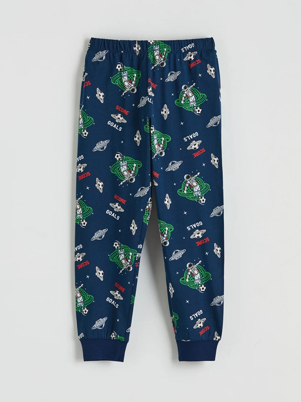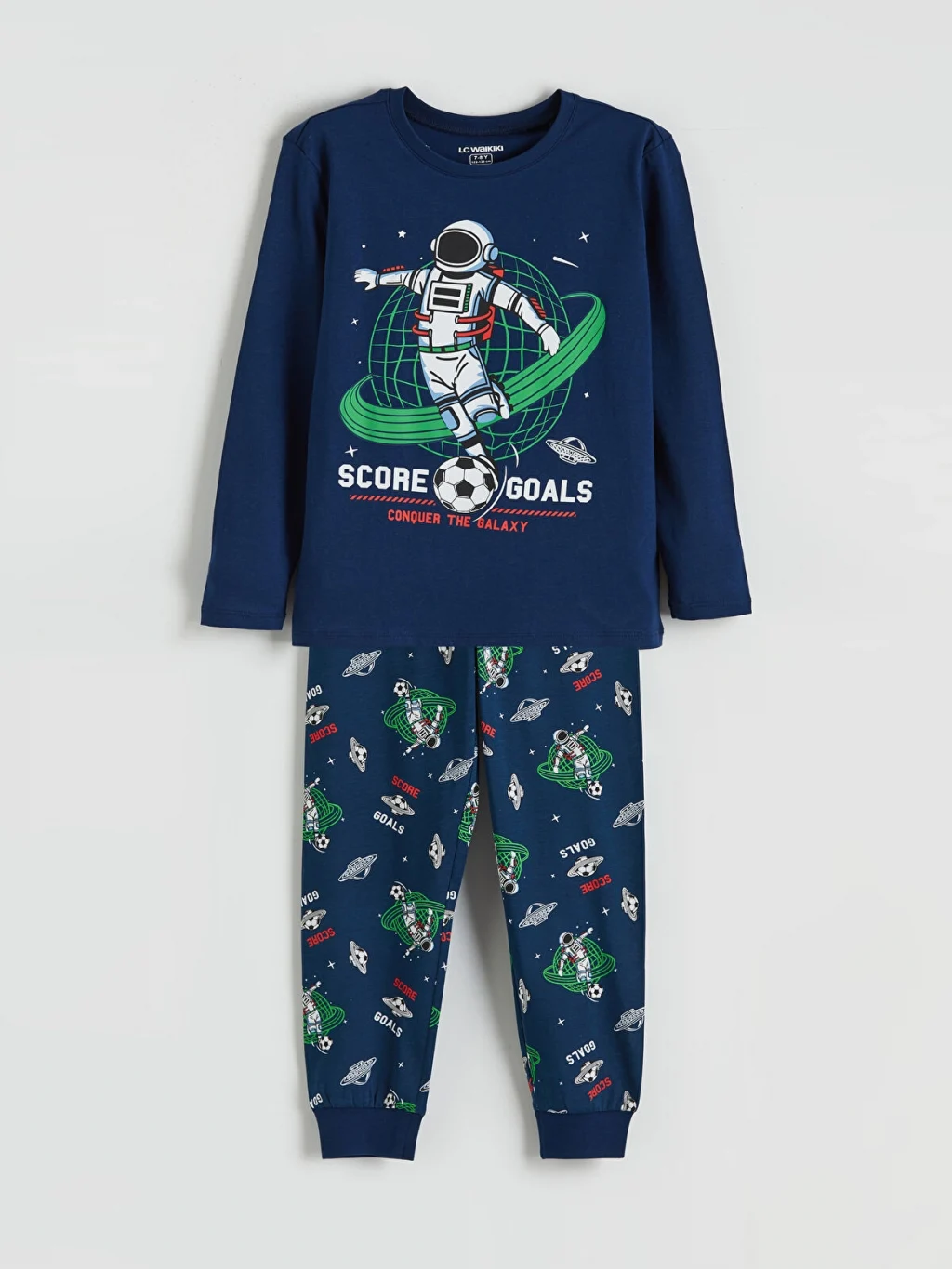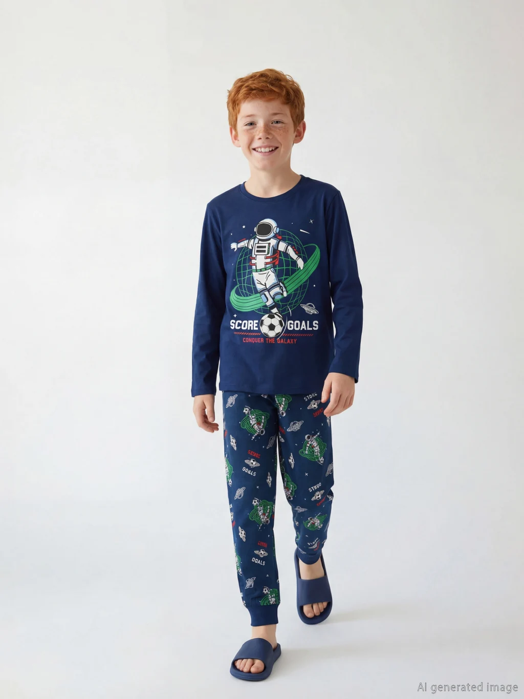 Erkek çocuk pijama takımı, %100 pamuklu penye kumaştan üretilmiştir. Bisiklet yaka, uzun kollu üst ve paçaları ribanalı desenli alt parçadan oluşur.