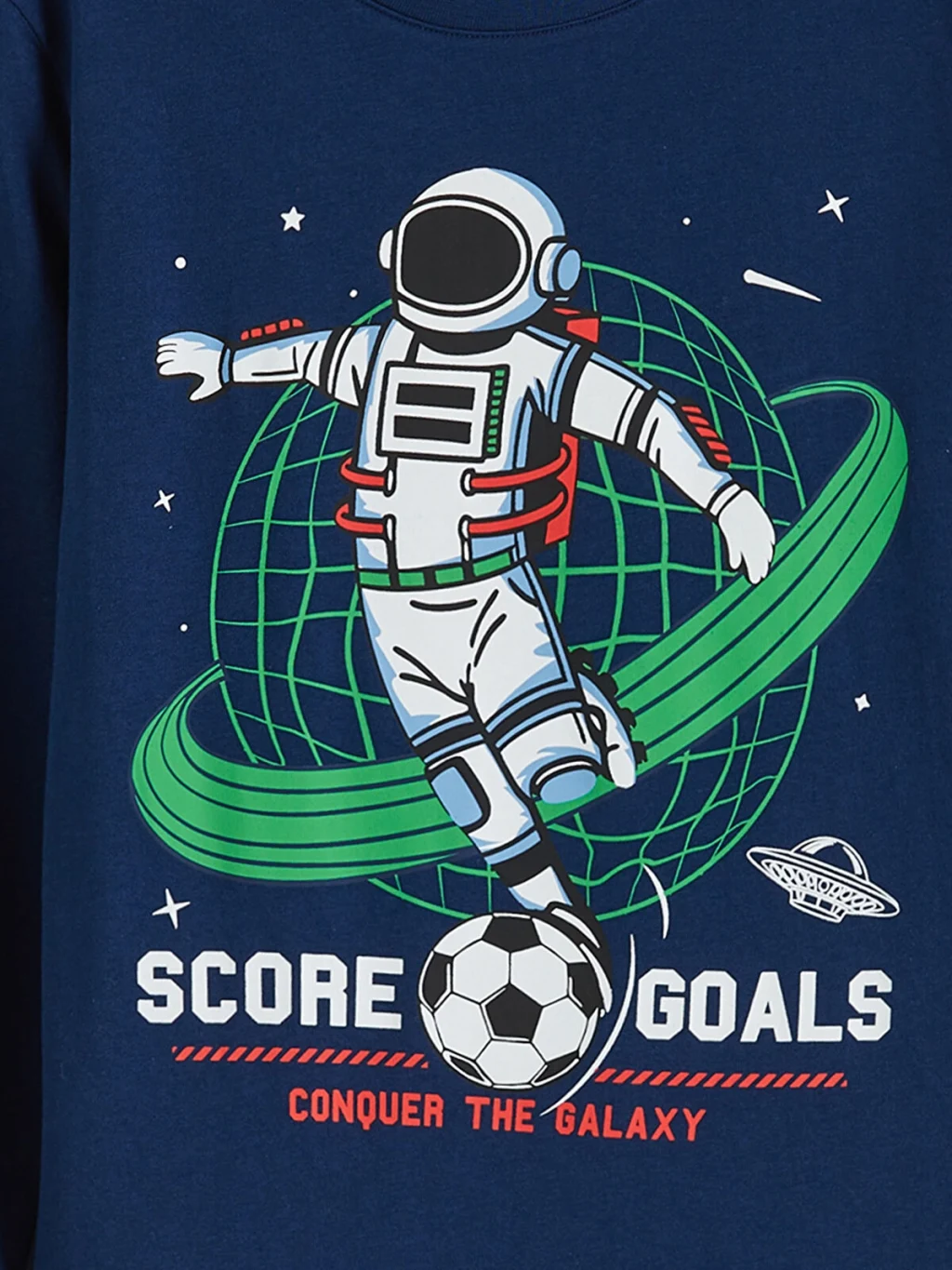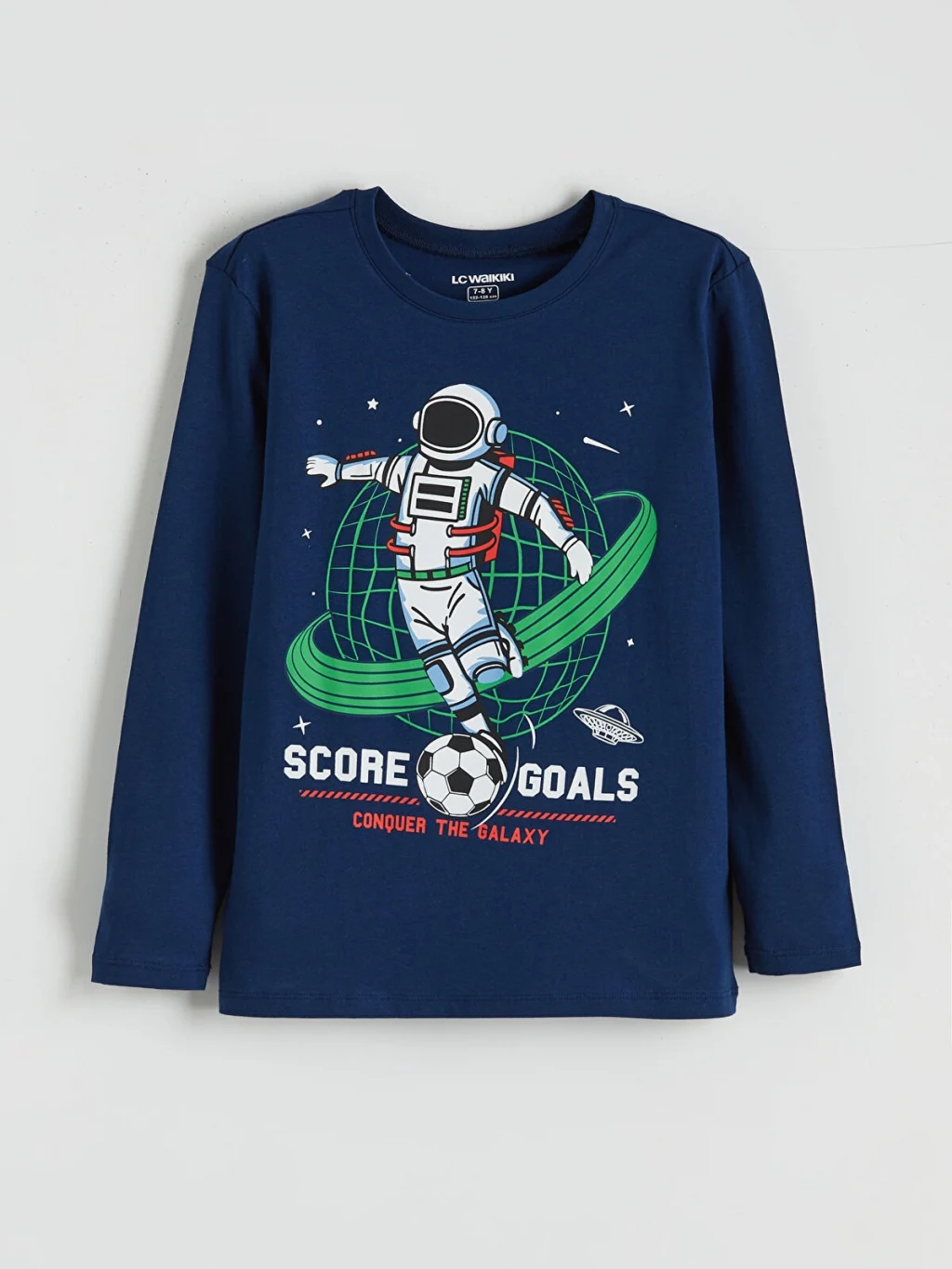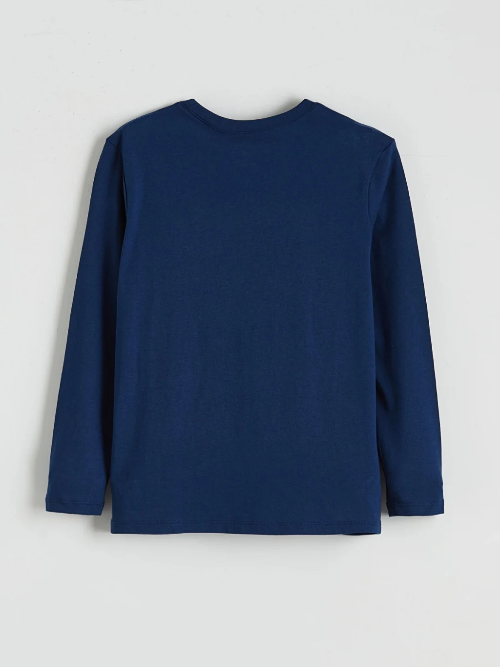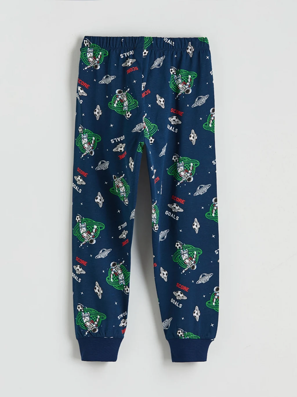 Erkek çocuk pijama takımı, %100 pamuklu penye kumaştan üretilmiştir. Bisiklet yaka, uzun kollu üst ve paçaları ribanalı desenli alt parçadan oluşur.