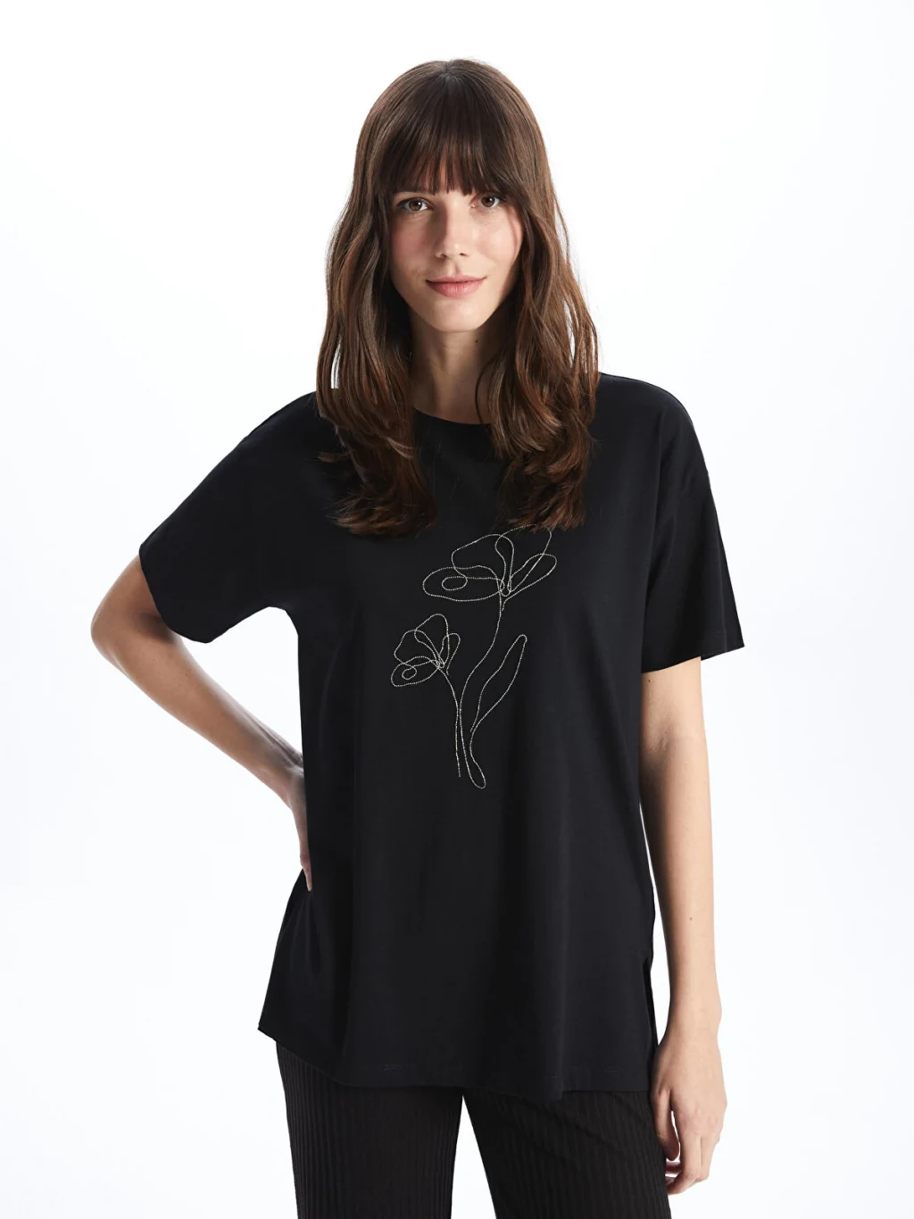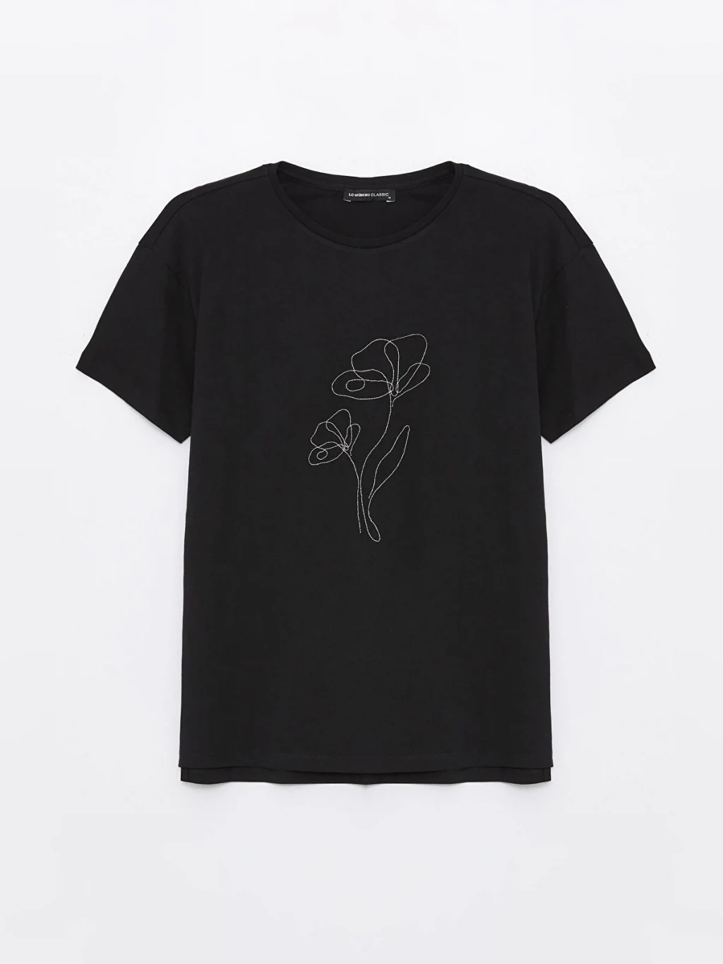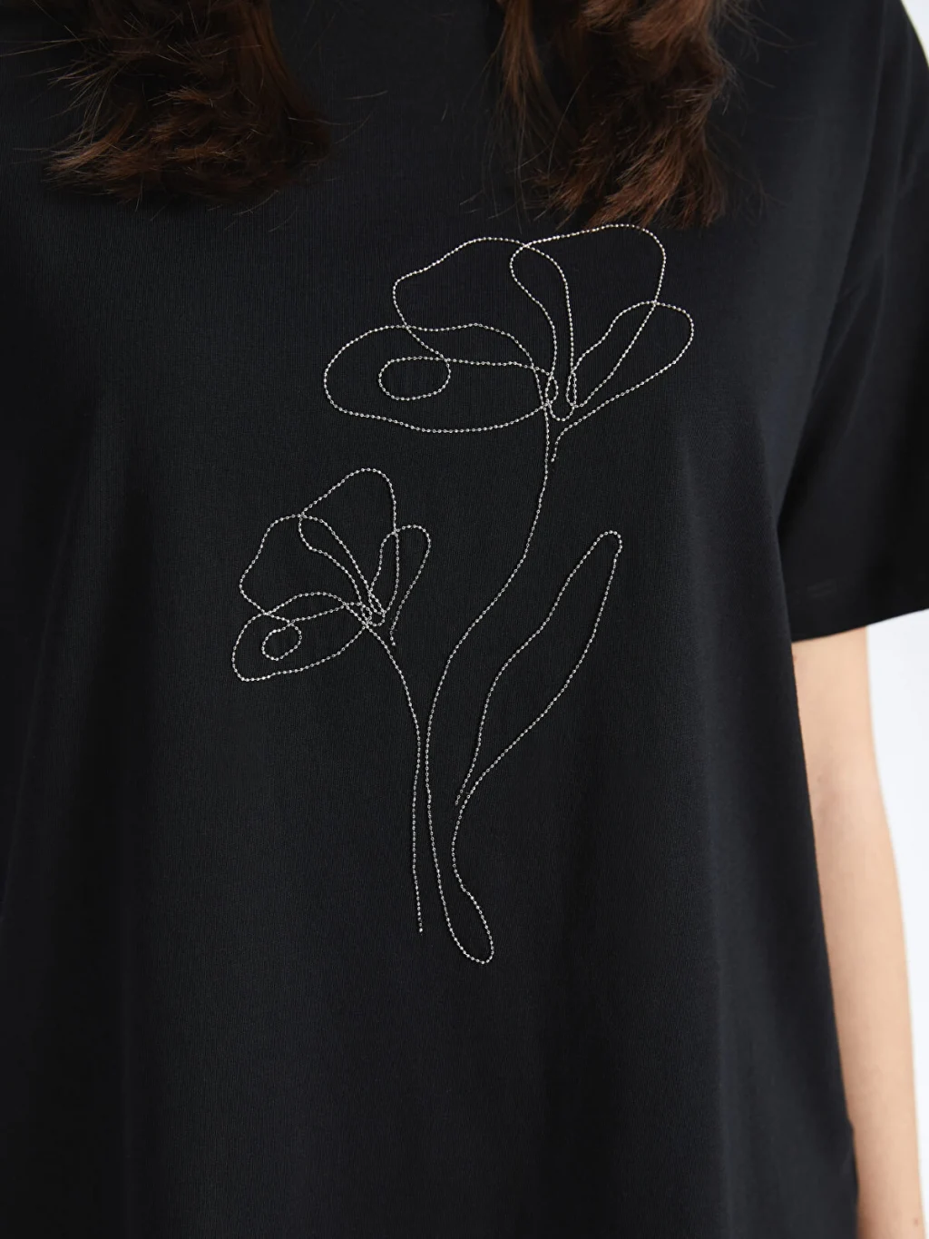 Bisiklet yaka parlak taş baskılı kısa kollu tişört, süprem kumaştan üretilmiştir. Hafif ve nefes alabilen yapısı ile gün boyu konfor sunar. İki yandan yırtmaç detaylı tasarımı sayesinde hareket özgürlüğü sağlar.