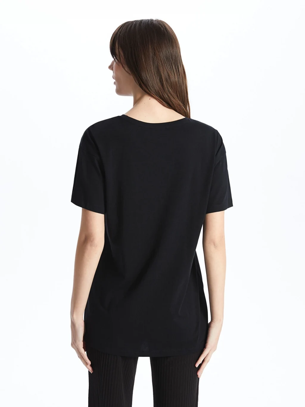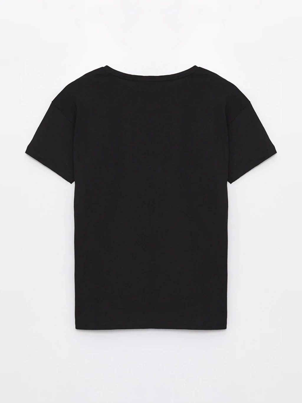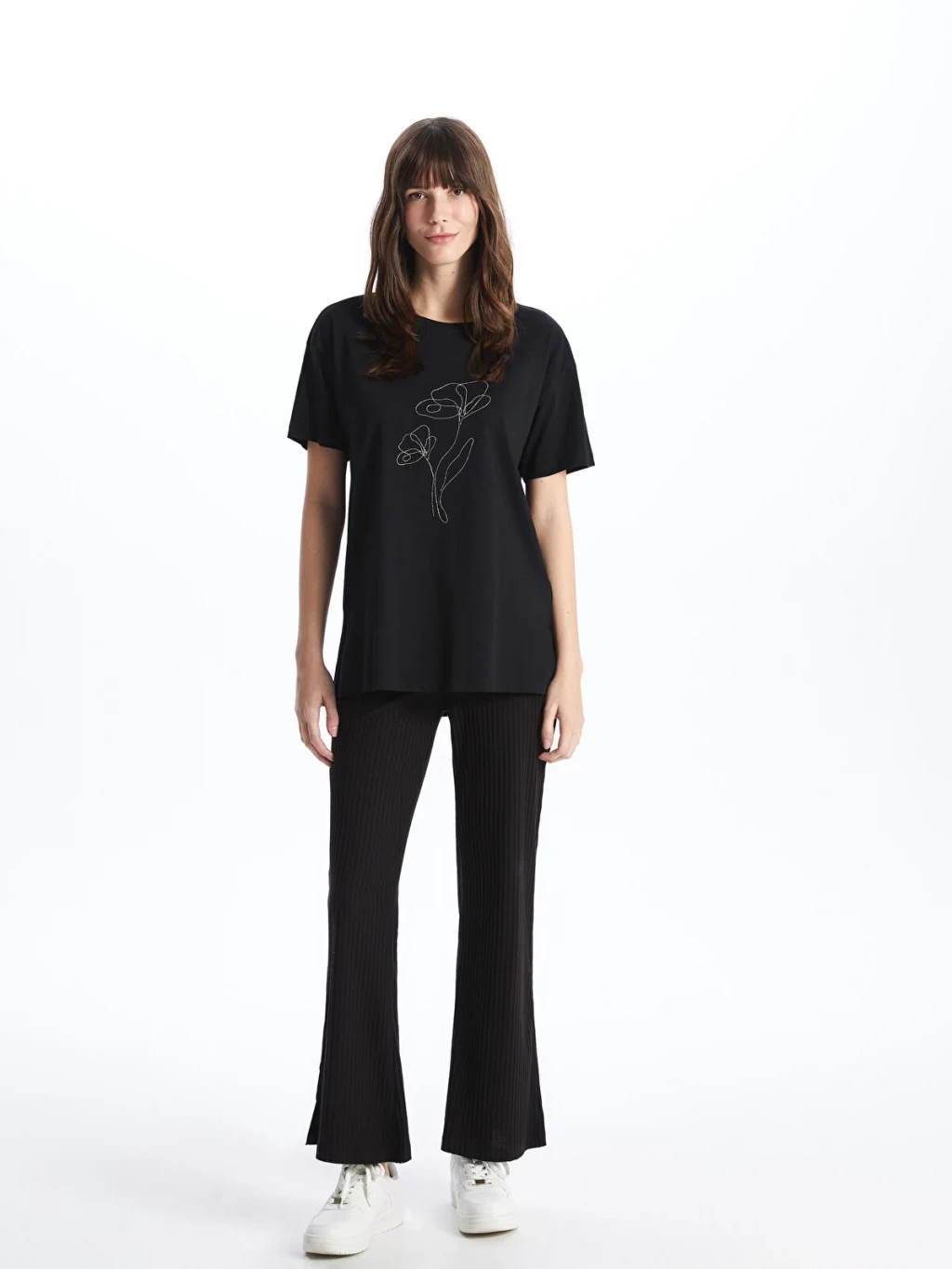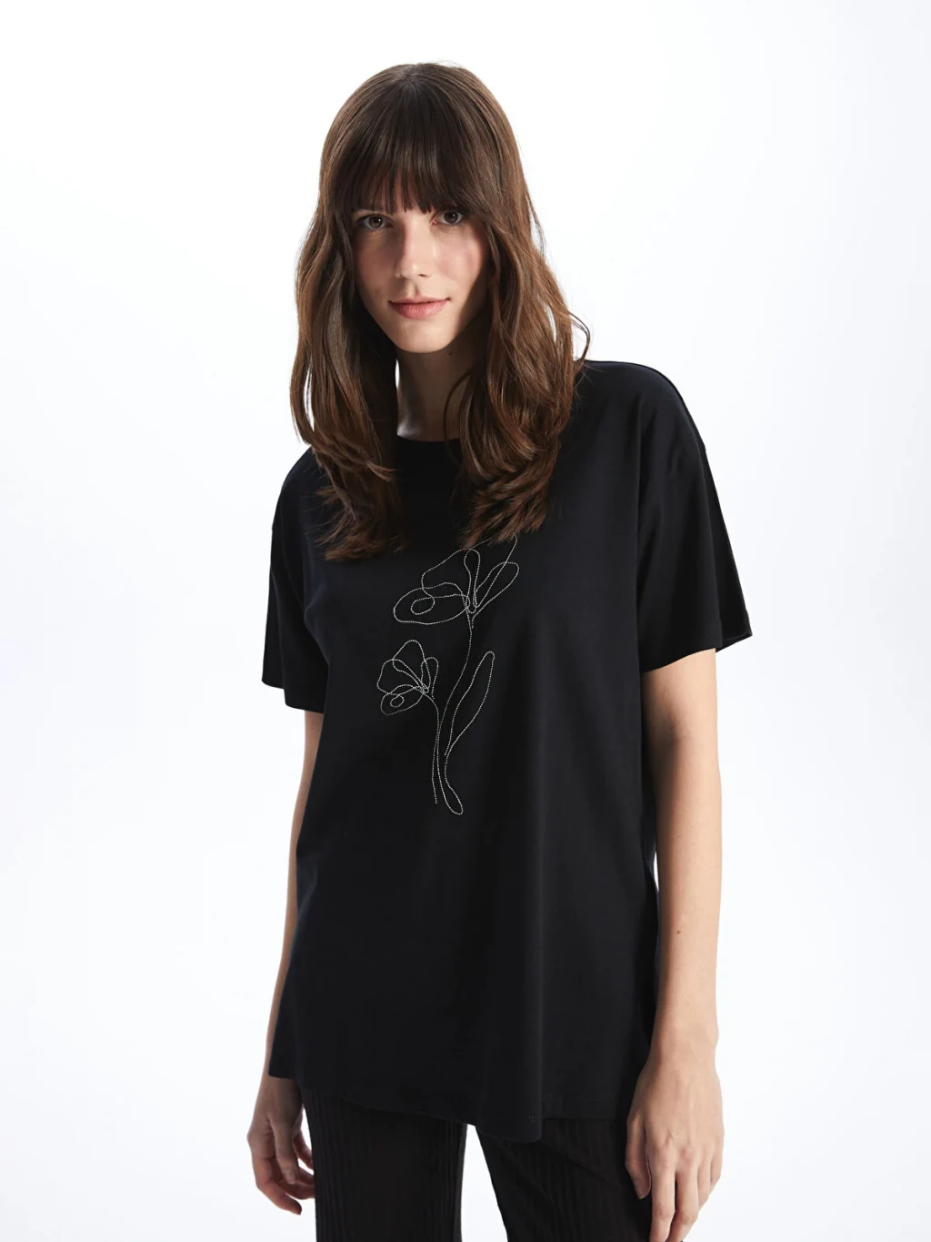 Bisiklet yaka parlak taş baskılı kısa kollu tişört, süprem kumaştan üretilmiştir. Hafif ve nefes alabilen yapısı ile gün boyu konfor sunar. İki yandan yırtmaç detaylı tasarımı sayesinde hareket özgürlüğü sağlar.