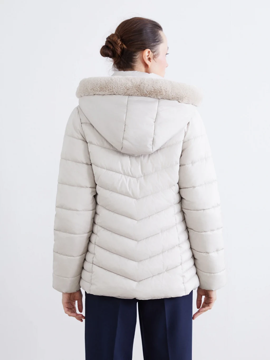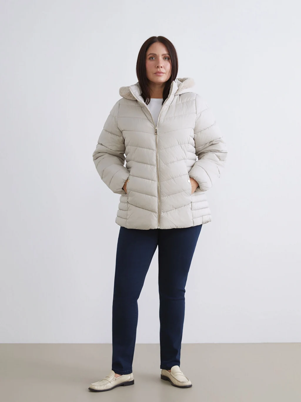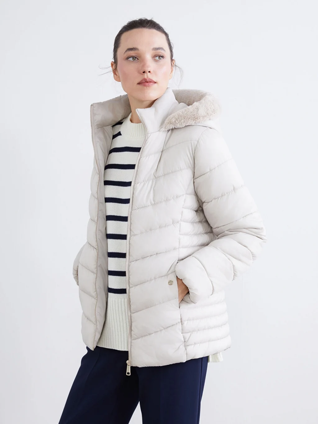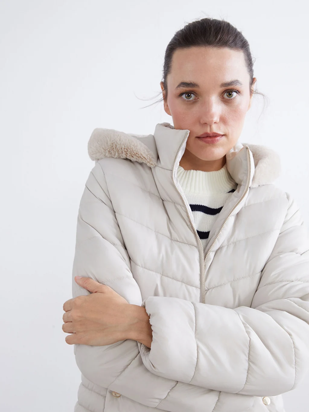 Kapüşonu pelüş astarlı, dik yakalı kadın şişme mont, önden fermuar kapamalıdır. Uzun kolludur ve yanlarda iki adet cebi bulunur.
