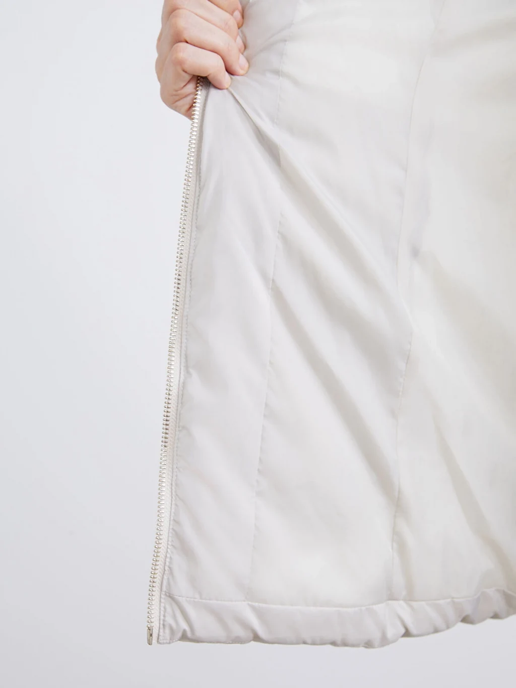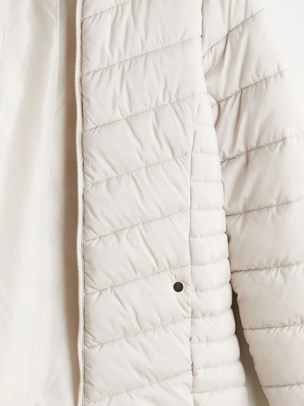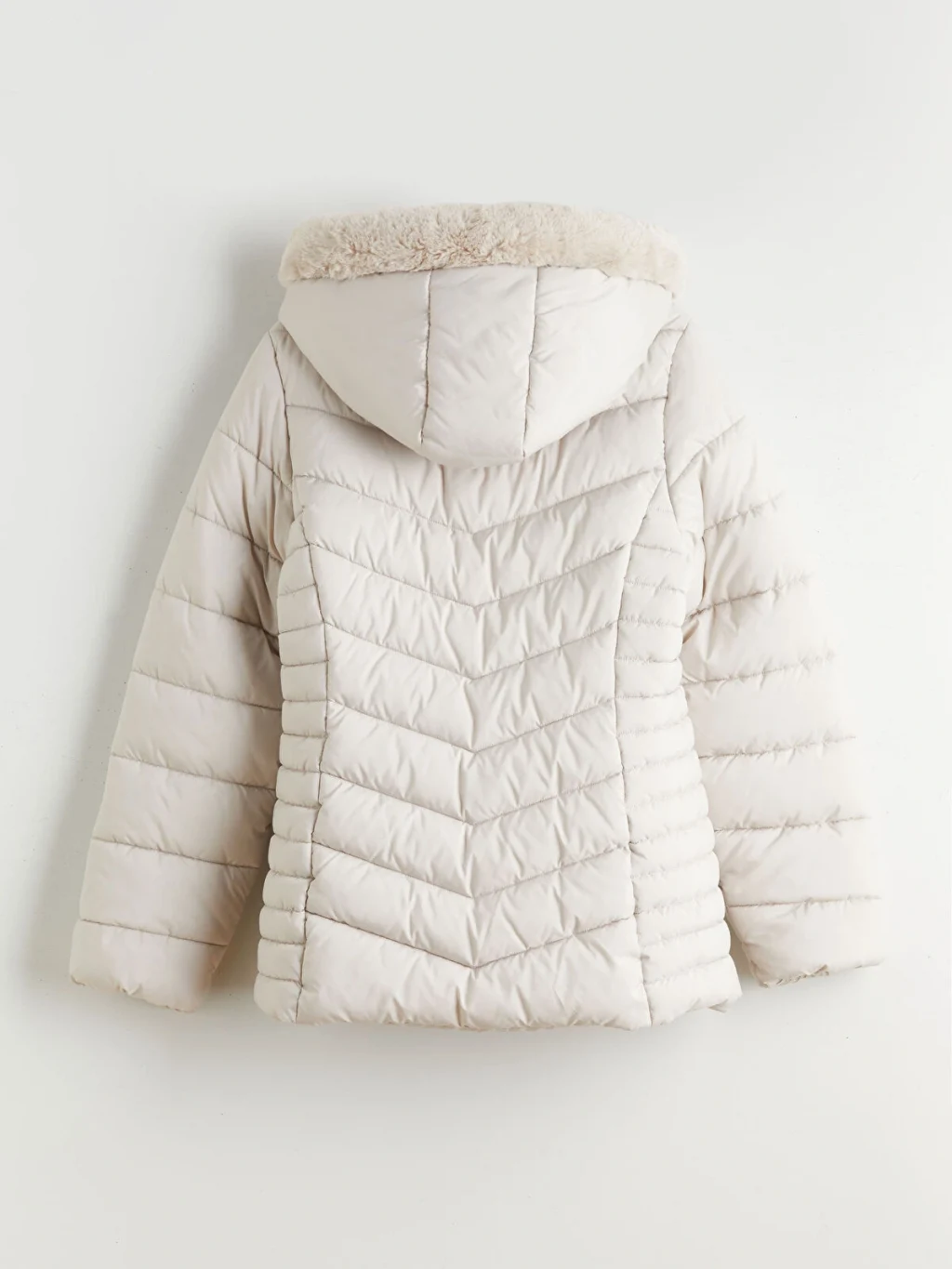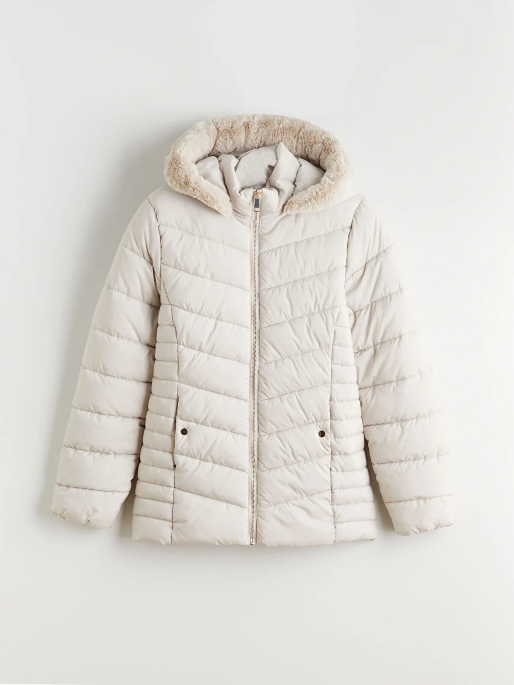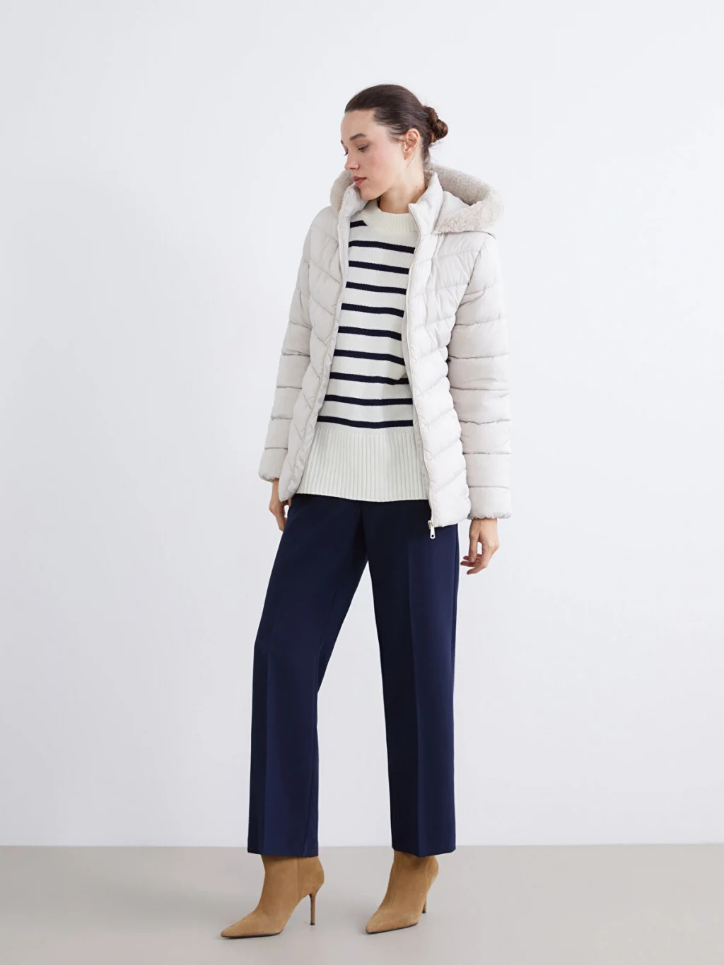 Kapüşonu pelüş astarlı, dik yakalı kadın şişme mont, önden fermuar kapamalıdır. Uzun kolludur ve yanlarda iki adet cebi bulunur.