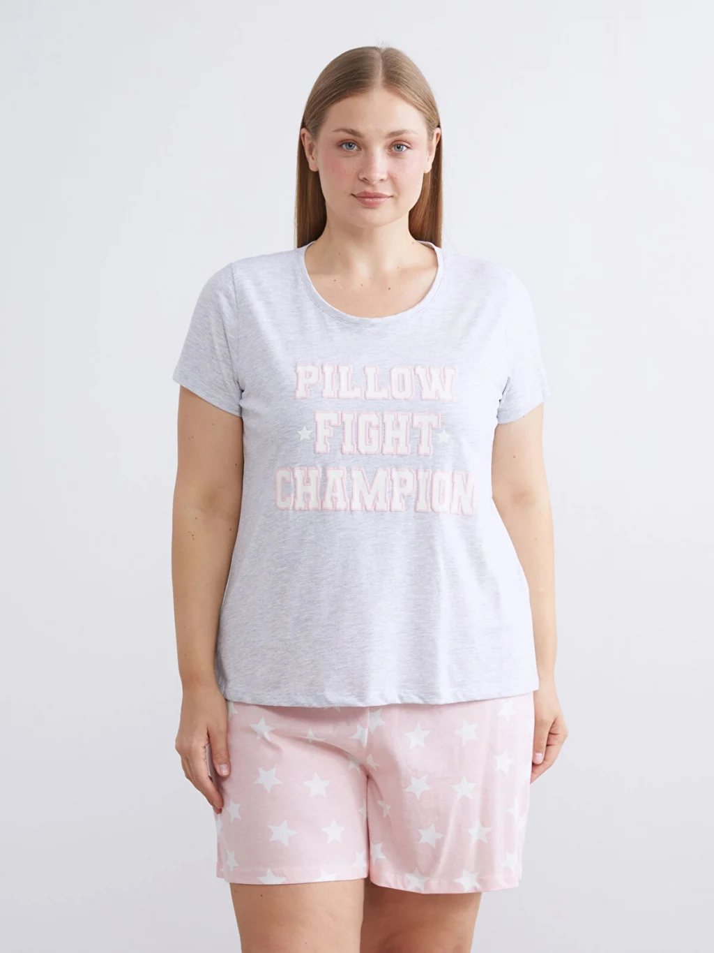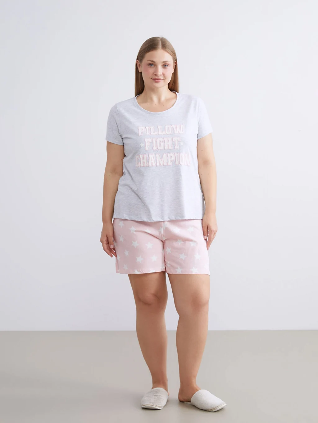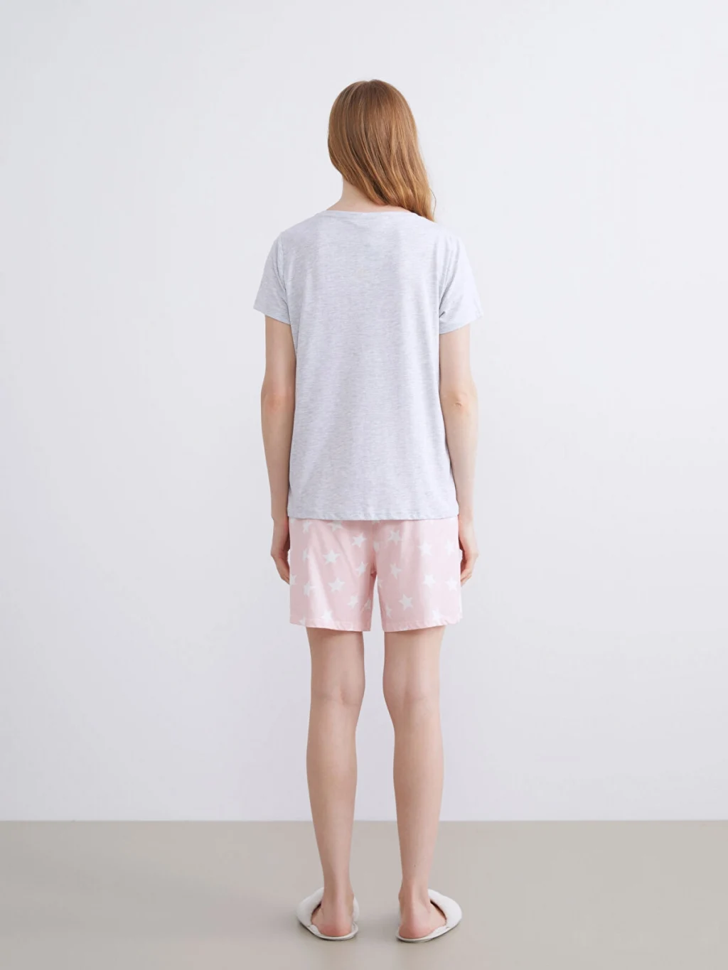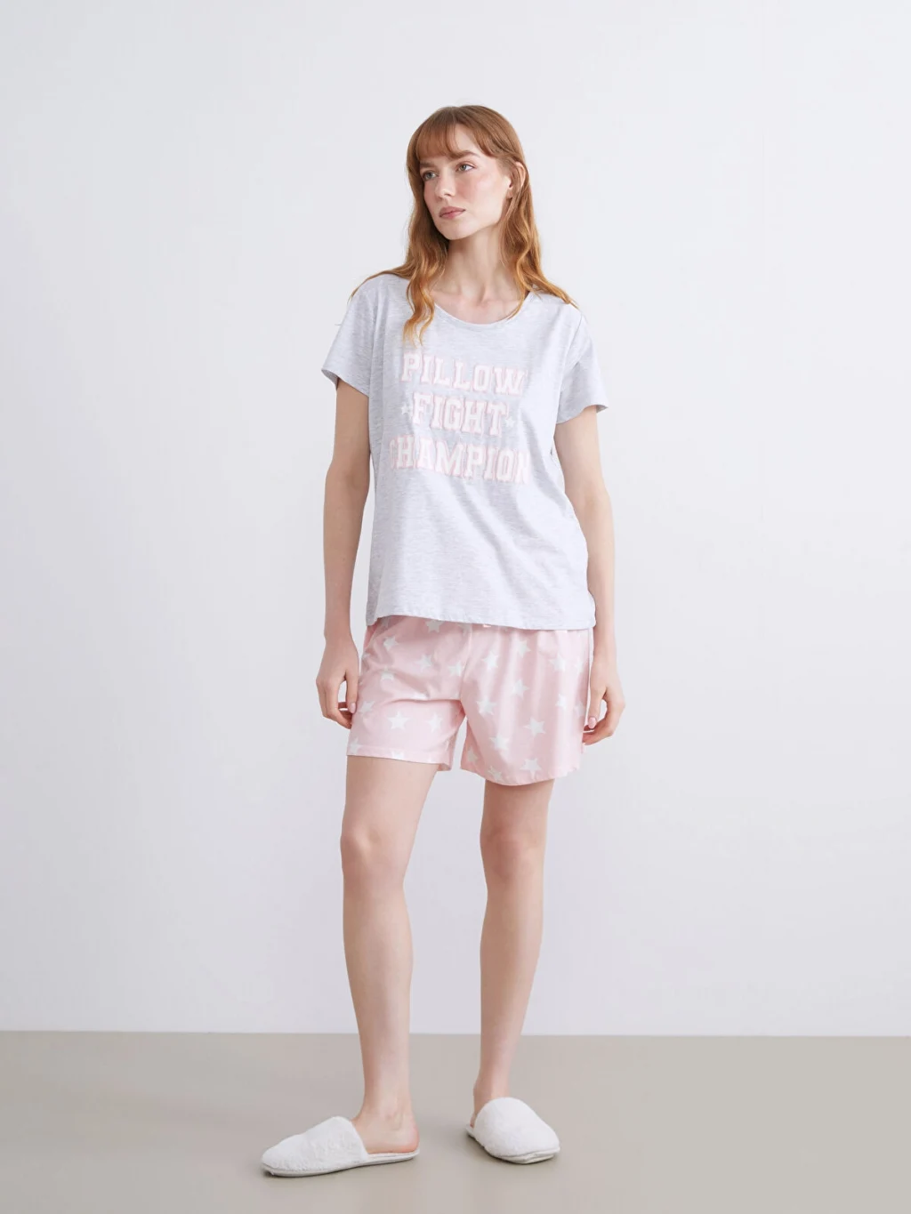Kadın pijama takımı, bisiklet yaka, kısa kollu pijama üstü ve beli lastikli, şortlu pijama altından oluşur. Süprem kumaştan üretilmiştir.