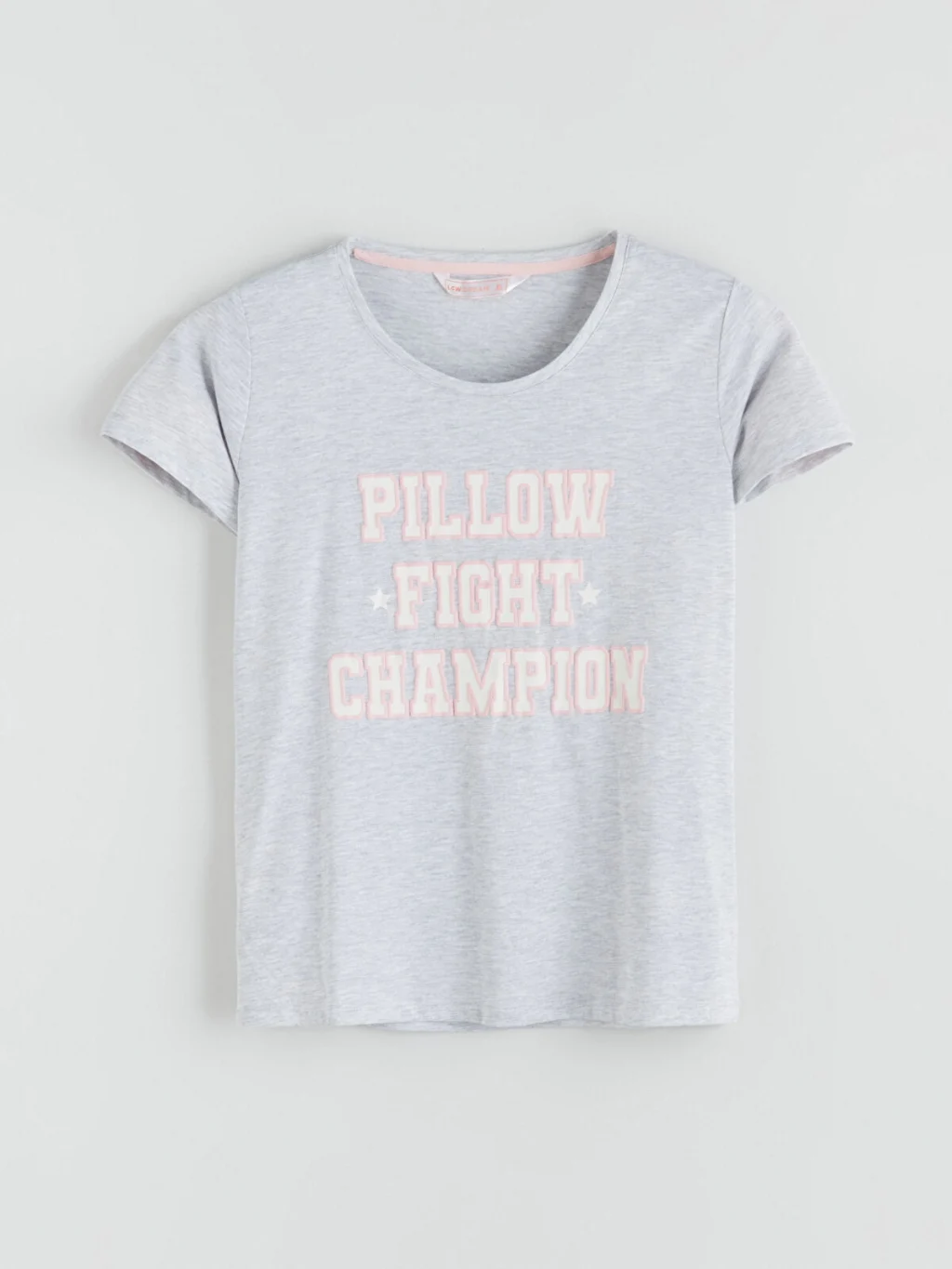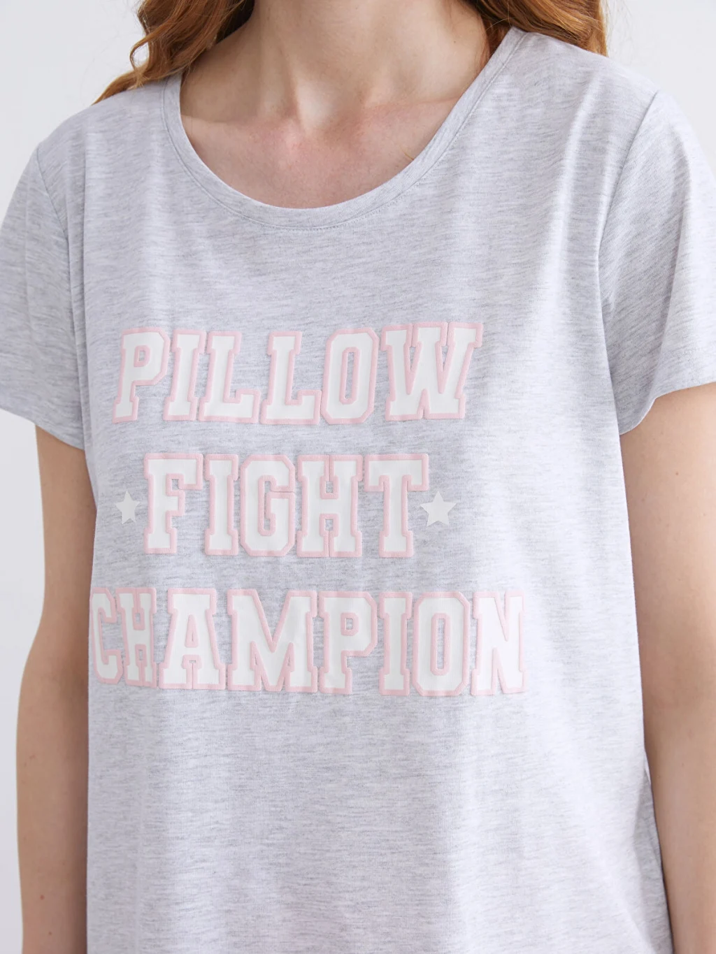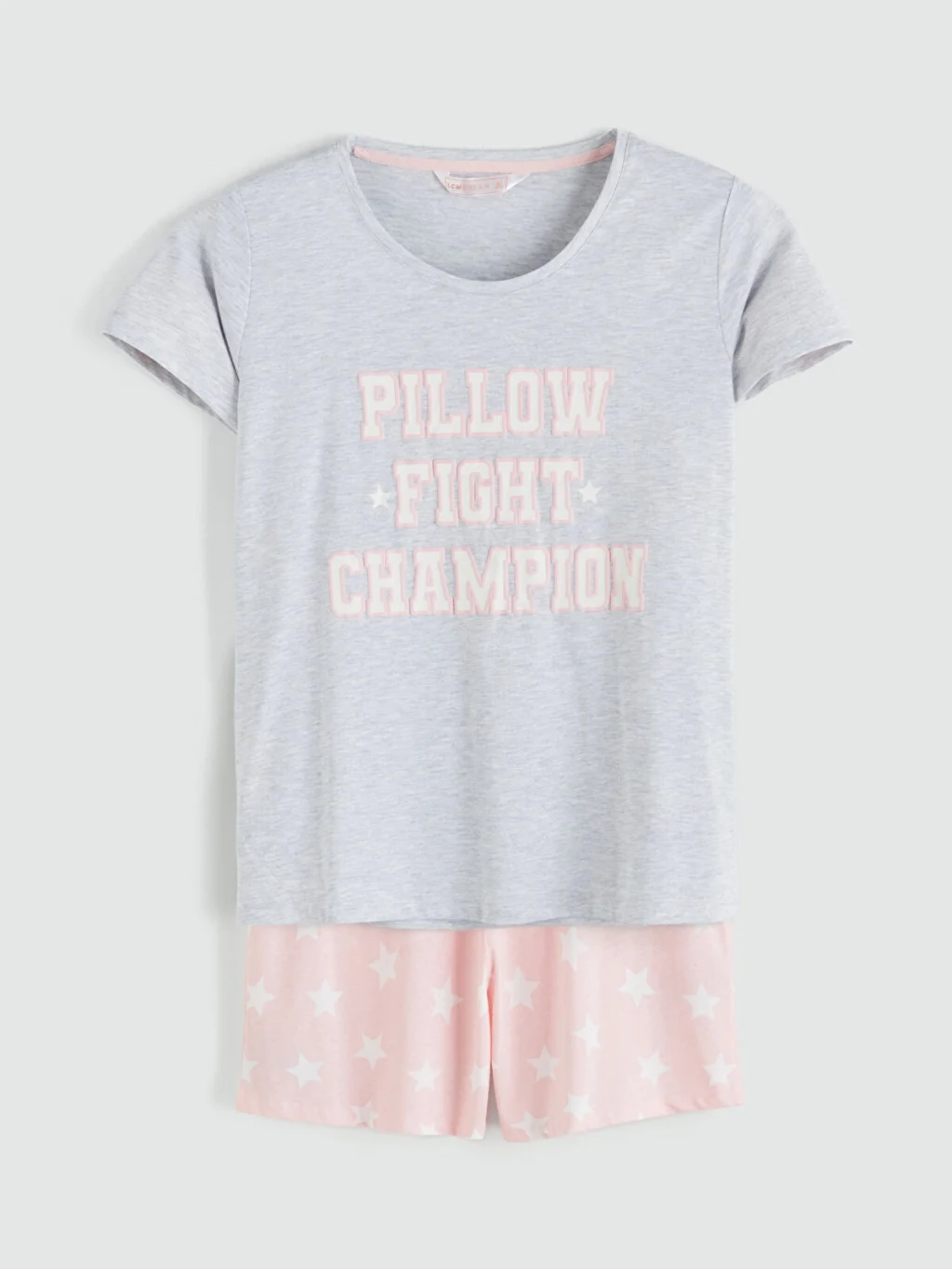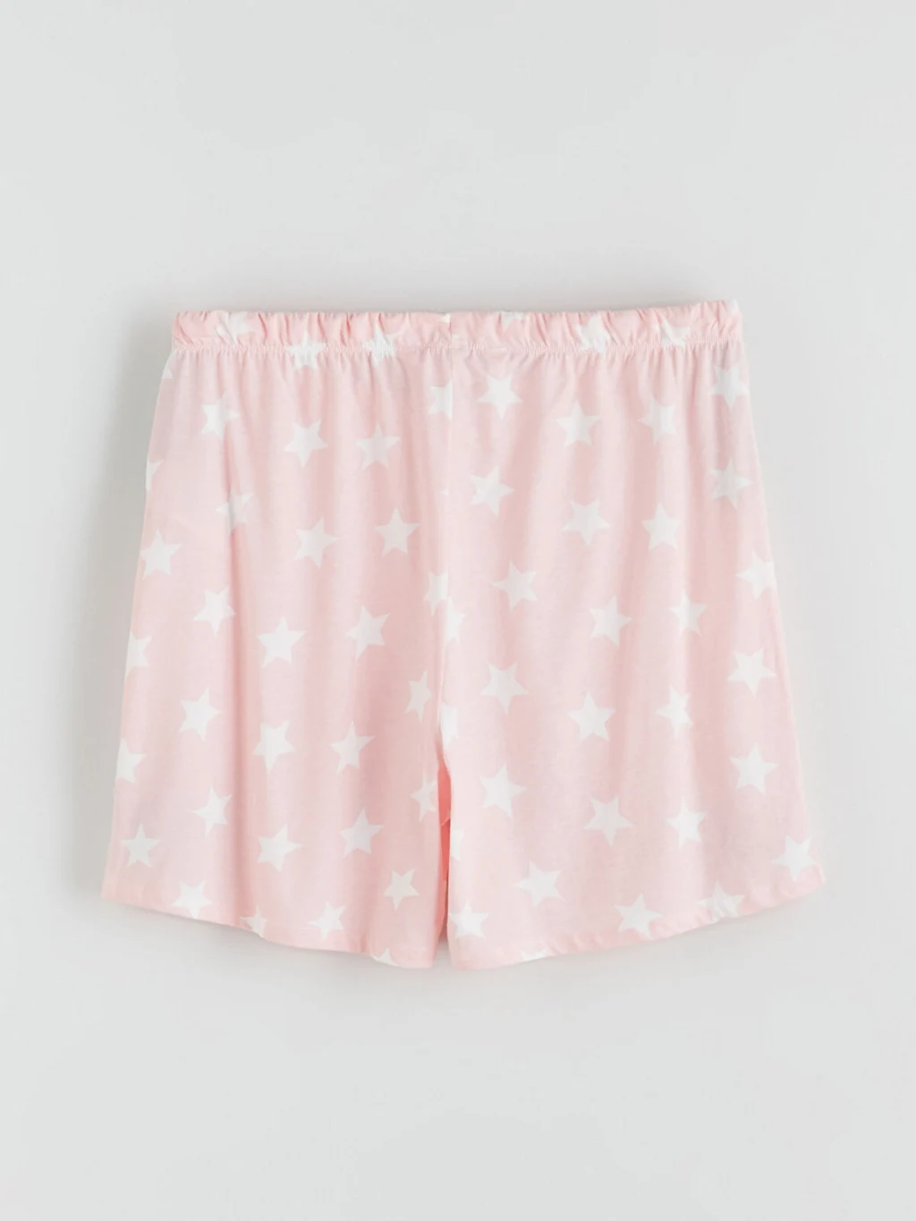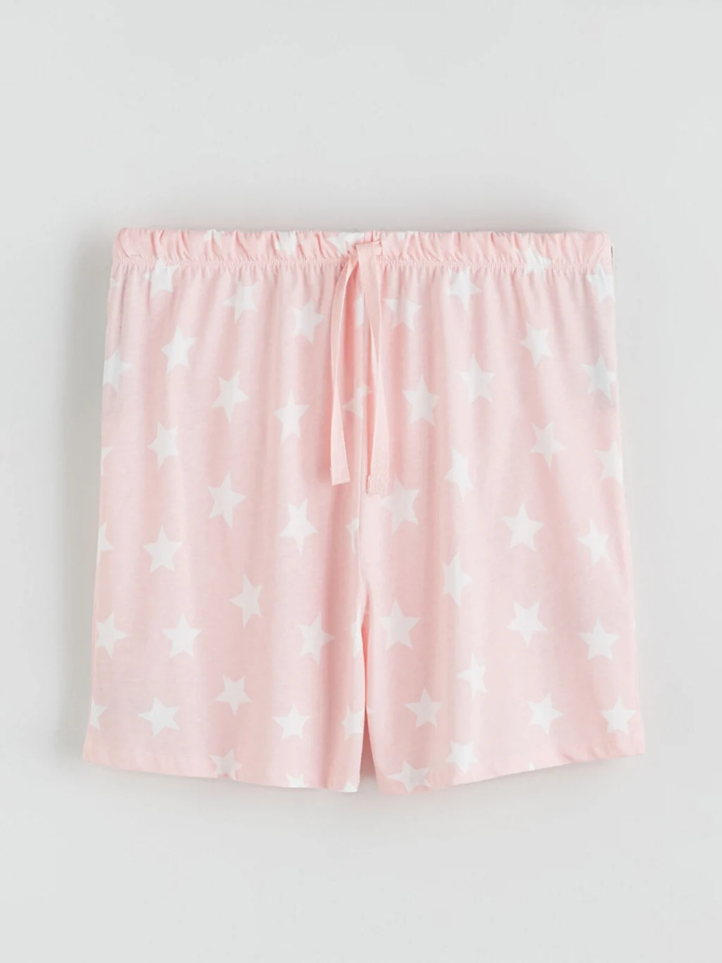 Kadın pijama takımı, bisiklet yaka, kısa kollu pijama üstü ve beli lastikli, şortlu pijama altından oluşur. Süprem kumaştan üretilmiştir.