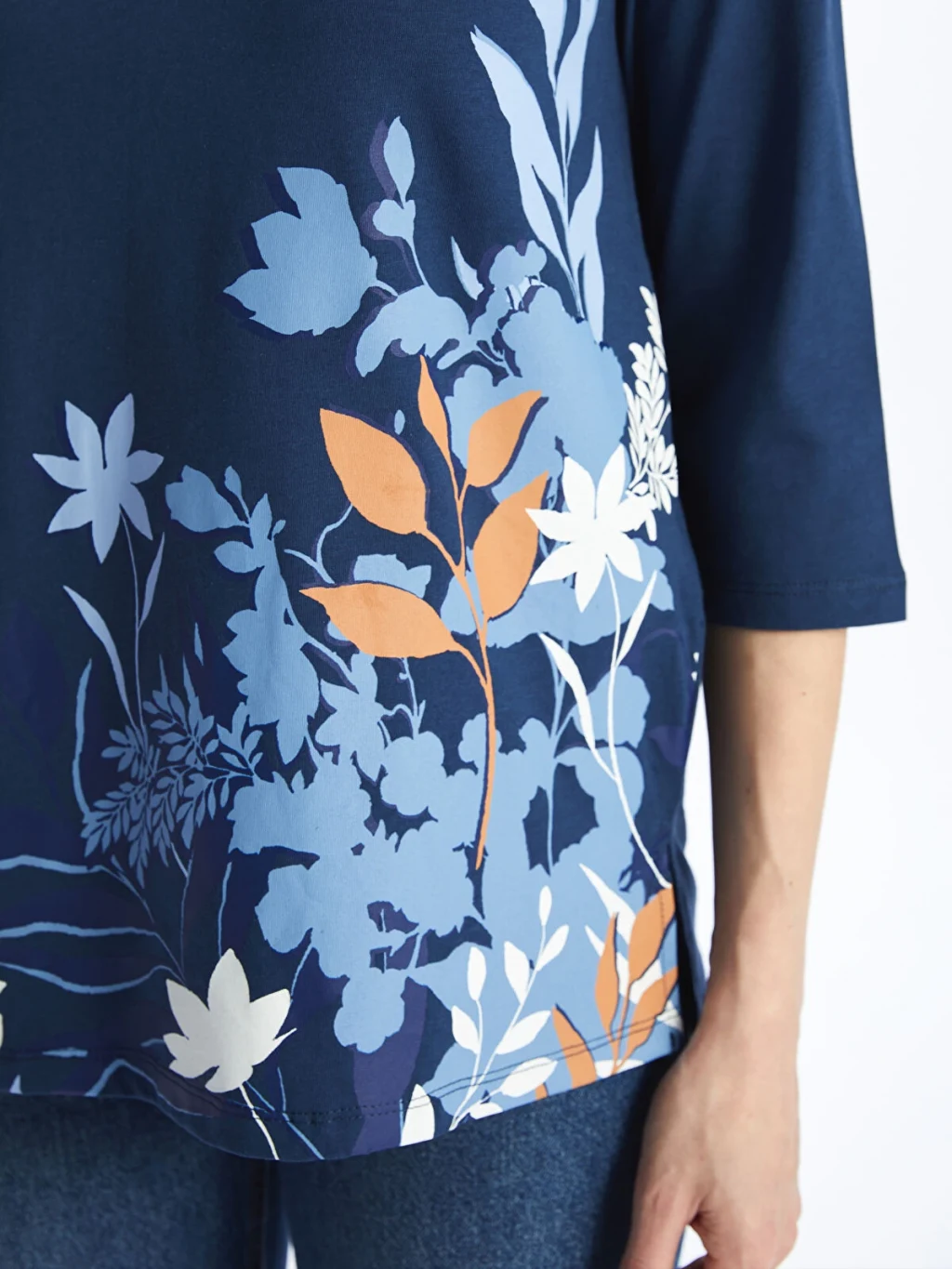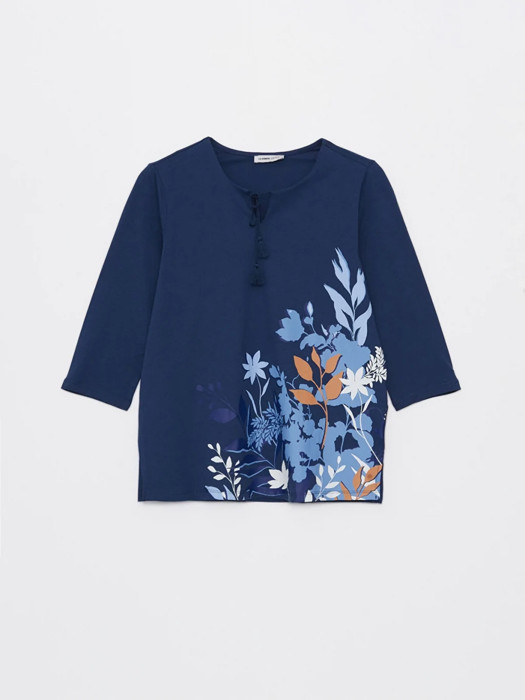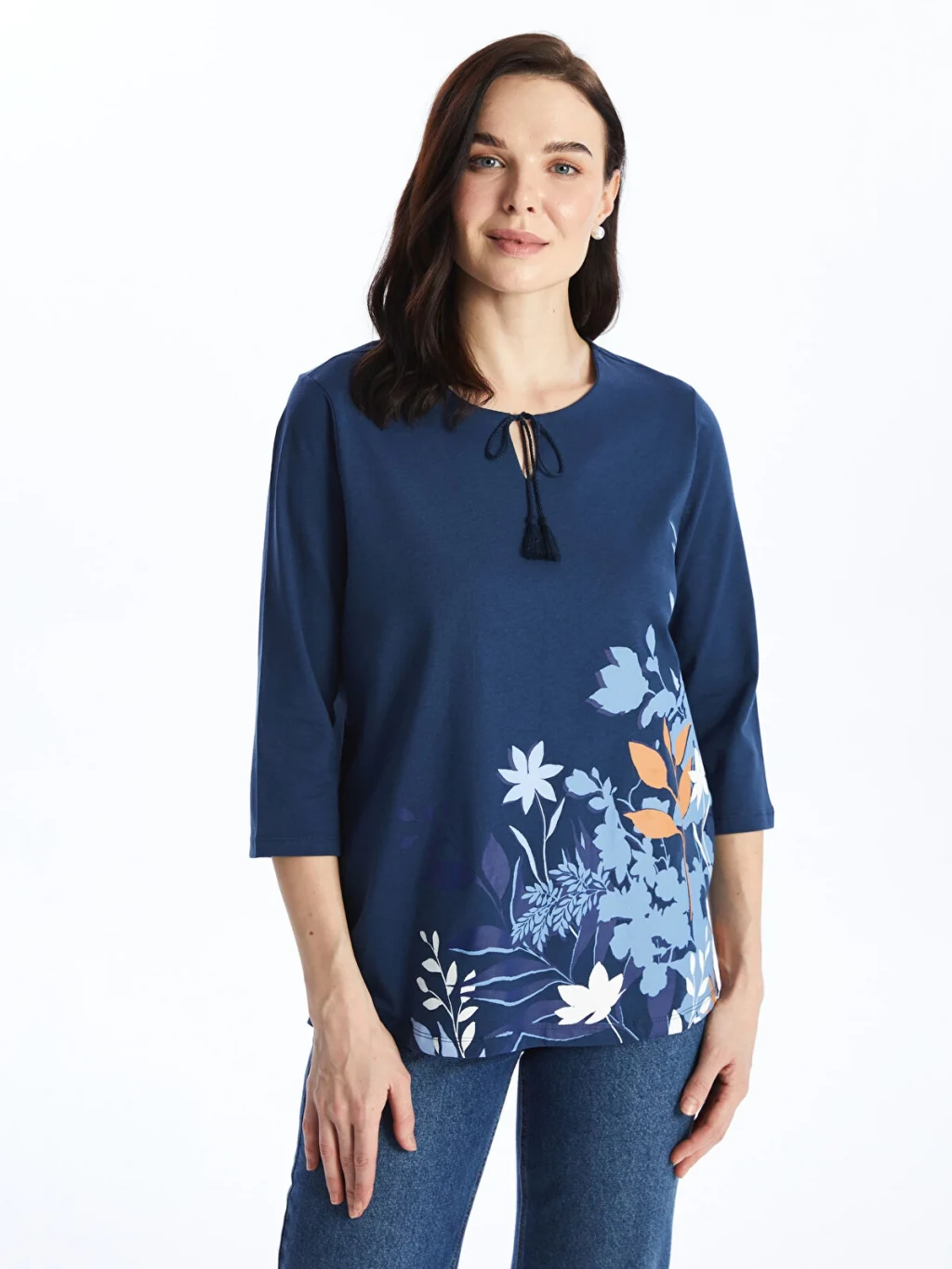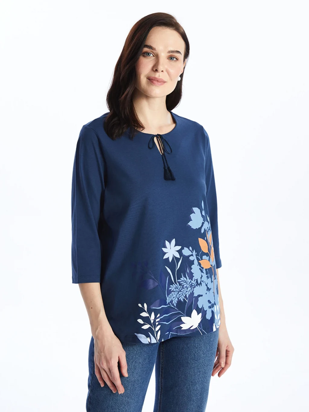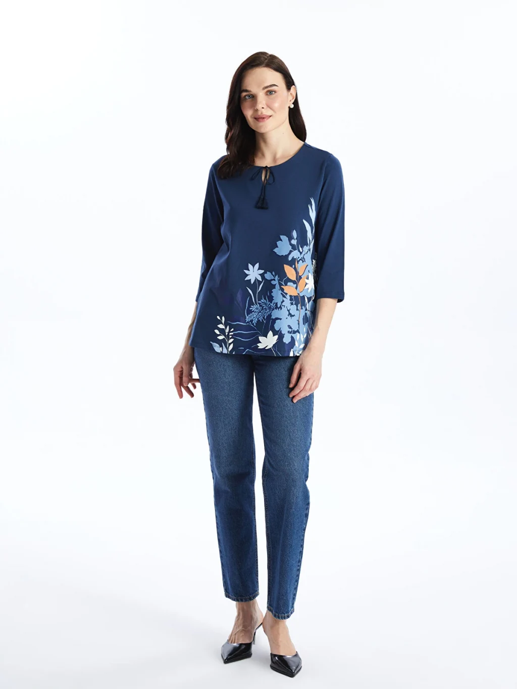 Bağlamalı yaka çiçekli bluz, pamuklu elyaftan üretilmiştir. Yumuşak ve nefes alabilen kumaşı ile gün boyu konfor sunar. 3/4 kol boyu uzunluğuna sahiptir.
