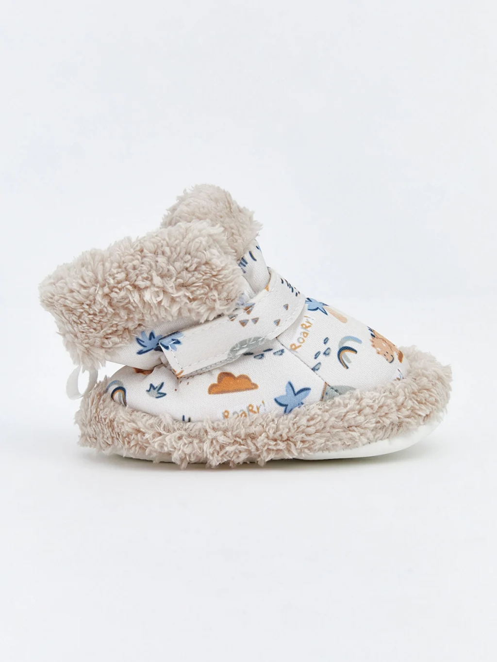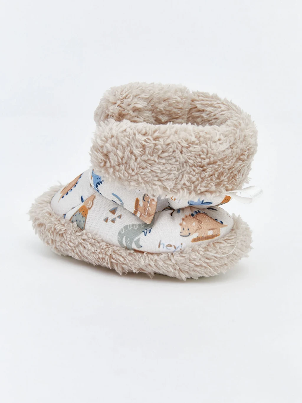 Pelüş astarlı ve dinozor desenli erkek bebek yürüme öncesi ayakkabı, cırt cırt bant kapamalı tasarıma sahiptir.
