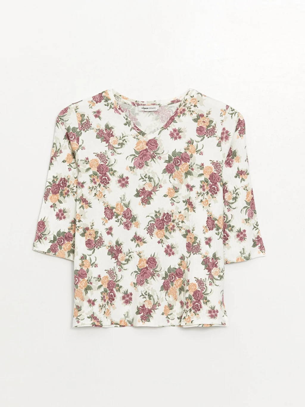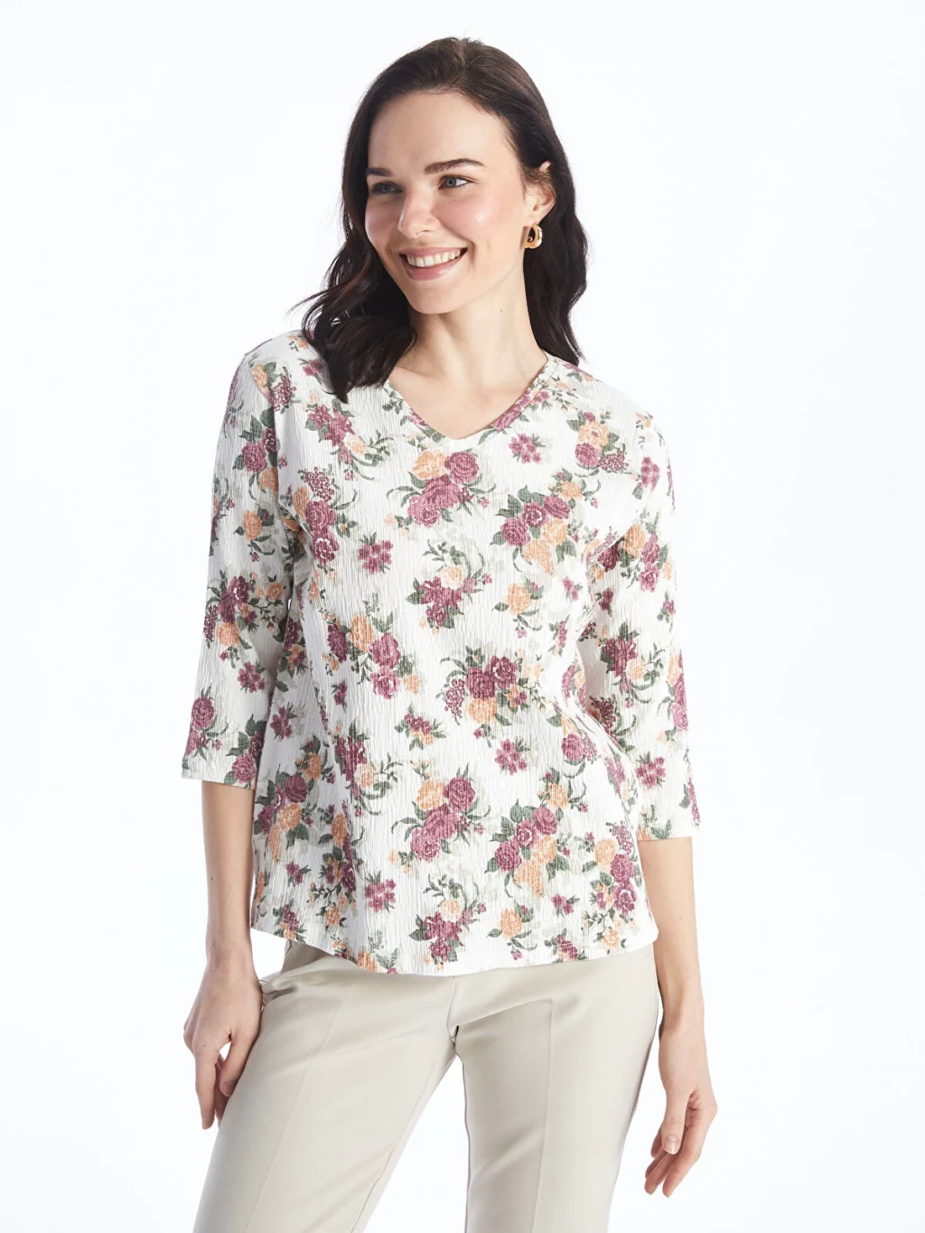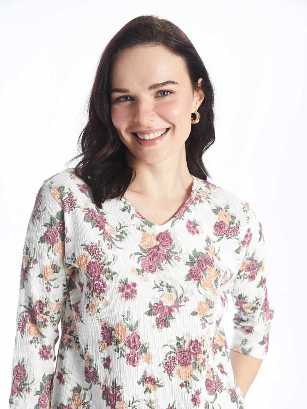 V yaka çiçekli bluz, pamuk karışımlı elyaftan üretilmiştir. Yumuşak yapısı ile cildinize nazikçe bir dokunuş ve konforlu bir giyim deneyimi sunar. 3/4 kol boyu ile mevsim geçişlerinde tercih edebileceğiniz şık bir parçadır.
