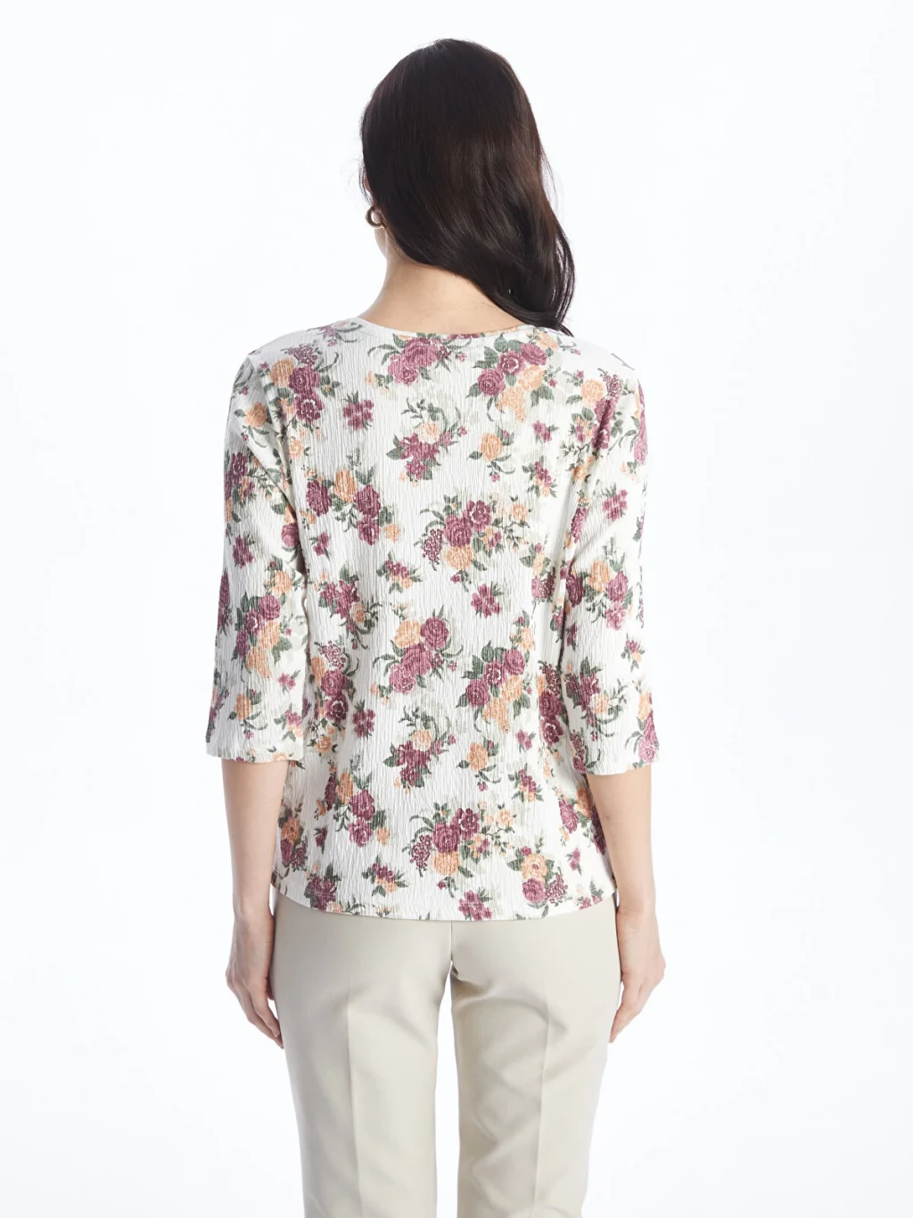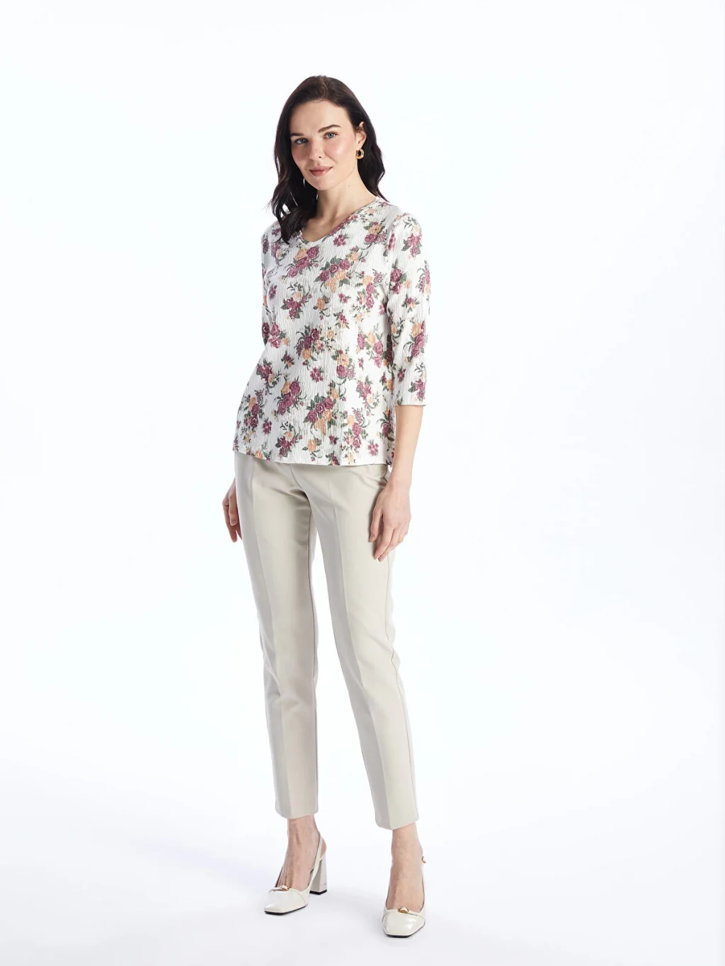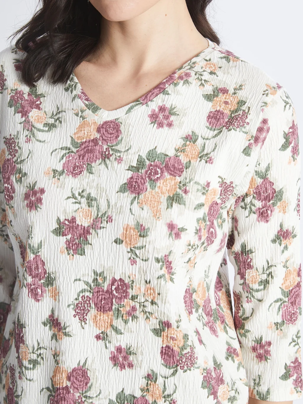 V yaka çiçekli bluz, pamuk karışımlı elyaftan üretilmiştir. Yumuşak yapısı ile cildinize nazikçe bir dokunuş ve konforlu bir giyim deneyimi sunar. 3/4 kol boyu ile mevsim geçişlerinde tercih edebileceğiniz şık bir parçadır.