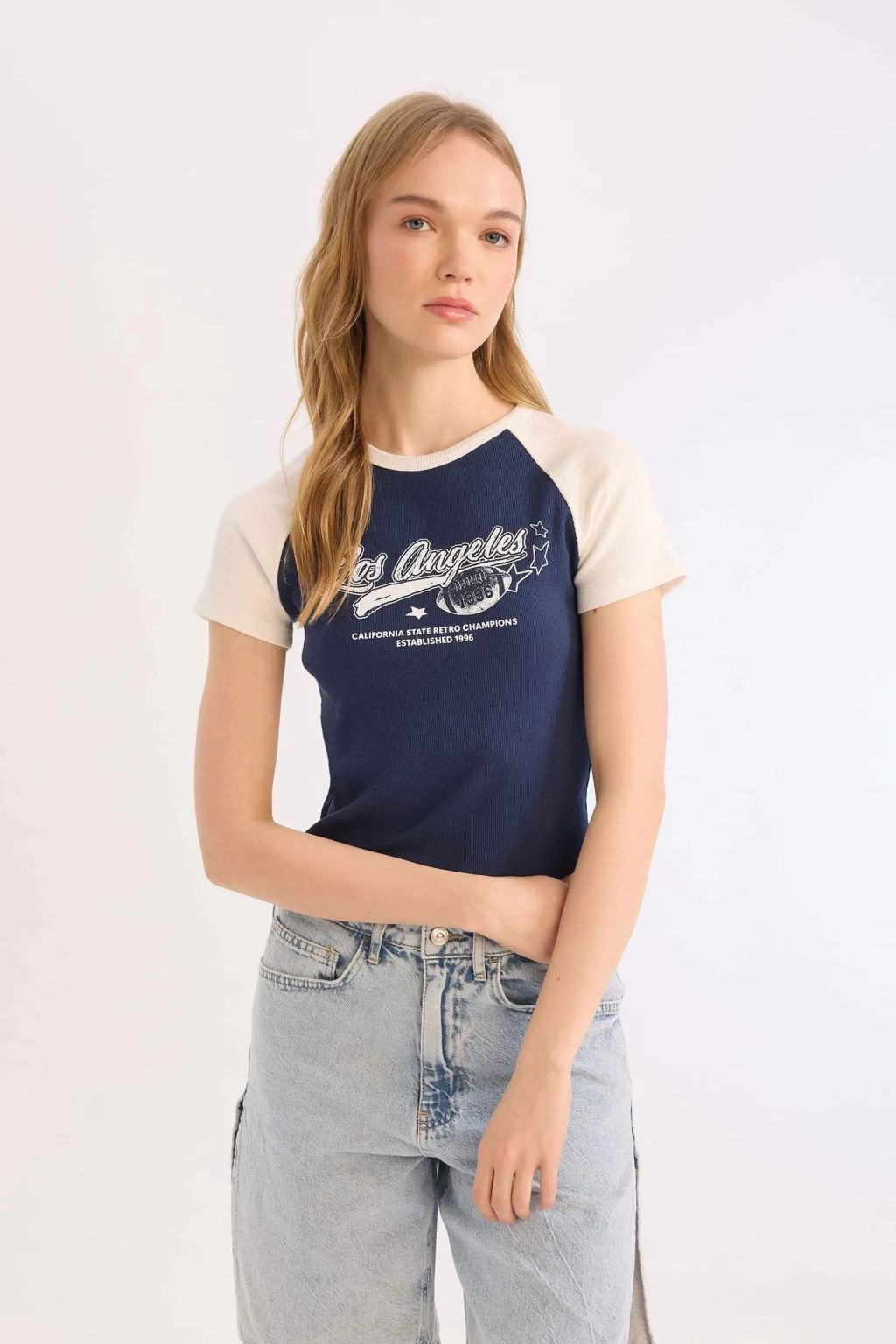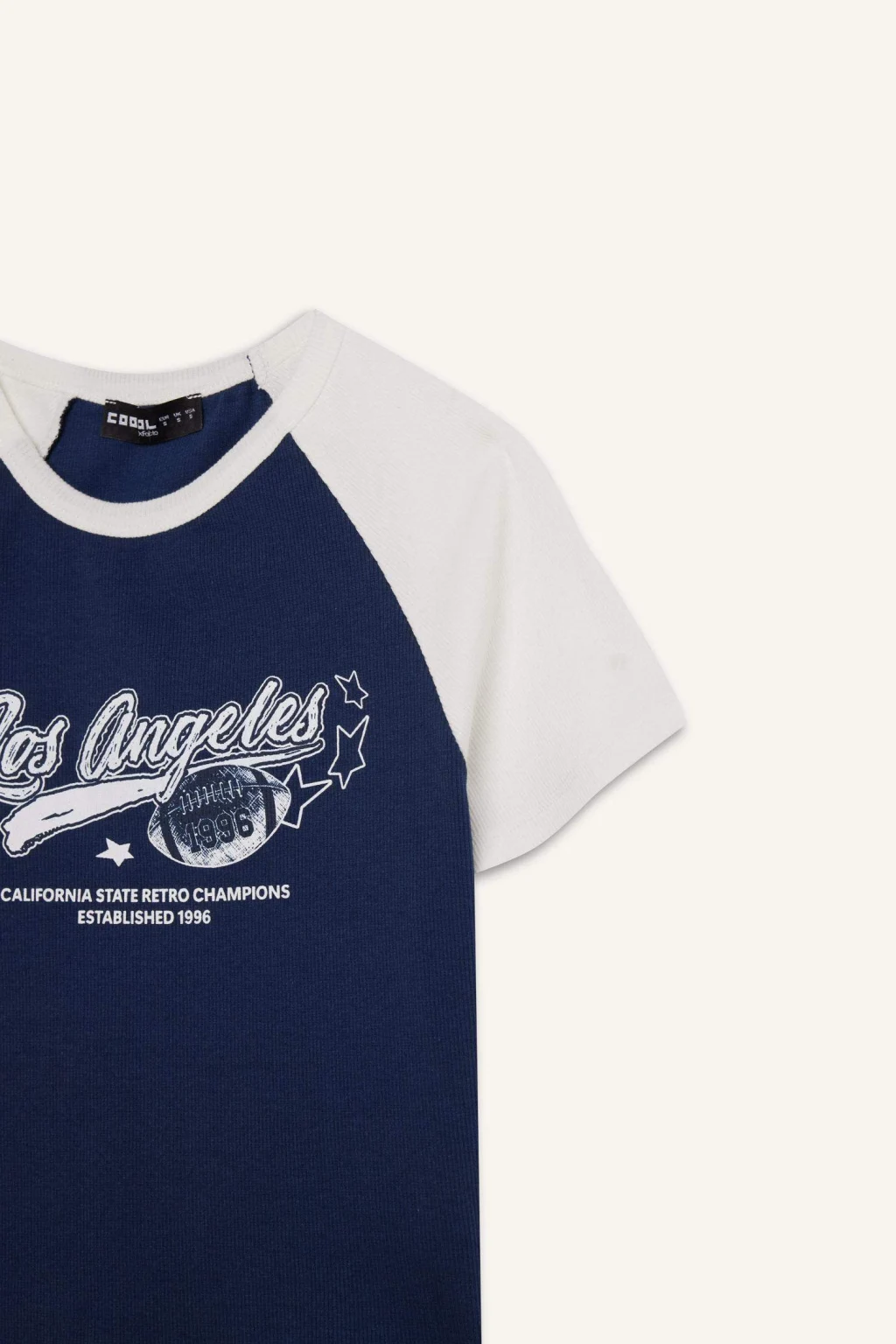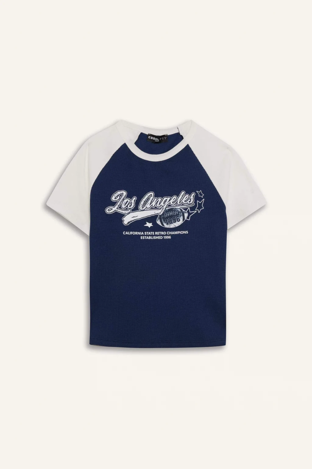 Yetişkin kadınlar için Coool marka kolej desenli lacivert kısa kollu tişört. Fitted kalıbı ve fitilli kaşkorse kumaşıyla şık ve rahat bir seçenek. Reglan kollu detayı ve bisiklet yaka tasarımıyla öne çıkıyor. İlkbahar/Yaz sezonu için sürdürülebilir bir seçim.