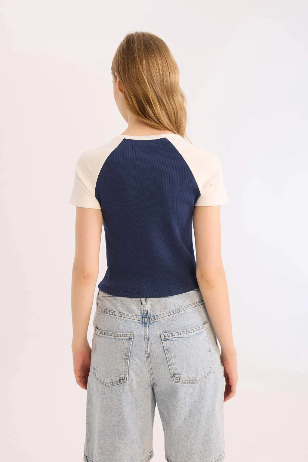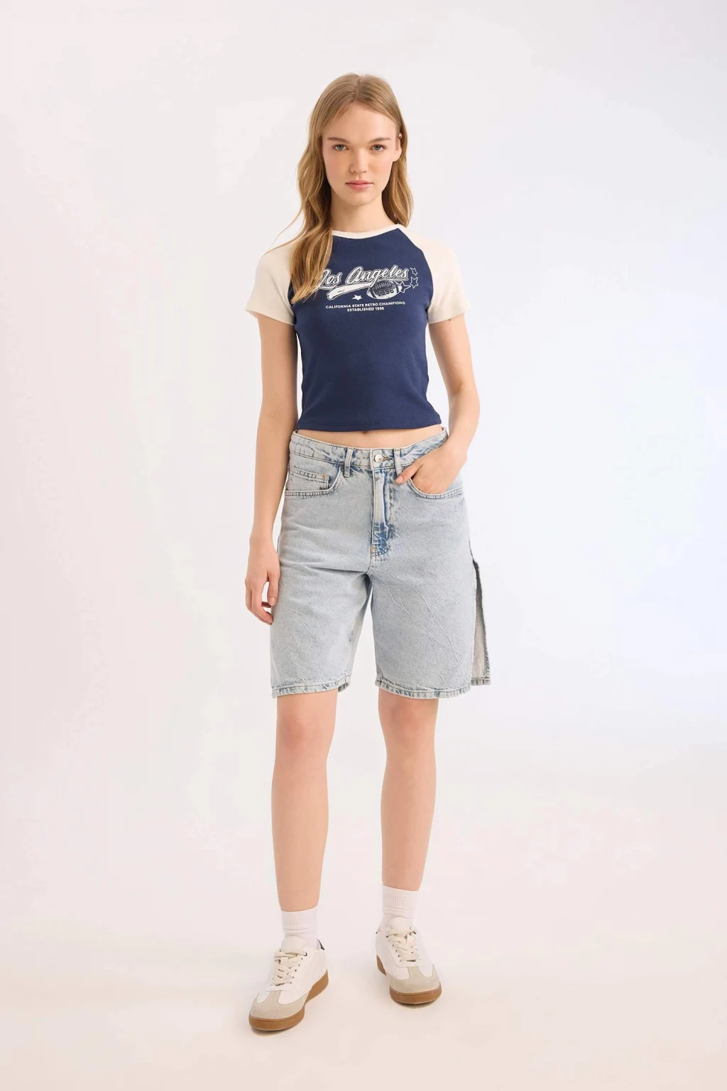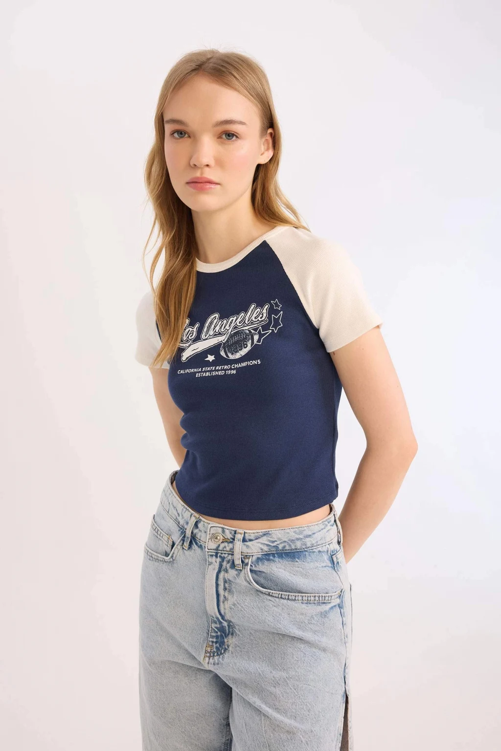 Yetişkin kadınlar için Coool marka kolej desenli lacivert kısa kollu tişört. Fitted kalıbı ve fitilli kaşkorse kumaşıyla şık ve rahat bir seçenek. Reglan kollu detayı ve bisiklet yaka tasarımıyla öne çıkıyor. İlkbahar/Yaz sezonu için sürdürülebilir bir seçim.