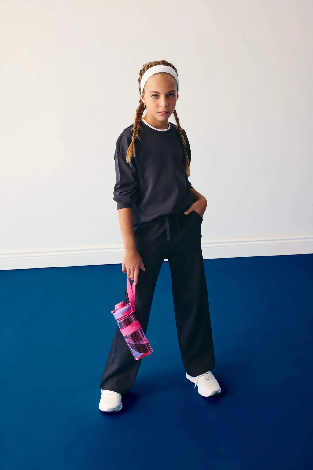 Kız çocuklar için beli lastikli wide leg eşofman altı, geniş paça tasarımı ve yumuşak kumaşıyla gün boyu rahatlık sunar. Hem spor hem günlük kombinler için ideal bir parçadır.