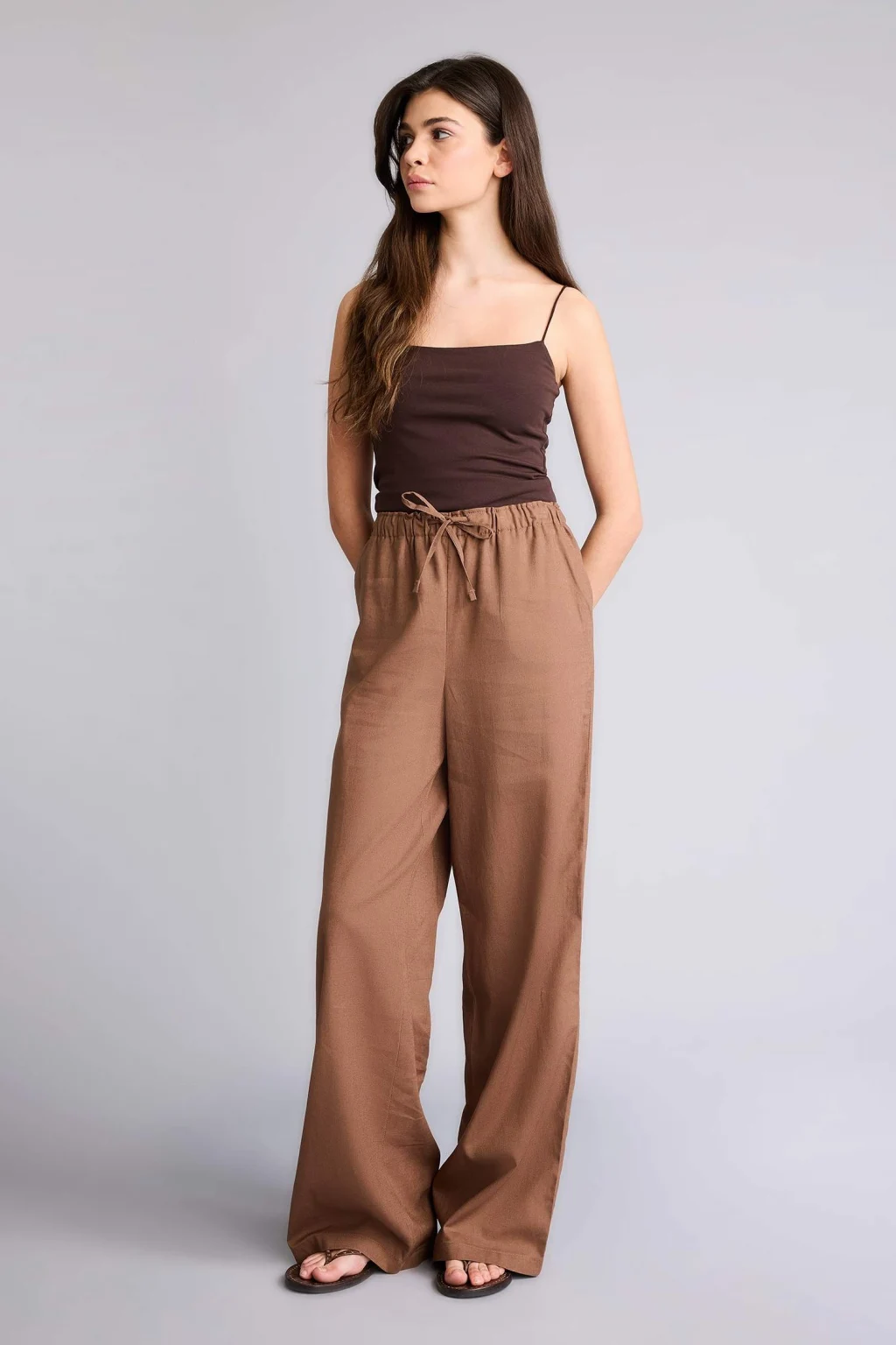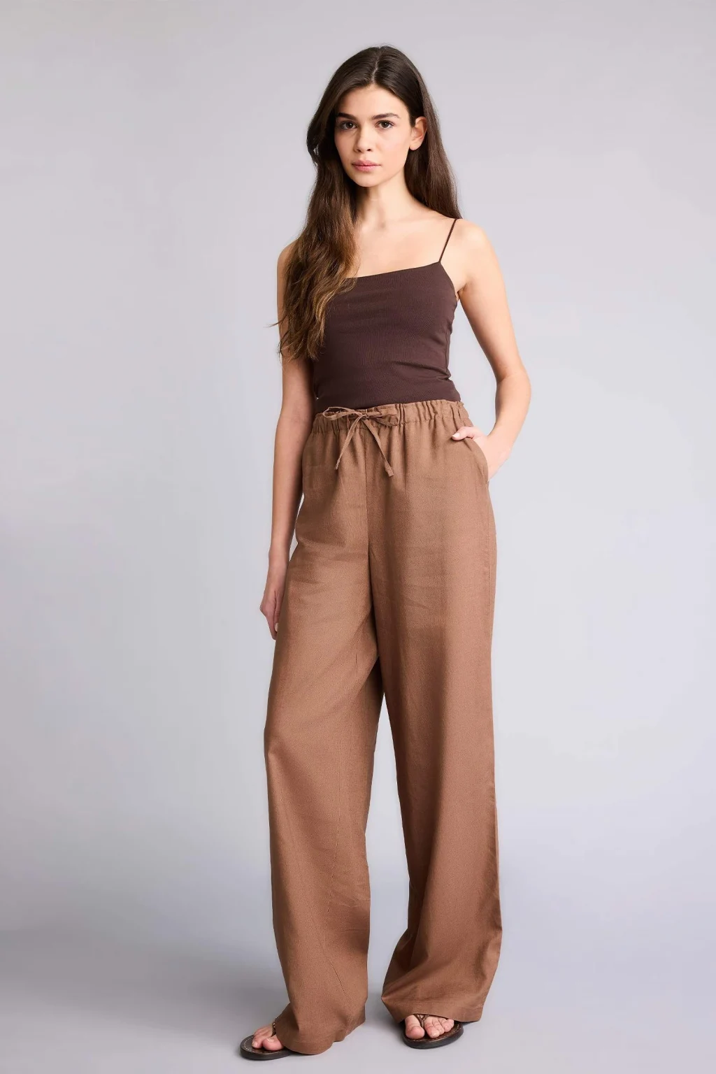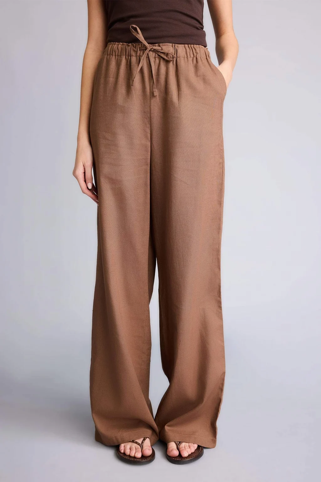 Defacto E1981AXBN534 Kahve Wıde Leg Çift Cepli Beli Lastikli Standart Boy Keten Karışımlı Pantolon