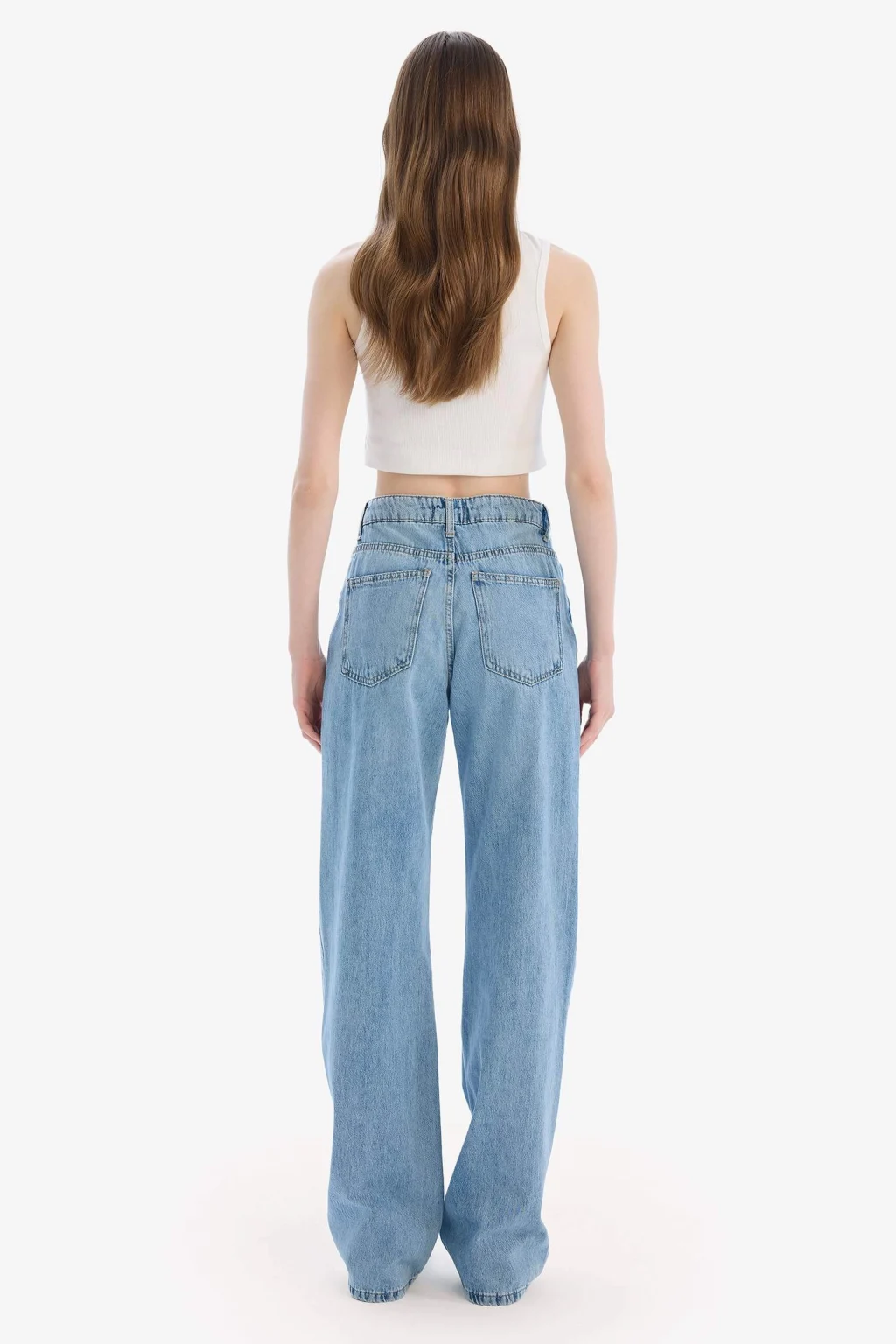 Yüksek bel, düz geniş kesimli mavi jean pantolon. Yetişkin kadınlar için ilkbahar/yaz koleksiyonunda yer alan sürdürülebilir bir ürün. Uzun boyu ve yıkamalı özelliği ile temel bir parça.