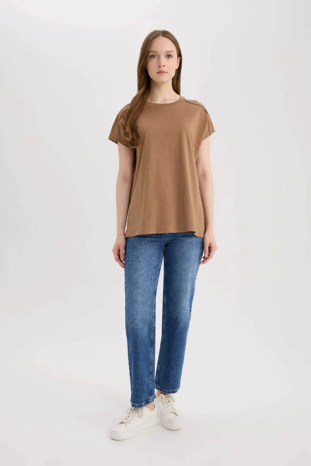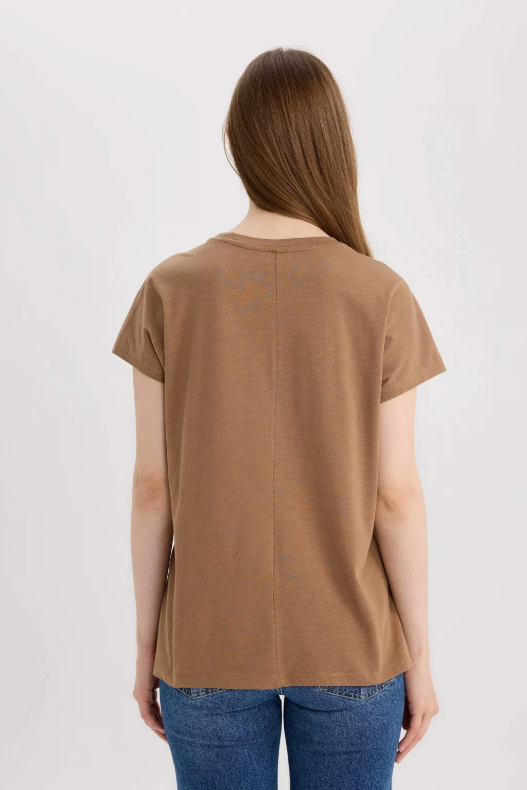 Yetişkin kadınlar için özel olarak tasarlanmış, kısa kollu tişört. Flamlı pamuk kumaştan üretilmiş, dantel detaylarıyla şık bir görünüm sunar. Kahverengi renkte ve Traditional markasının baskılı koleksiyonundan. İlkbahar/Yaz sezonu için ideal bir seçim. Bisiklet yaka ve yarasa kol detaylarıyla dikkat çeker.