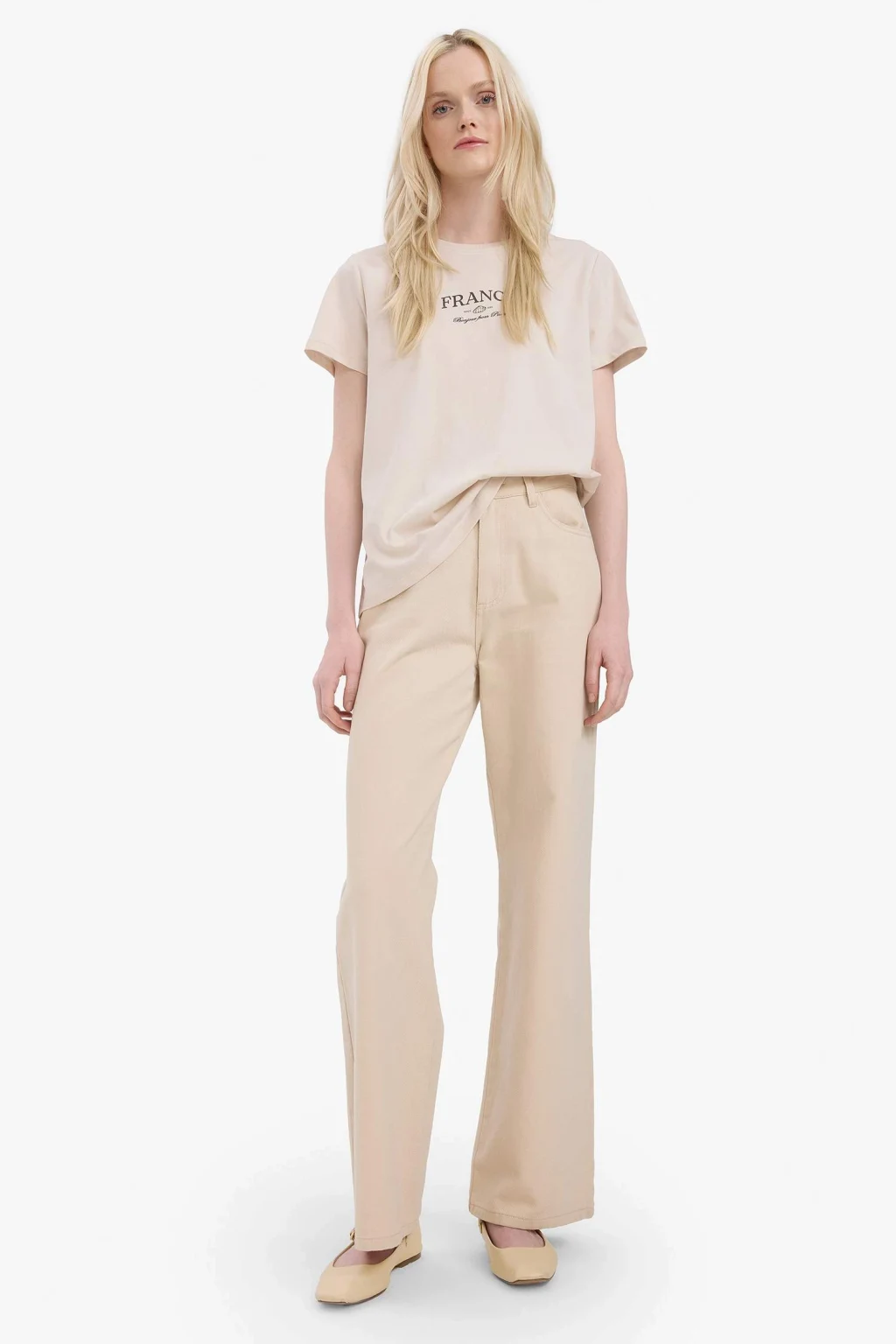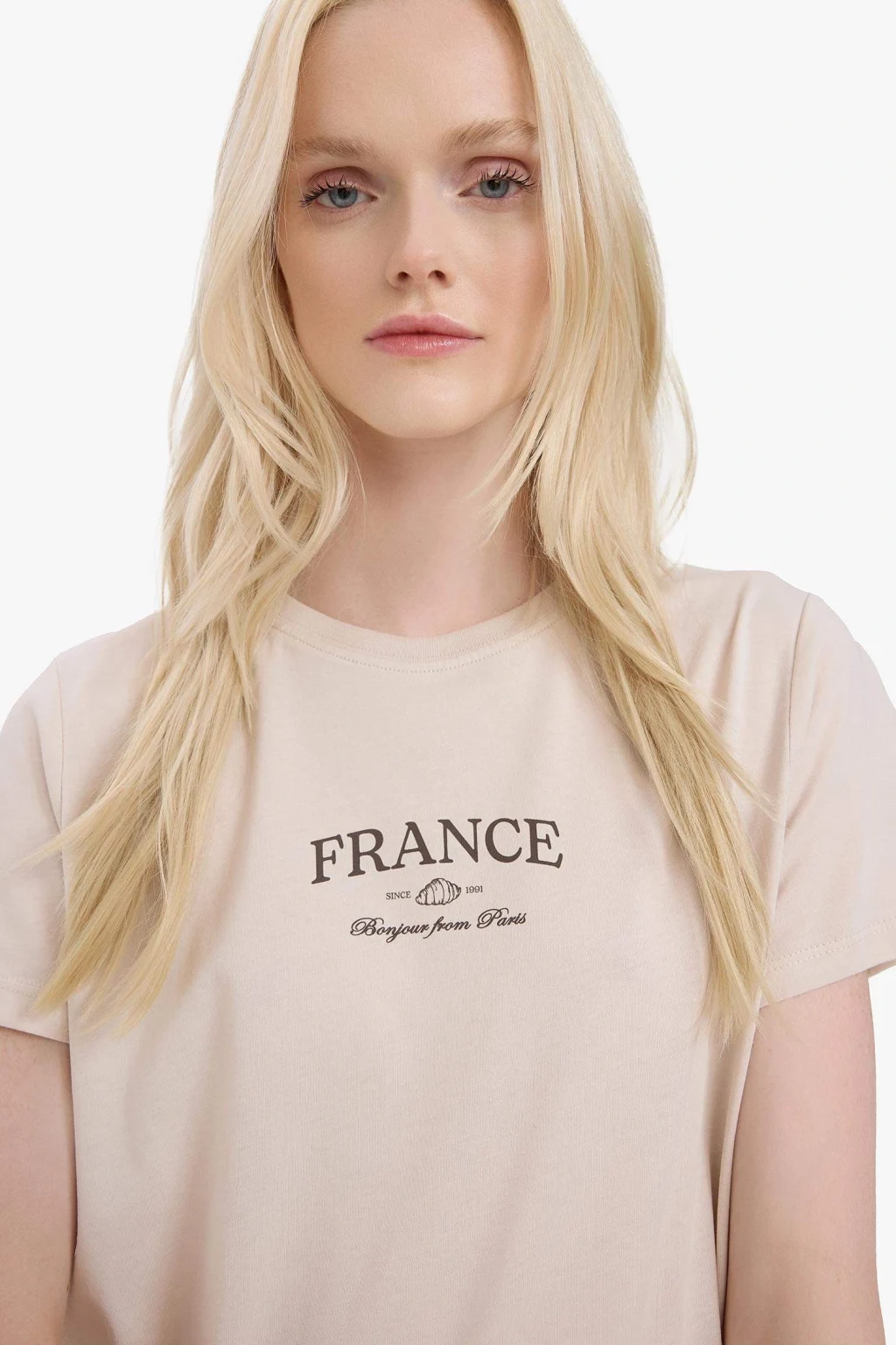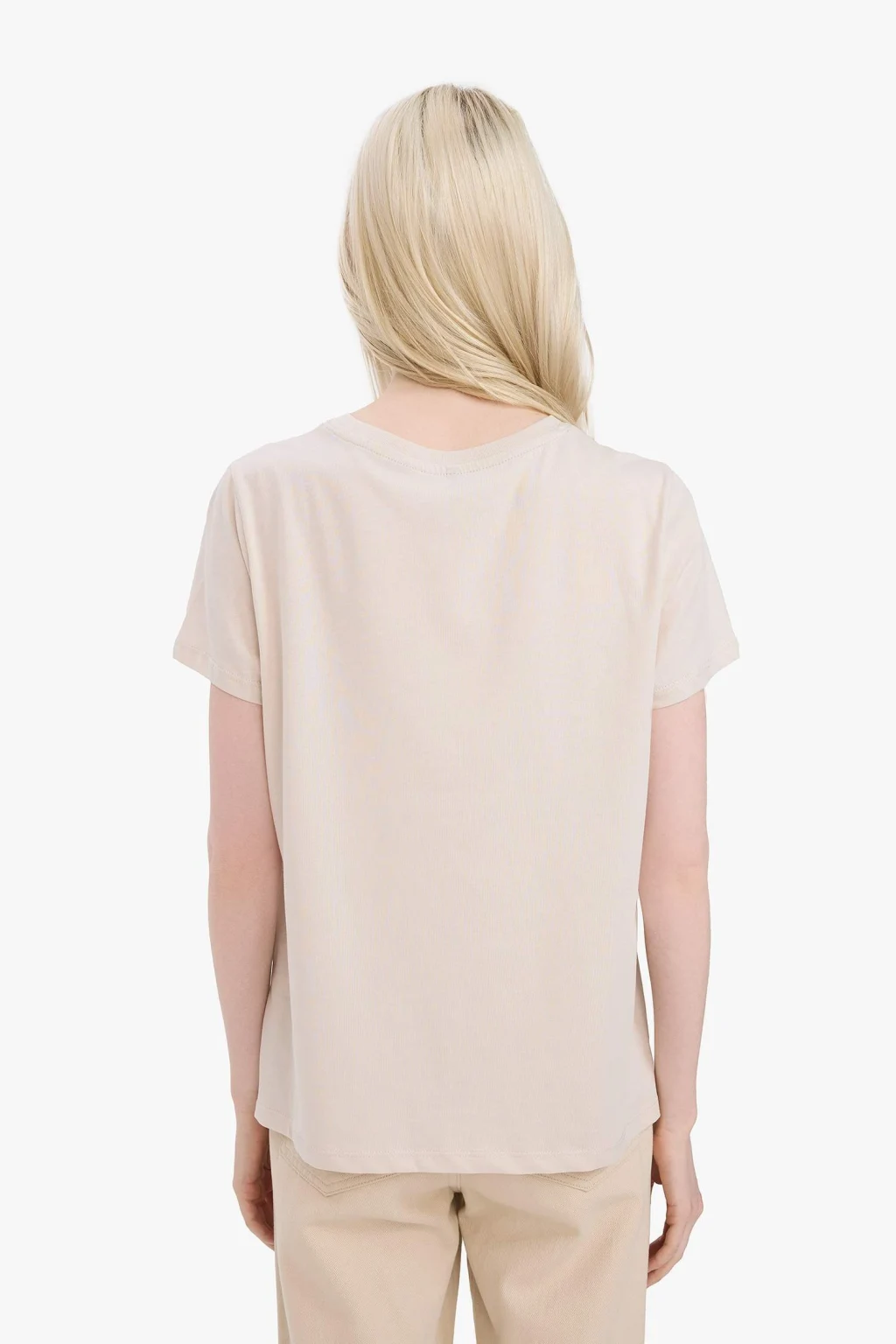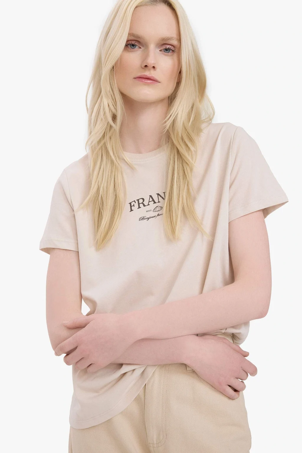 Yetişkin kadınlar için örme, slogan baskılı ve relax fit kesimli tişört. Ekru renkli, sürdürülebilir penye kumaştan üretilmiştir. İlkbahar/Yaz sezonu için ideal olan bu tişört, bisiklet yaka detayına sahiptir.