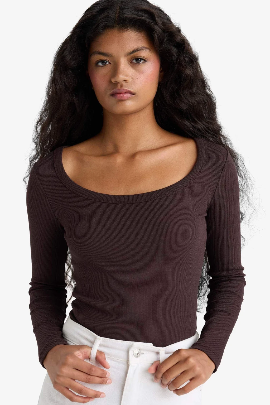 Defacto E5768 Kahve Slim Fit Dar Kesim Yuvarlak Yaka Basic Düz Fitilli Kaşkorse Uzun Kollu Tişört