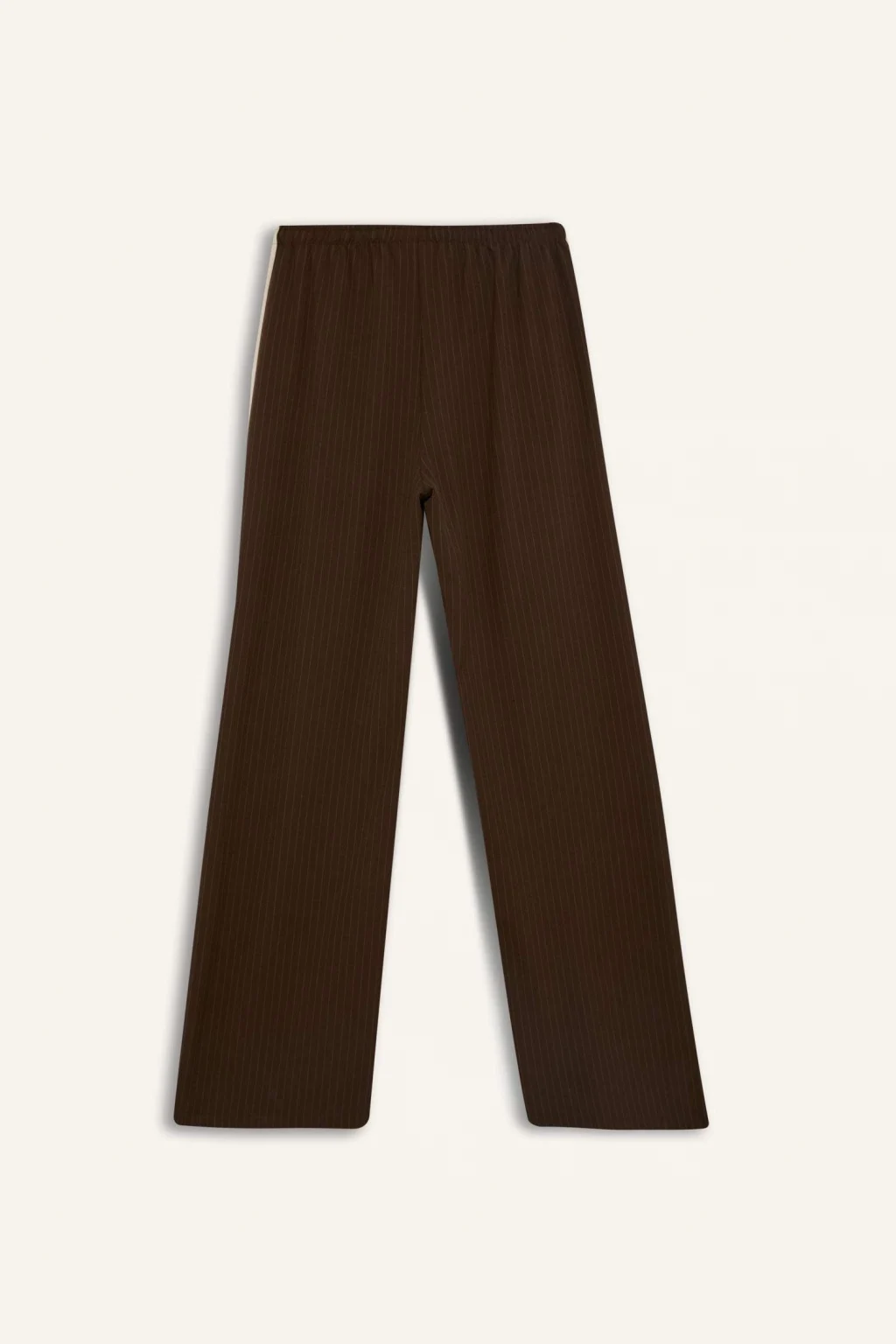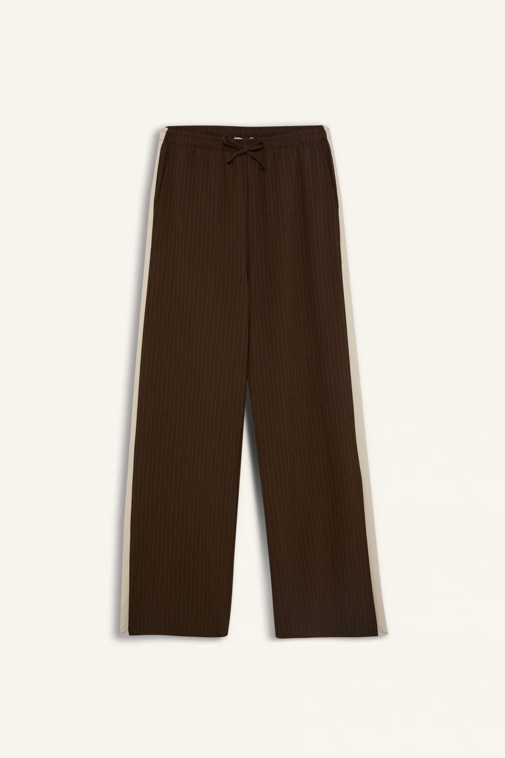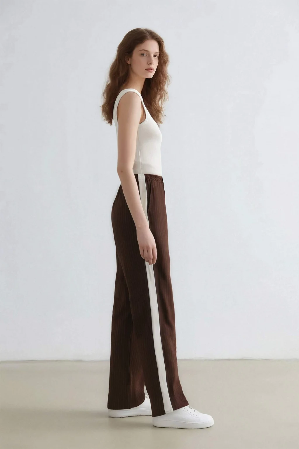 Bu Coool markasına ait geniş paça dokuma pantolon, normal bel detayı ve çizgili deseniyle şıklığınızı tamamlar. Rahat lastikli kapama detayı sayesinde kalıbıyla da dikkat çeker. Kahve rengiyle hem şık hem de günlük kullanıma uygun. İlkbahar/Yaz koleksiyonunun temel parçalarından biri.