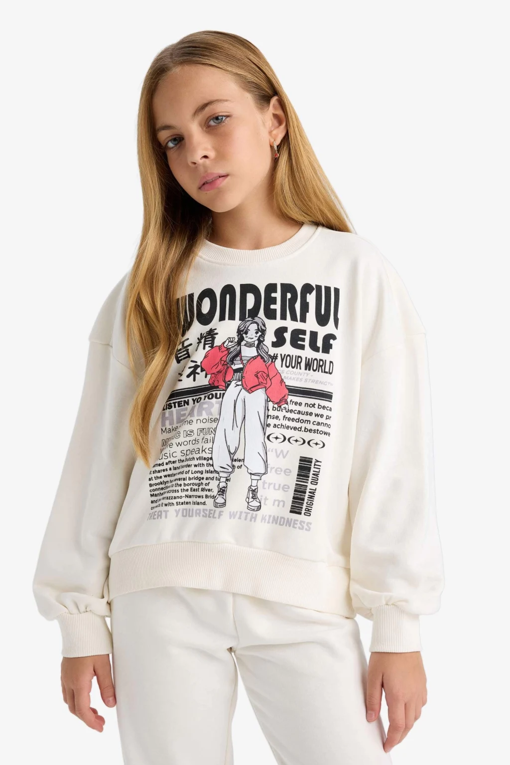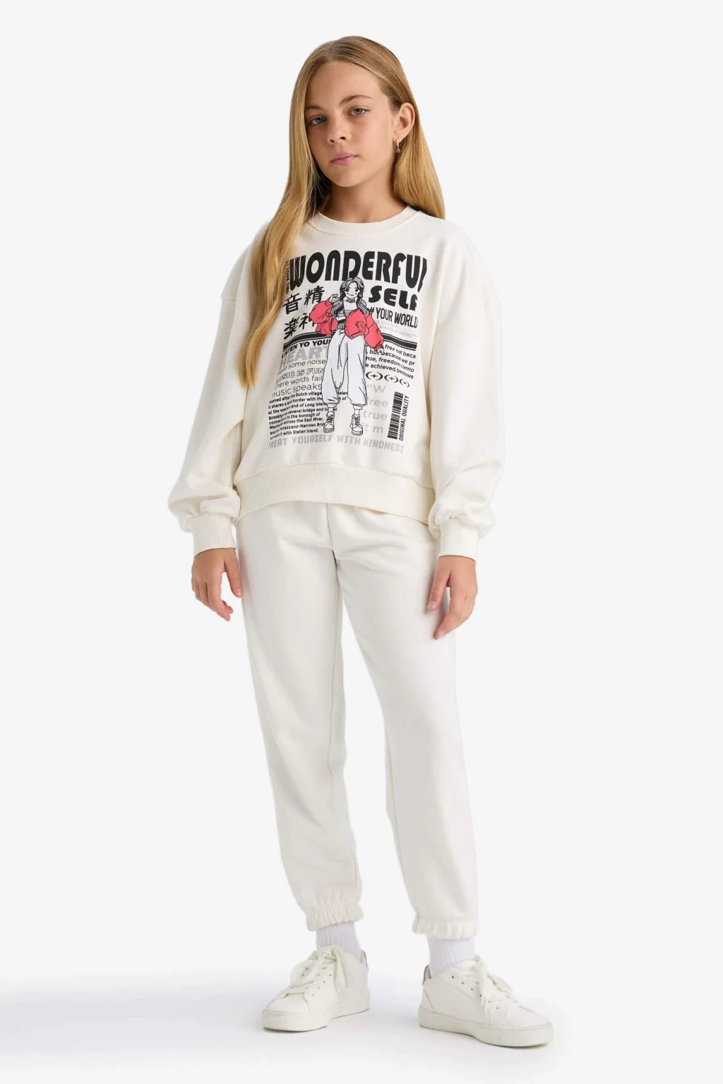 Defacto E6416A8ER105 Ekru Kız Çocuk 2'li Takım Baskılı Sweatshirt Eşofman Altı