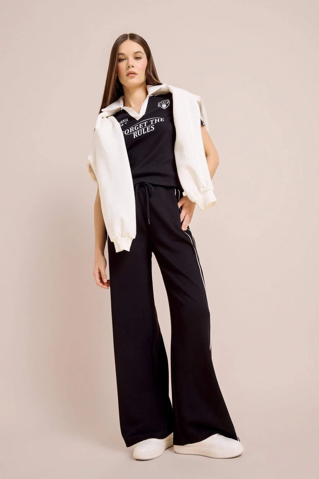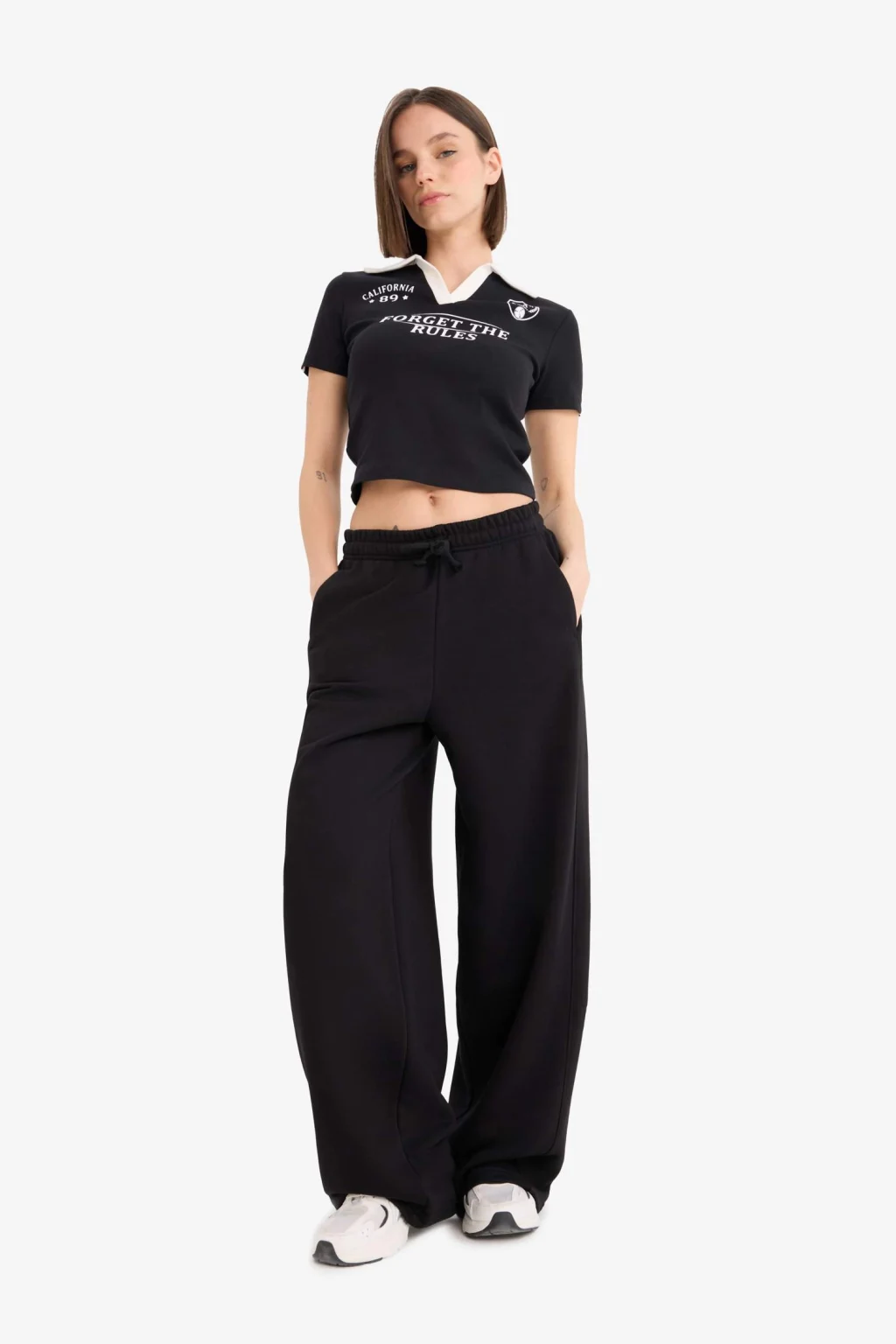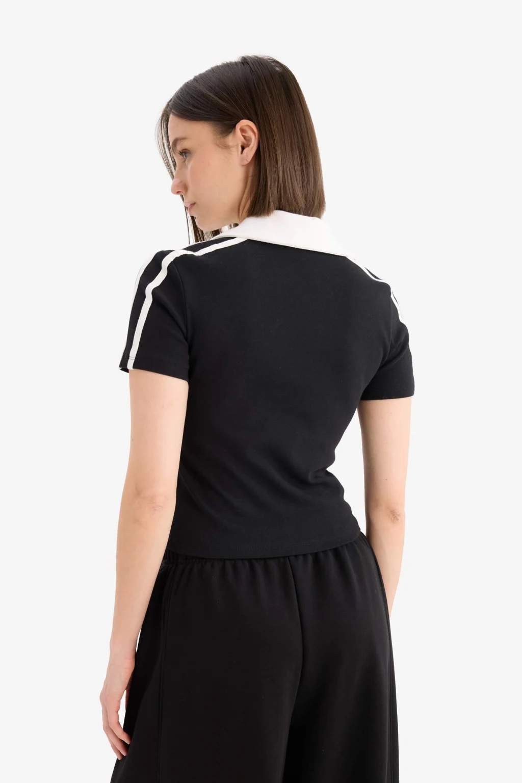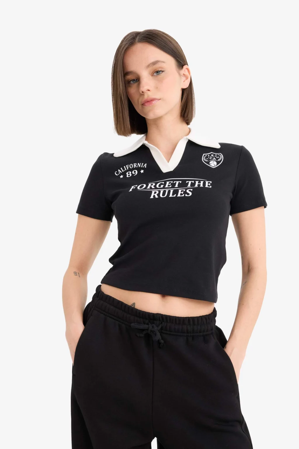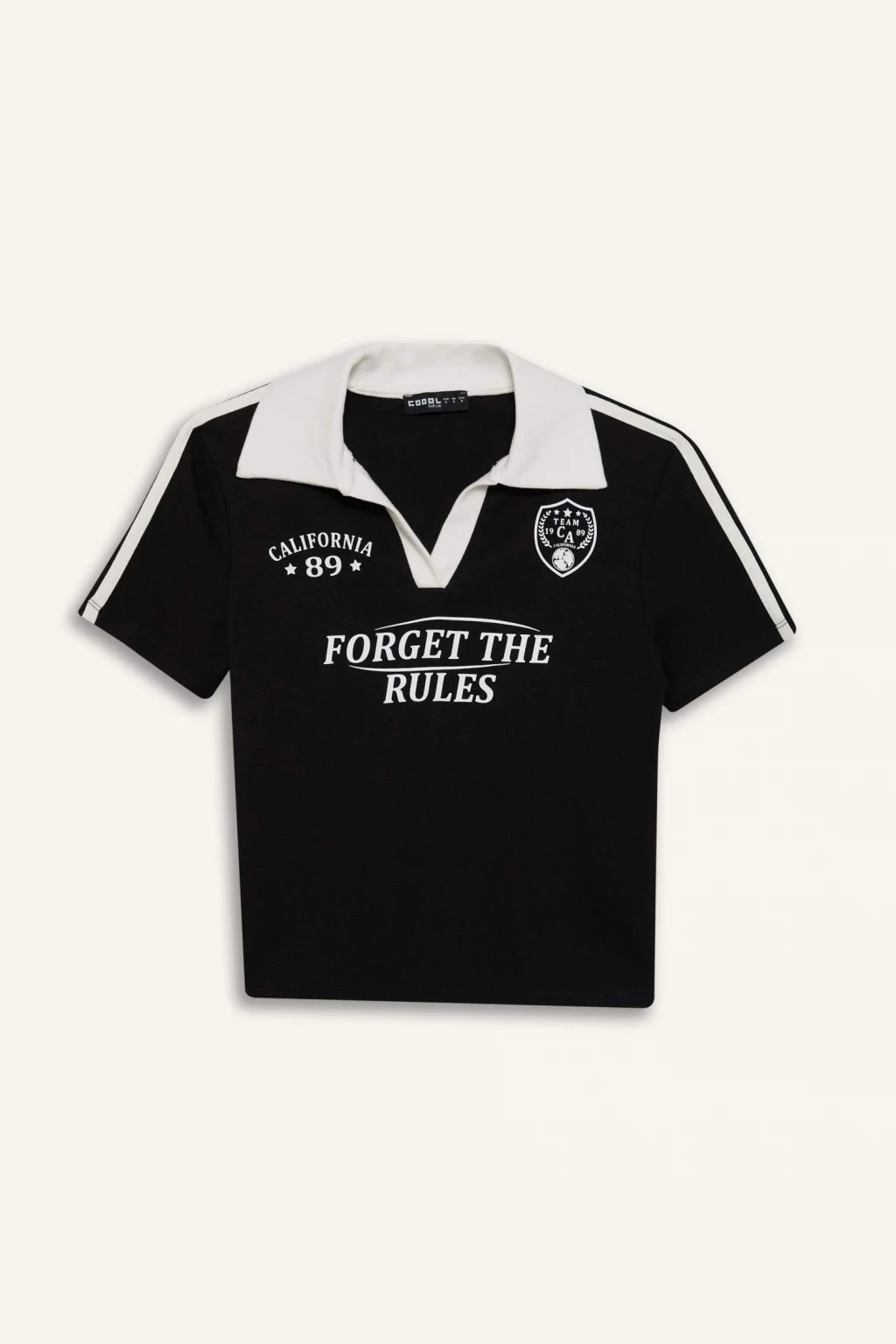 Coool markasına ait siyah renkli, baskılı kısa kollu tişört. Ribana kumaştan üretilmiş, spor tema desenli ve polo yaka detayına sahip. Yetişkin kadınlar için ideal İlkbahar/Yaz koleksiyonu parçası. Fitted kesime sahip ürün, crop üst beden boyu ile dikkat çekiyor.