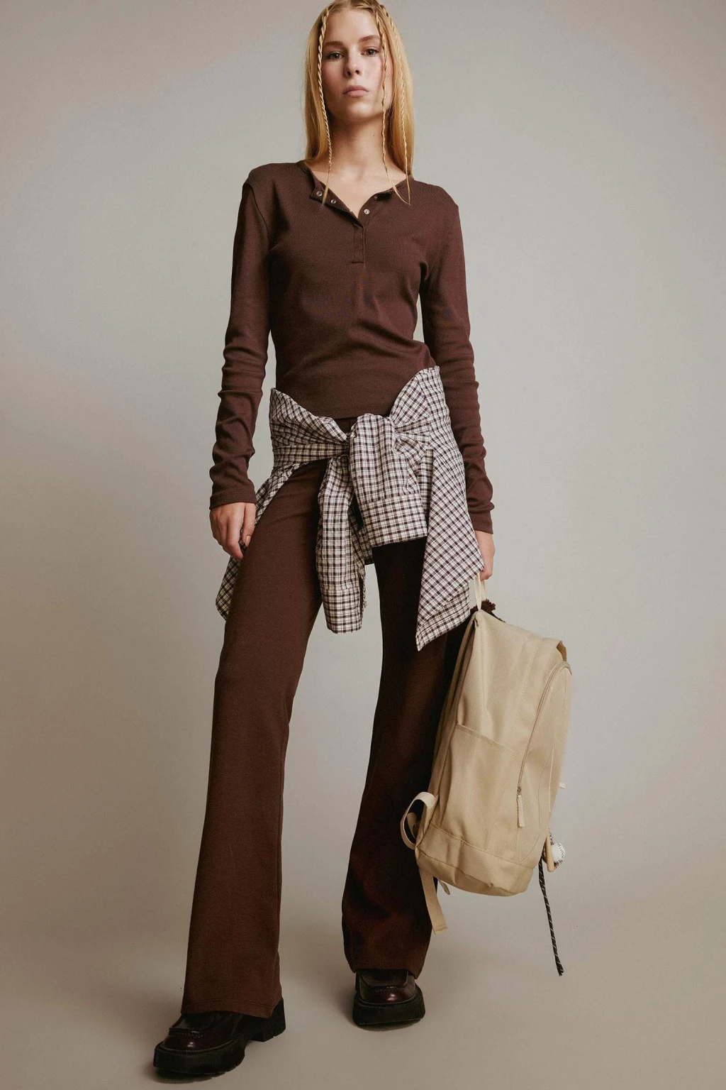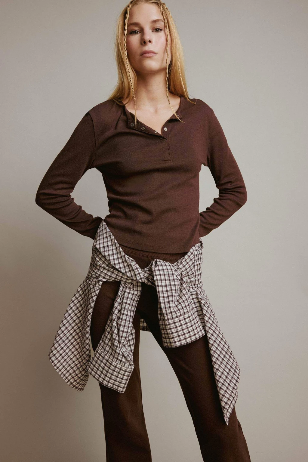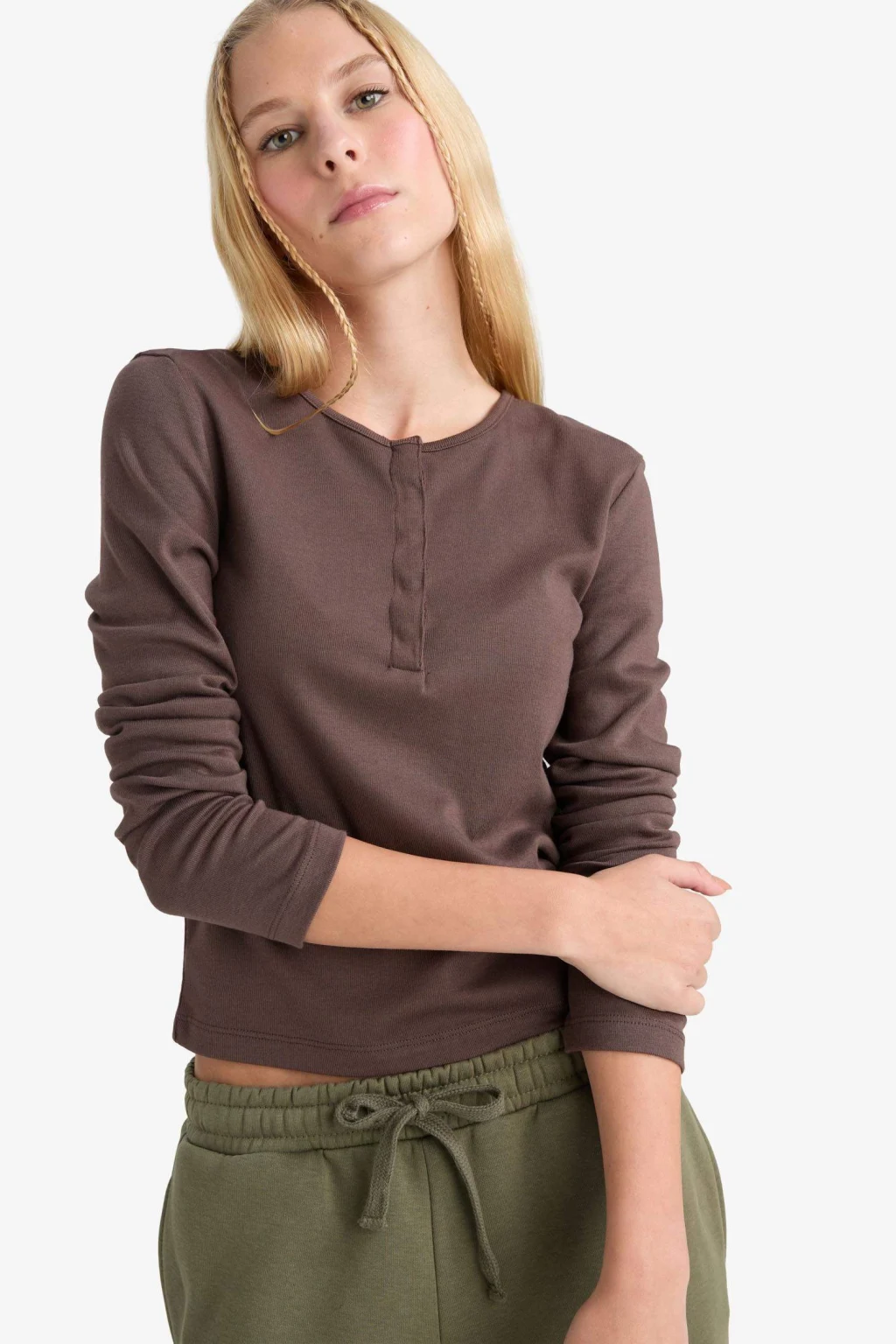 Defacto E7680 Kahve Coool Fitted Düğmeli Yaka Ribana Uzun Kollu Tişört