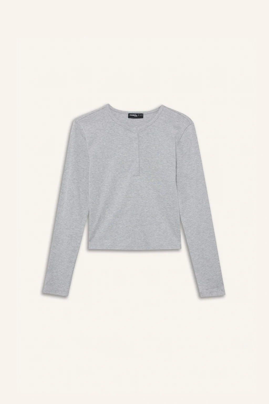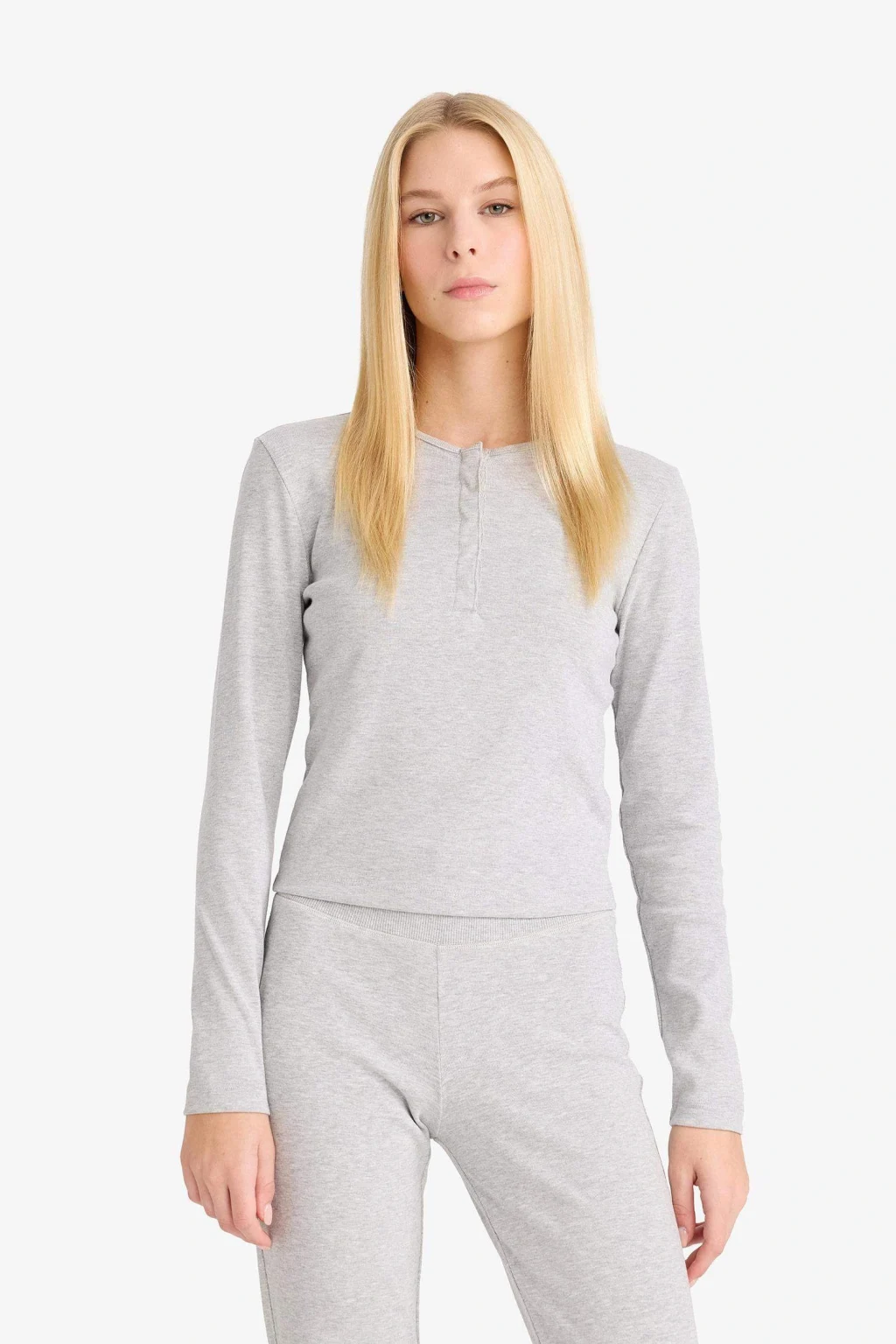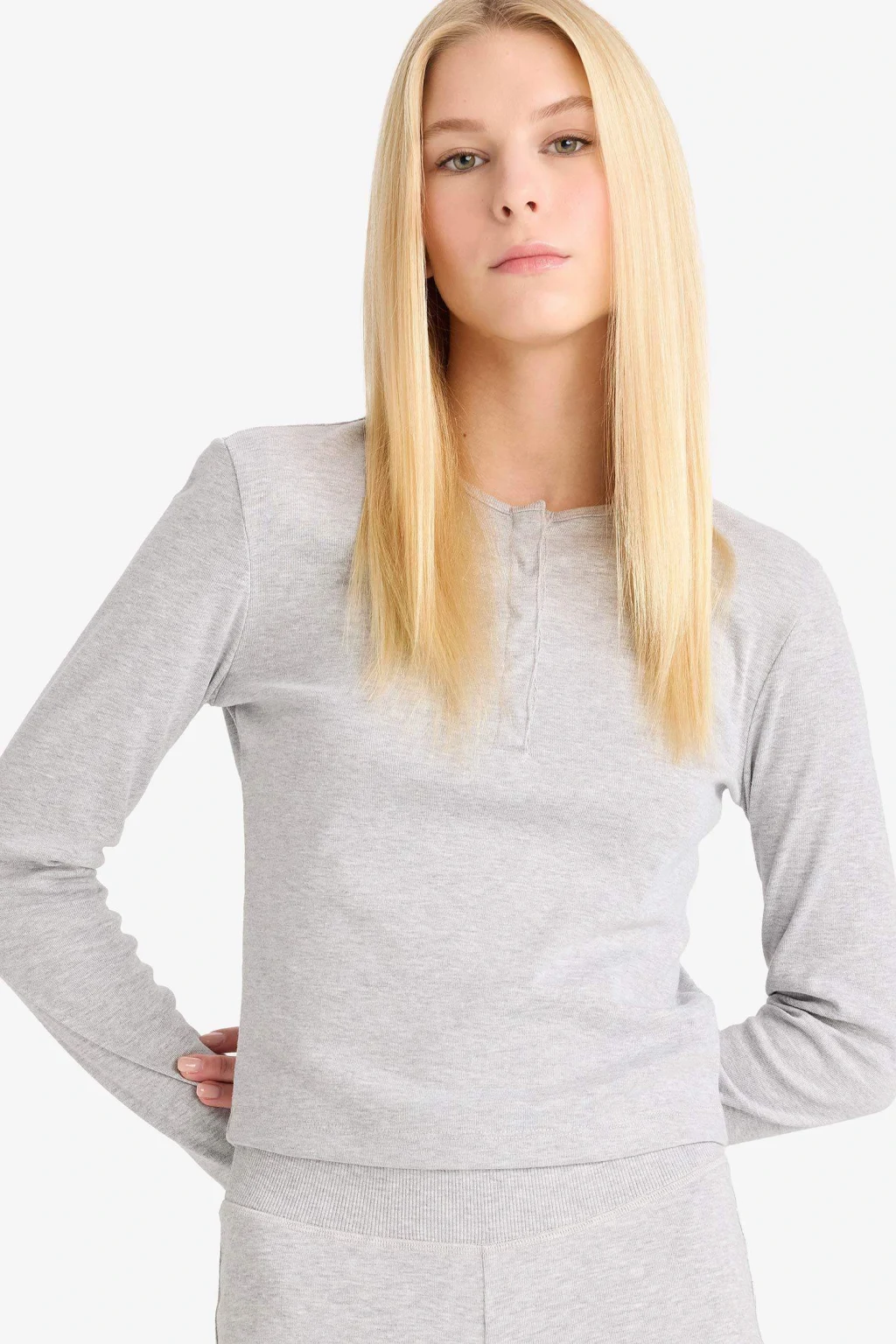 Defacto E7680 Gri Coool Fitted Düğmeli Yaka Ribana Uzun Kollu Tişört