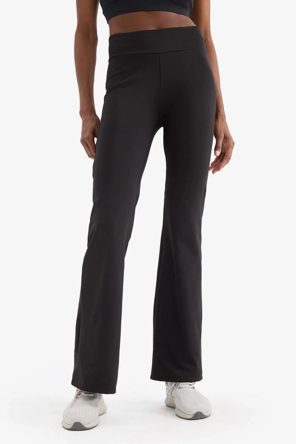 Flare fit kesimi ve toparlayıcı yüksek beliyle bu sporcu pantolon, şık bir siluet ve destekleyici kullanım sunar. Esnek ve rahat kumaşıyla antrenman ve günlük sporlar için idealdir.