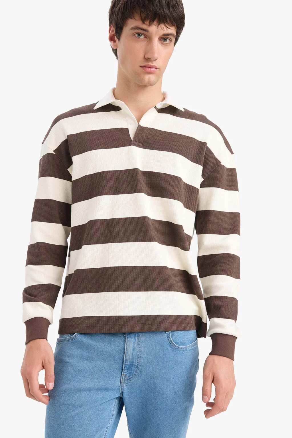 Boxy fit polo yaka çizgili waffle sweatshirt, rahat kesimi ve dokulu waffle kumaşıyla konforlu bir stil sunar. Çizgili deseni ve polo yaka detayıyla şıklığı günlük kullanıma taşır.