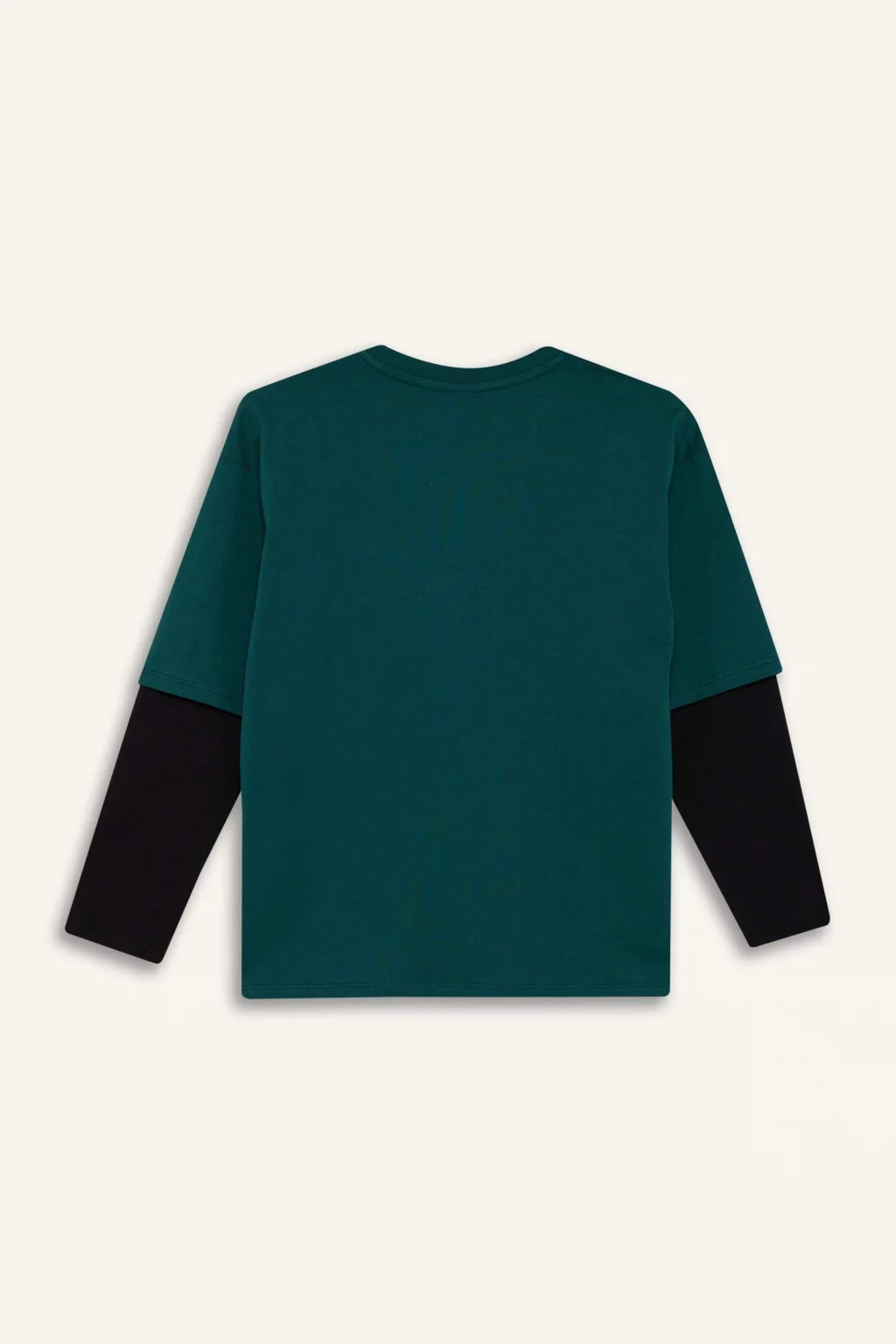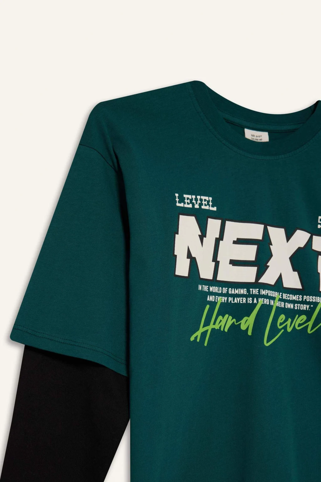 Defacto E9589 Yeşil Erkek Çocuk Oversize Geniş Kalıp Bisiklet Yaka Baskılı Uzun Kollu Tişört